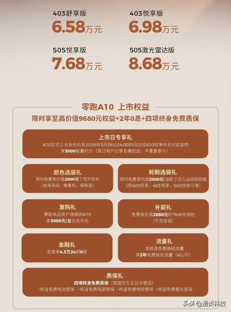 刚刚才看到,有点后知后觉了,零跑A10把激光雷达车型带到了8万元价位,并且还是505续航的。你让两年前11万入手比亚迪海豚405km版本的同事怎么看?妥妥的不讲武德啊。新能源更新换代太快了,就和手机一样,没有点降价承受力,还真不敢出手呢。