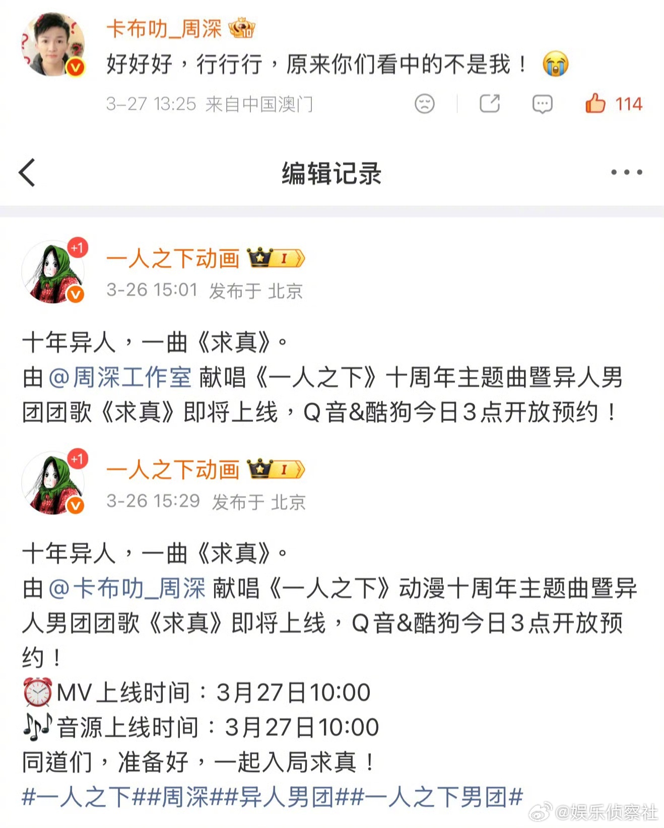 周深说原来你们看中的不是我、周深回应工作室出道周深就这样小发雷霆的撒娇!周深手滑将演唱者艾特了“周深工作室”,周深工作室:我吗?我出道吗?周深网速超快空降评论区,委屈巴巴留下一句:“好好好,行行行,原来你们看中的不是我!” 周深工作室:不敢说话🙊就这样用萌萌的语气缓解了尴尬场面,谁能不爱小醋包周深!周深回应工作室出道,好有梗!