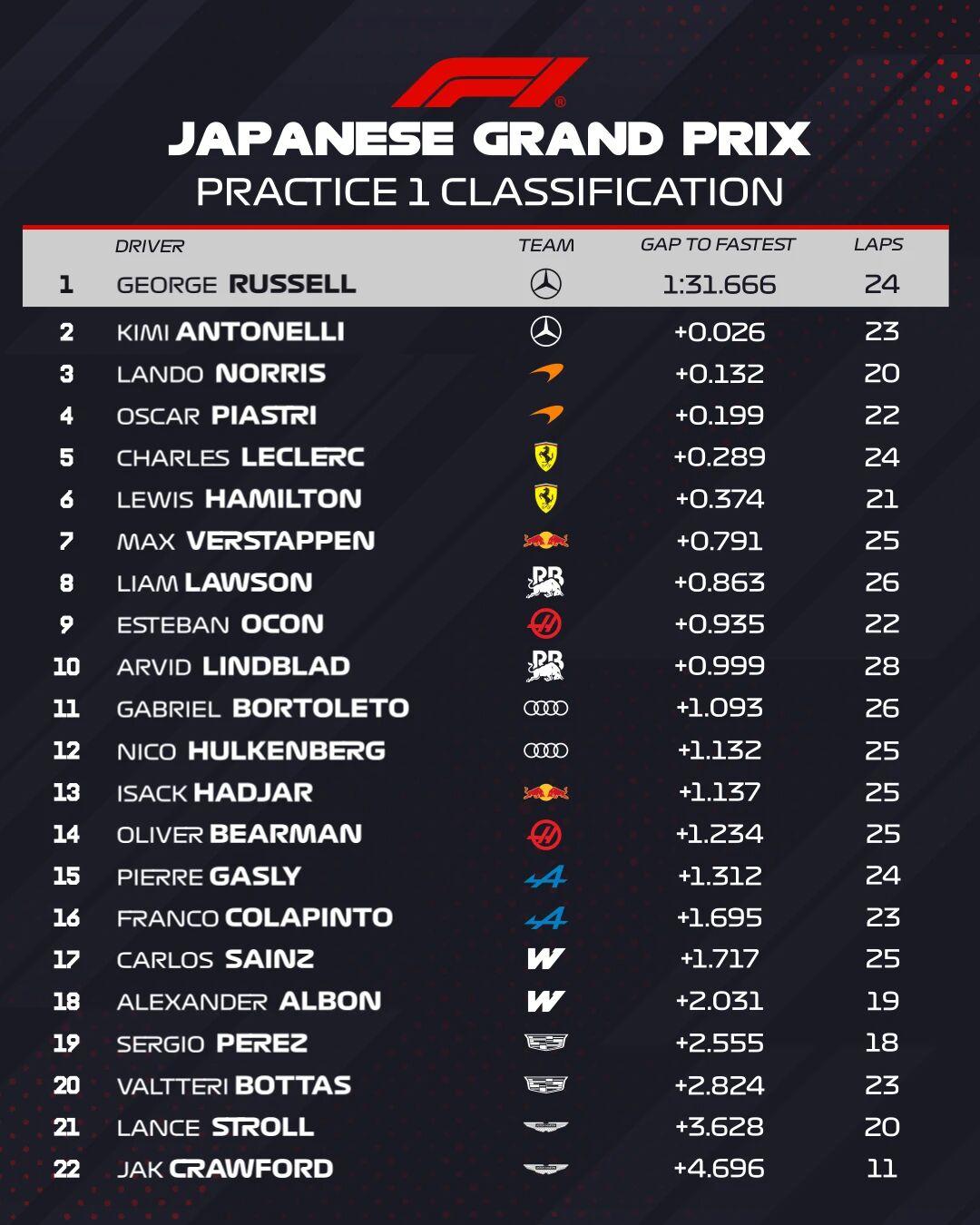 铃鹿一练:梅奔依旧领跑,汤勺弯成“事故高发区” F1日本站一练刚结束,梅赛德斯还是那副“不演了”的架势。拉塞尔全场最快,安东内利第二,诺里斯和皮亚斯特里分列三四,法拉利双雄第五第六。 但今天真正抢镜的不是成绩单,是汤勺弯。勒克莱尔、劳森、林德布拉德、拉塞尔、诺里斯——一个接一个在那儿冲出去。有人压路肩太狠,有人出弯给油早了,反正就是过不去。铃鹿的高速复合弯对赛车的平衡要求极高,一练大家都还在找感觉,失误多也正常。 梅奔的优势在长距离,排位赛单圈谁更强还不一定。法拉利得抓紧二练把调校收一收,别光顾着追圈速,先把弯道走顺了再说。铃鹿这赛道,跑得稳比跑得快重要。【来自懂车帝车友圈】