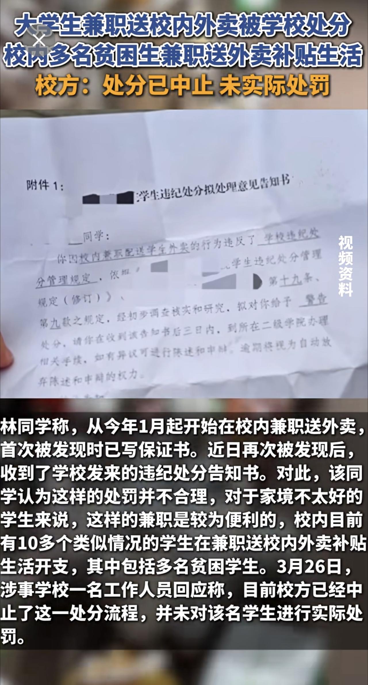 大学生兼职送校内外卖被处分,学校回应:未实际处罚。(来源:现代快报) 大学生 外