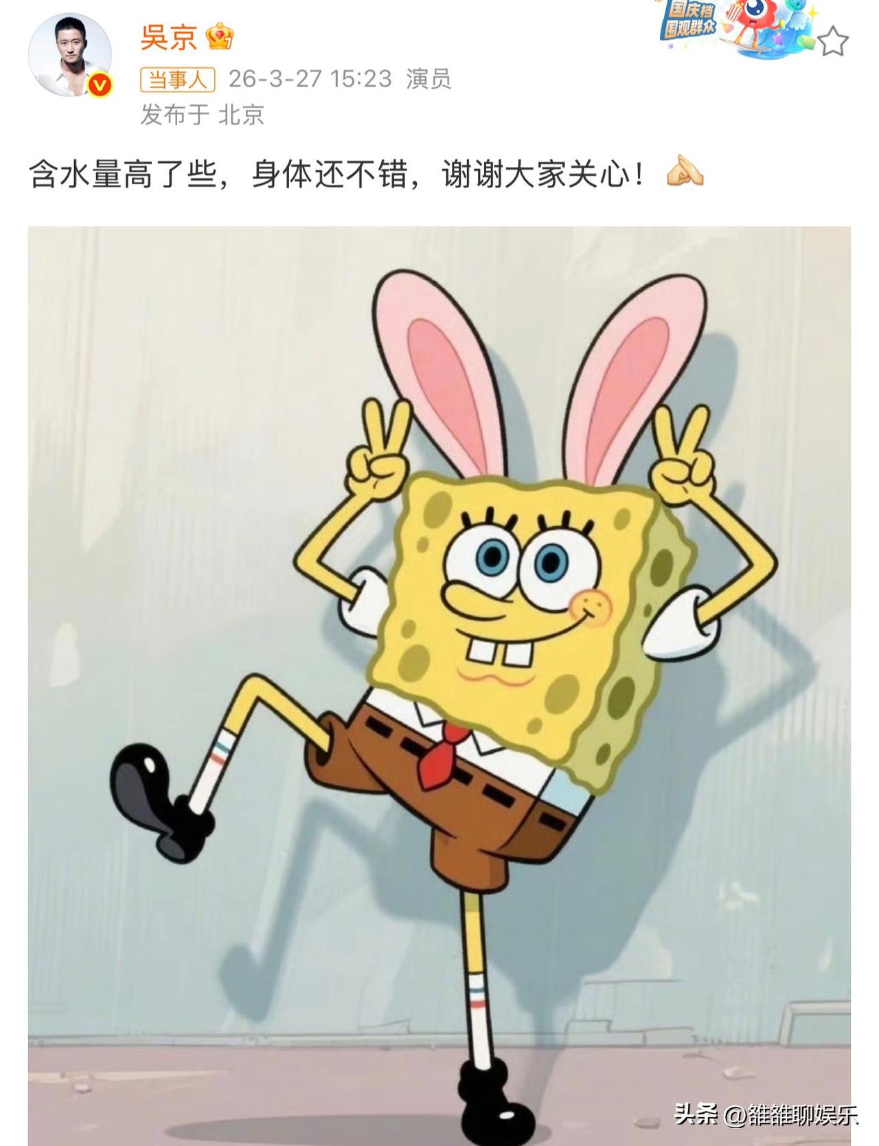 吴京,高调发文回应。 3月26日下午,吴京在社交平台发文,短短一句话,回应了大家的关心,瞬间引发无数网友的热议。 他发文说: “含水量高了些,身体还不错,谢谢大家关心。” 用幽默的方式回应了大家说他水肿的事。 近日,他和《镖人》剧组在北京电影学院参加放映交流活动,被网友拍到,他用手指头把脸颊按压了一个坑,手指头放下来时,脸上那个坑回弹的很慢。 网友纷纷表示从医学角度来说,这属于“凹陷性水肿”,是由高强度工作、疲劳导致的水盐代谢紊乱,希望他能去看看。 对于网友的关心,吴京内心很开心,所以他发文向大家报了平安。 大家都知道,吴京拍戏有多拼,从不用替身,每次拍打戏都是一身伤,膝盖、脚踝、韧带、眼睛等全都受过伤,但他从来不喊苦不喊累,这才是一个武打演员具备的素质。 既然他已经向大家报了平安,那么他就是真没事,期待他以后能带来很多更好的作品。