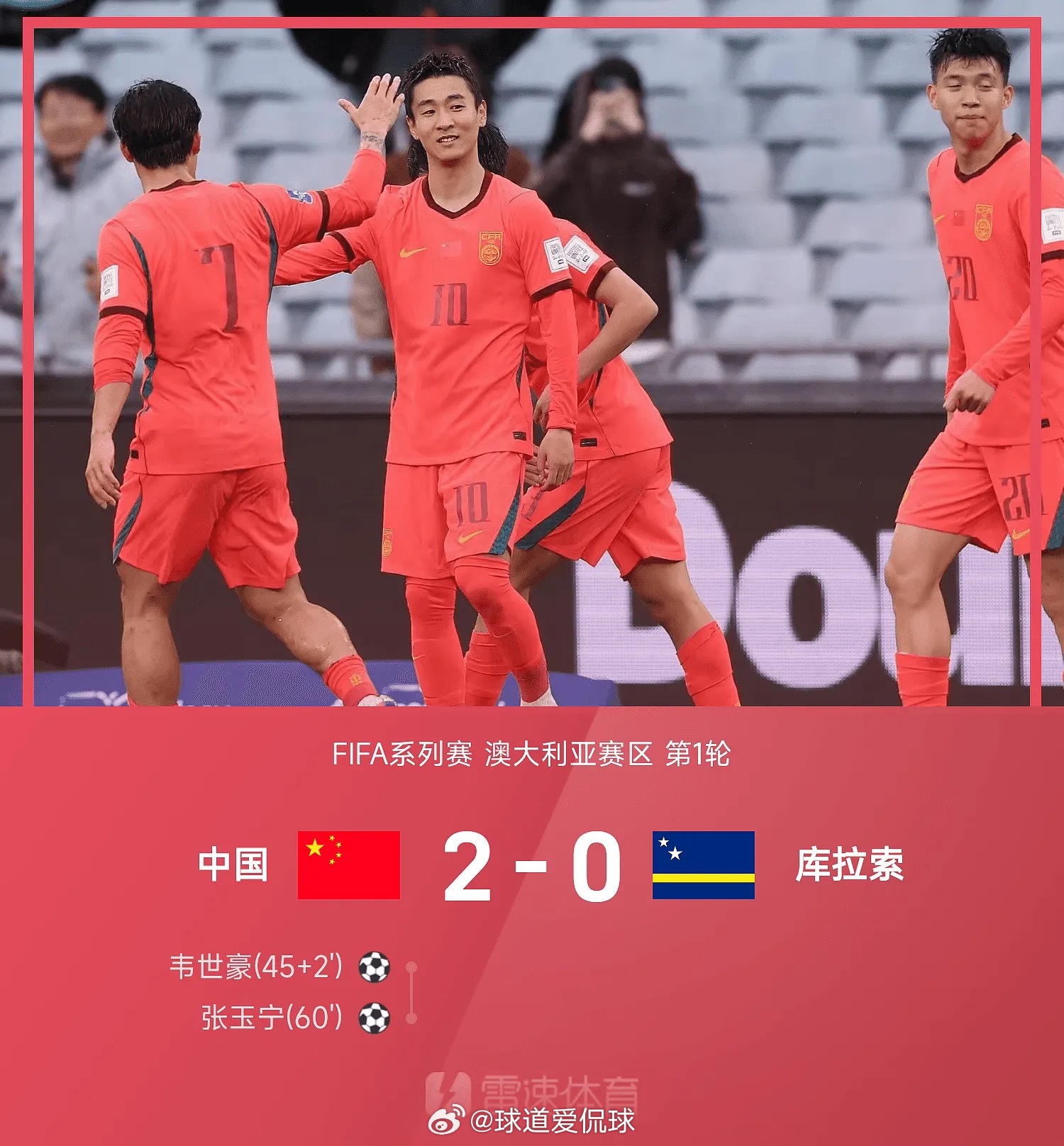 03月27日讯 26赛季FIFA系列赛澳大利亚赛区第1轮,中国以2-0轻取库拉索。上半时比赛,张玉宁助攻韦世豪破门,下半时张玉宁破门完成传射好戏。在国足获得这场比赛的胜利后,邵佳一也迎来执教国足的开门红。足球中国足球中国男足vs库拉索
