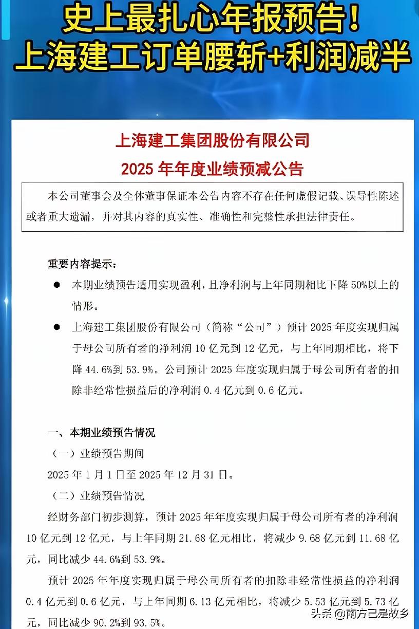 建工爷叔最近火气比较大。 因为他全仓持有的上海建工,公布了2025年业绩。净利润腰斩,扣非暴跌90%,千亿订单蒸发。 建工爷叔一套13年,现今已经83的老人家,真的好想向天再借50年,让他能看到上海建工解套的那一天。