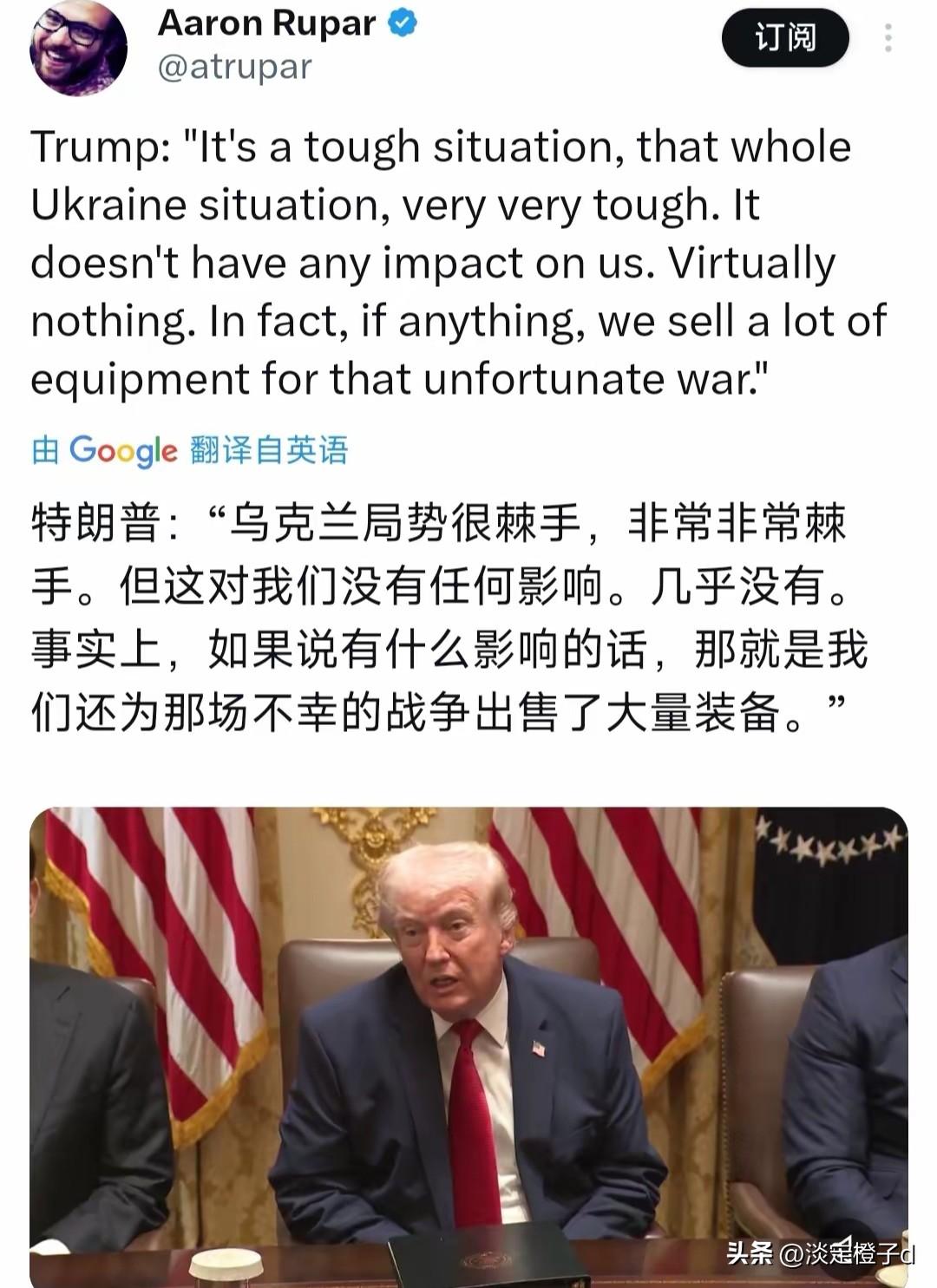 特朗普一句话撕碎基辅最后幻想:乌克兰战争就是美国的摇钱树 特朗普北京时间3月26日晚直言乌克兰战争不是美国的战争,这话直接给泽连斯基来了个透心凉 。 特朗普接受采访时说乌克兰局势棘手但对美国几乎没影响,反倒让美国卖了大量装备赚得盆满钵满 。这话听着扎心,却是美国对乌政策的真实写照。美国军工复合体就像喂不饱的饕餮,战争越久订单越多,乌克兰人的苦难不过是他们的提款密码。 新观点很明确,所谓盟友关系就是美国的一门生意。特朗普没藏着掖着,直接把美式霸权的遮羞布扯了个稀烂。美国嘴上喊着支持民主,心里算的全是军火利润,盟友的牺牲在他们眼里连个添头都算不上。 小困惑也解开了,为啥美国一边援乌一边对停火态度暧昧。答案就是钱,战争不停军火订单不断。特朗普甚至考虑把援乌武器调去中东,毕竟那边更有赚头。泽连斯基还指望美国撑腰,纯属是热脸贴了冷屁股 。 情绪共鸣更是拉满,泽连斯基怕是连苦笑都挤不出来。他之前还对特朗普抱有幻想,觉得能拿到更多援助,现在看来不过是特朗普竞选桌上的一枚弃子。等战争结束,他这枚棋子也就该被扔进垃圾桶了 。 这里用个接地气的比喻,美国对乌克兰就像街边卖糖葫芦的,把人家串起来烤得焦糊,自己却赚得腰包鼓鼓。泽连斯基还以为自己是座上宾,实则是人家砧板上的肉,随时能切一块下来卖钱。 现在泽连斯基的处境用北方话说就是“骑虎难下”“进退两难”,想停火没资本,想继续打没援助。特朗普这话一出口,基辅的最后一丝希望彻底泡汤,接下来就看泽连斯基怎么收拾这个烂摊子了。 你觉得泽连斯基接下来会怎么应对特朗普的表态,乌克兰还能撑多久?