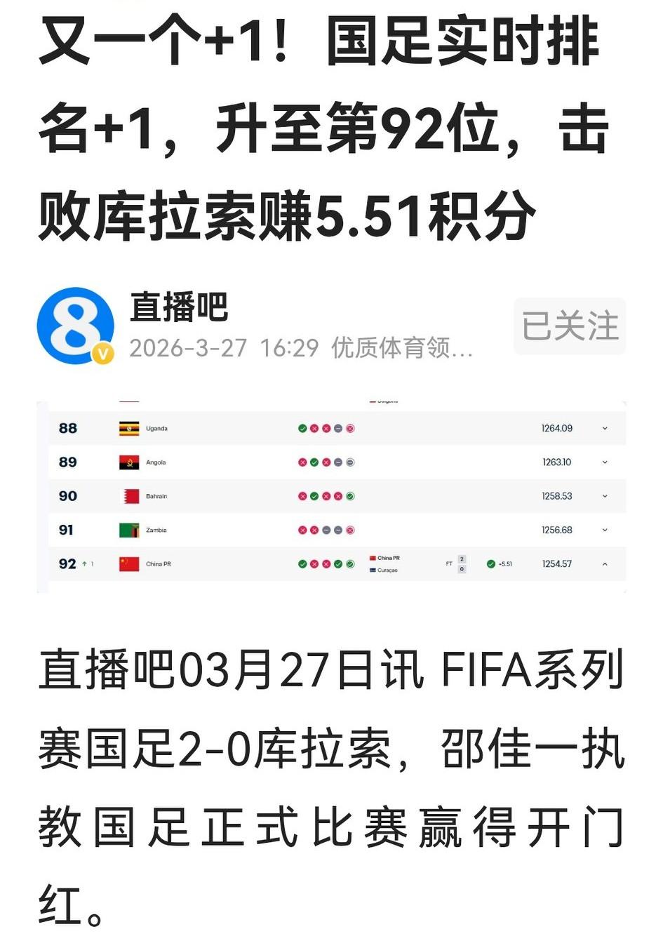 嘿嘿!用邵佳一的名字为国足加分,直播吧真有创意: 战力+1:邵氏国足首次出战国际A级赛事,就战胜世界杯队伍,配! 潜力+1:徐彬、杨希、刘浩帆、吾米提江、胡荷韬、谢文能、蒯纪闻、王钰栋、拜合拉木等小将悉数登场,配! 运气+1:面对素昧平生不知来历的世界杯球队,抓住机会打进2球带来好运,配! 信任+1:这场胜利让足协和球迷更信任佳一和球队,佳一和队员更互相信任,配! 随后,直播吧又补充,国足实时排名+1,升至世界第91,为这个创意的演绎收了个豹尾。牛逼!