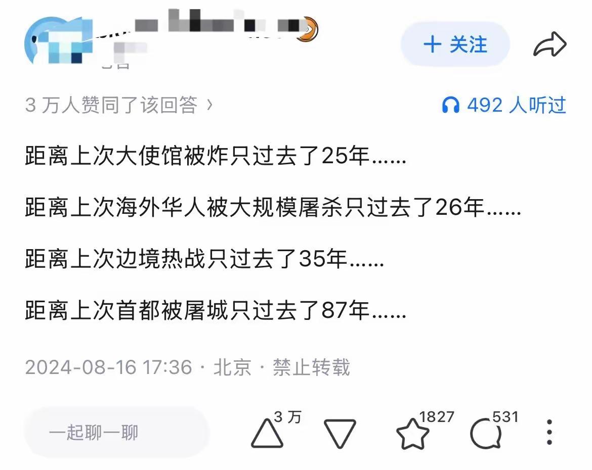 这几个数字确实让人有点不敢信! 我们离上一次首都被攻破才过去了仅仅87年。 我们离上一次边境血战也才过去了35年。 我们离上一次海外同胞被大规模欺凌也才过去了26年。 对我们很多人来说,这好像已经变成了历史课本里的遥远故事。 但实际上,这个时间甚至没有我们有些人的年纪长。 所以今天为什么我们中国必须要强大? 不是为了称霸世界,而是为了让我们每一个中国人,无论是在国内还是在国外,都能挺直腰杆,和和平平的活着。 其实有一句话,真的值得我们每一个人都记住。 和平从来都不是求来的,而是靠实力撑起来的。