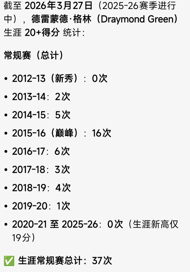 感觉波杰被低估了,还差13场就能追平格林职业生涯常规赛20+次数了! 波杰有三场