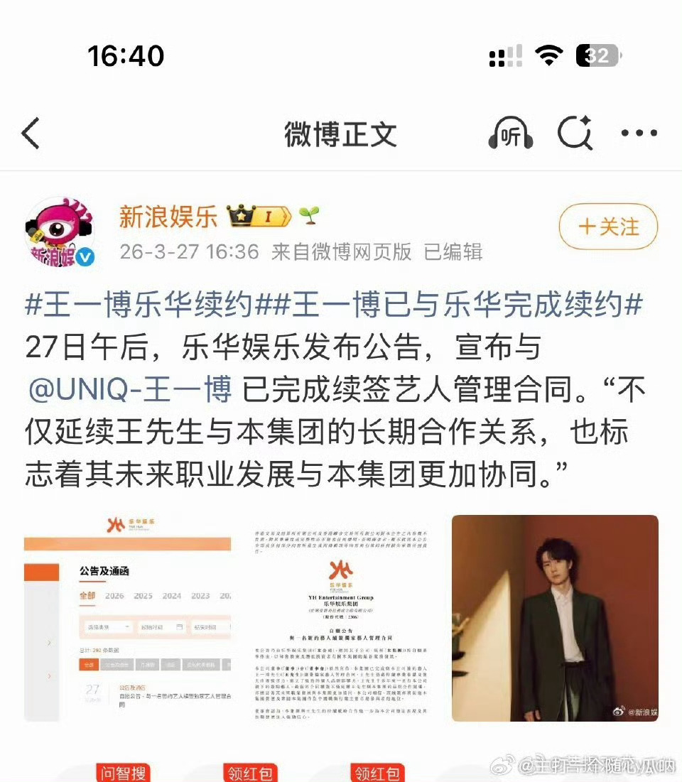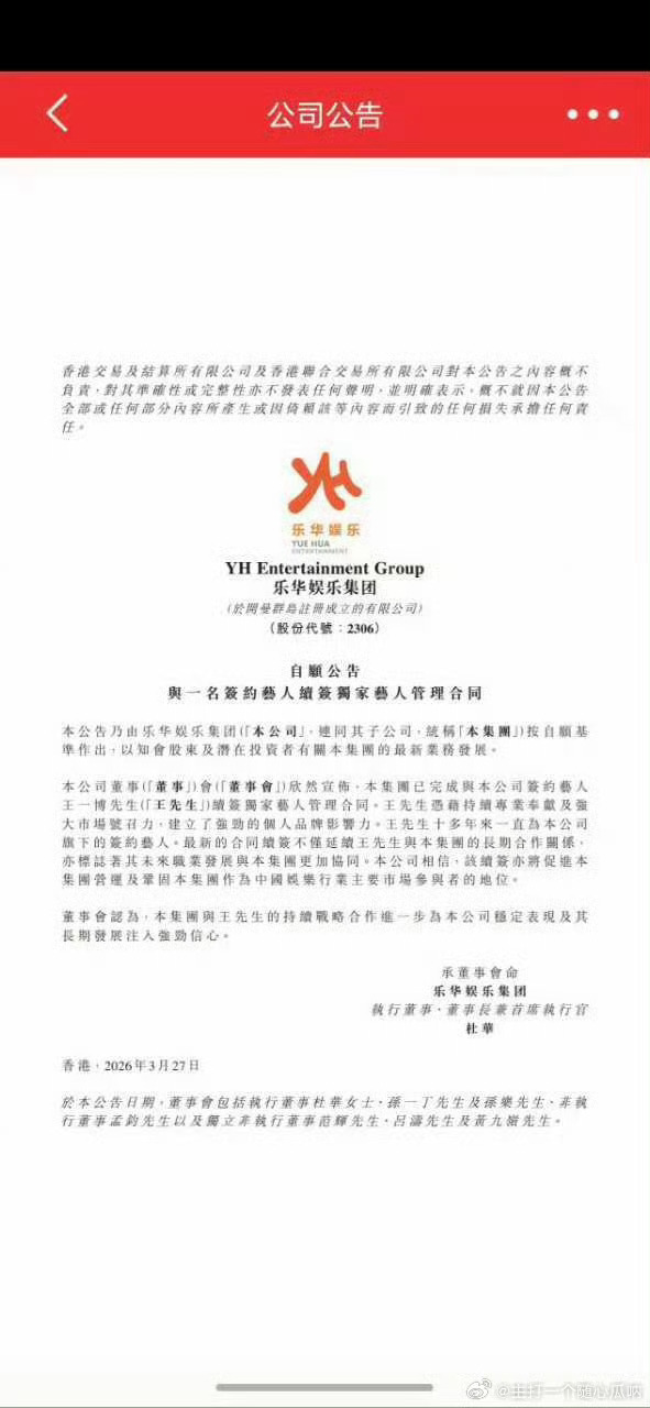 用户10xxx37 4 2026-03-28 03:32 西儿边边复盘整个舆论博弈拉扯: 所有舆论拉扯都是筹码,所有最终结果都是当下最理性的最优解。①刚刚三月二十七日,周五股市最后一个交易时段,乐华以一种近乎仓促的姿态,官宣的王一博的续约消息。现在大家都看到了,一博把微博组合名字去掉了,正式以一博大名和自己的ip英文名一博重新命名。这细节太关键了。这场耗时十八个月的月华续约博弈风波,貌似就这样先出了一个暂时结果,我觉得之前做关于分析月华预测王一博到期不续的视频是打脸,也不相信所谓月华手握王一博黑料逼迫其续约的说法。复盘整场博弈,续或不续只是结果。成年人的世界,谈的是筹码是谈判,每一步都不是浪费,每一次舆论交锋,都是筹码的试探与权衡。 ②从零和博弈的视角看,月华这次续约真的太急迫了。3月26日,他发布的2025年年报形成刺眼反差。年报里乐华拼命推行去王一博话,想尽办法向市场传递以摆脱对他依赖的信号,可转头就急着在股市收盘前官宣,明眼人都能看出来,博弈打到最后一刻才谈妥。月华全程都很被动,急着官宣就是为了维稳股价。