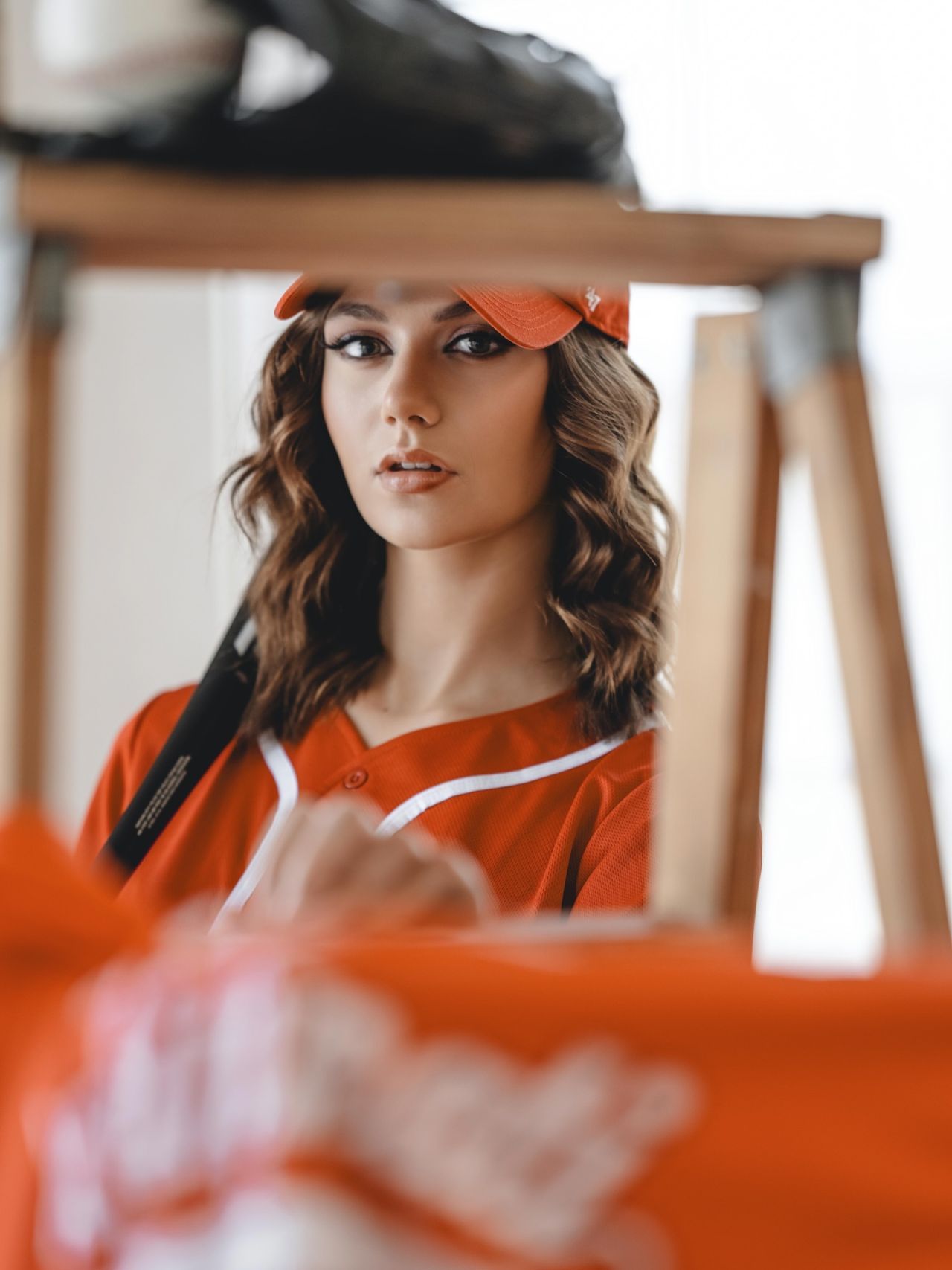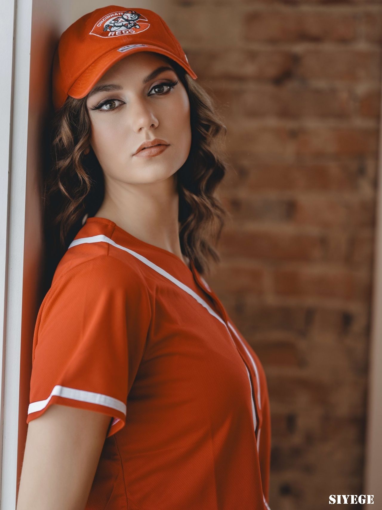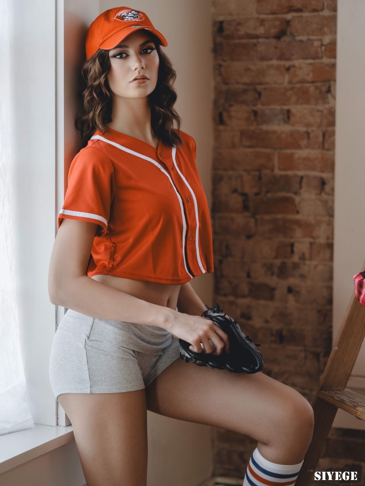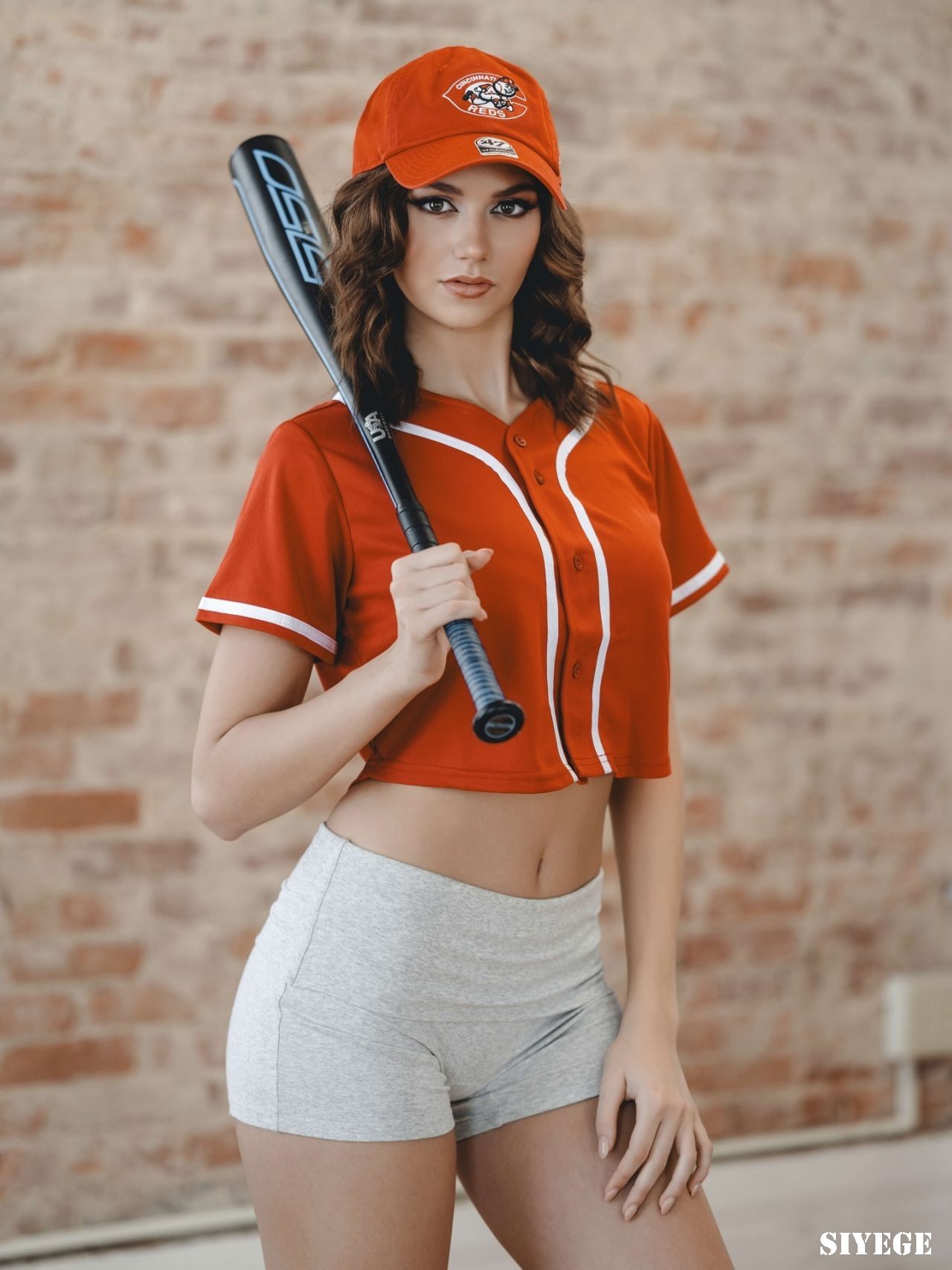 埃莉丝·霍弗(Elyse Hofer)穿着一件红色短款球衣、灰色短裤和条纹及膝袜——棒球主题写真