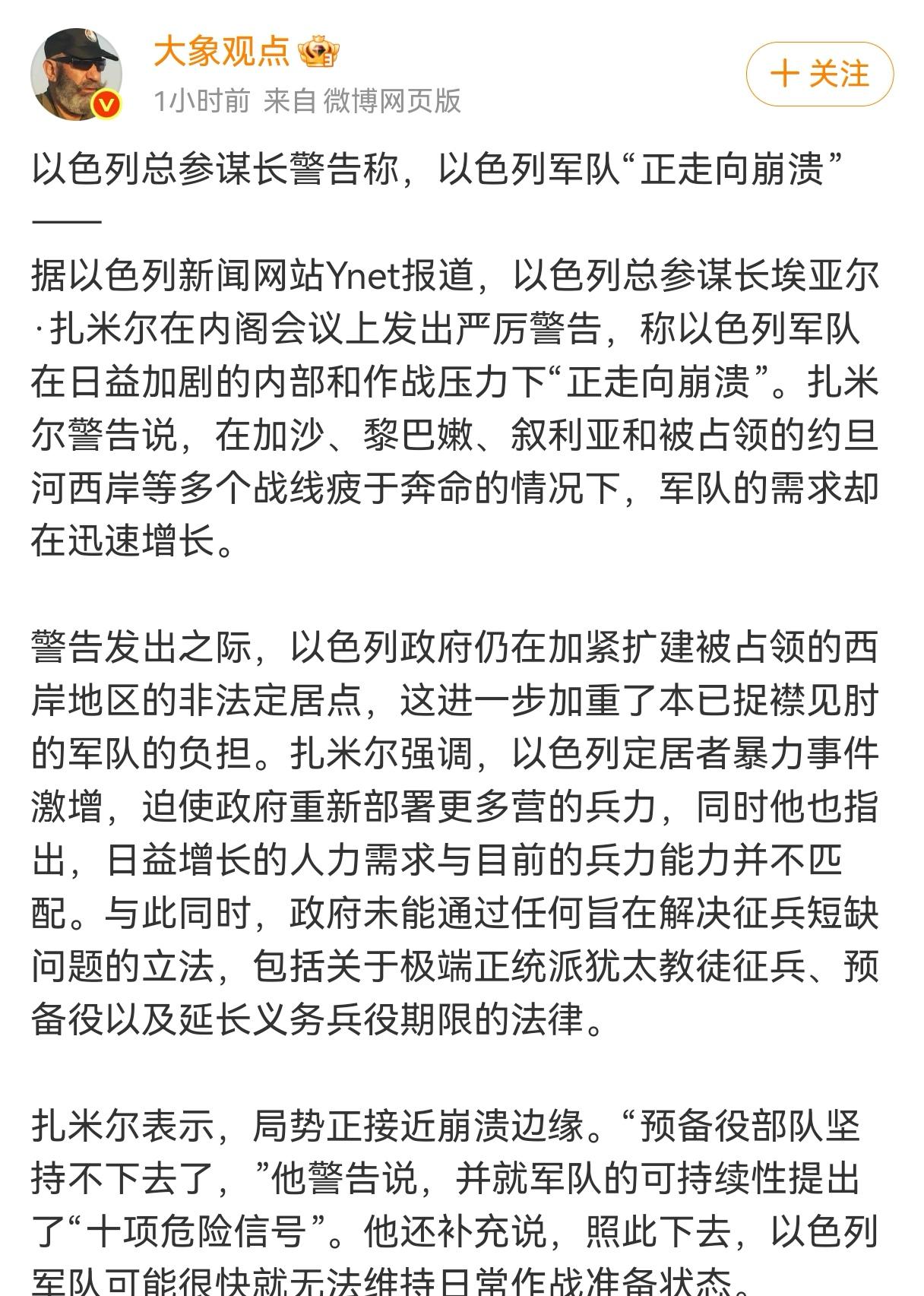 秦安:以参谋长直言以军面临崩溃风险、英军情六处前负责人称伊朗已占据优势,百万青年踊跃参军! 疯狂的特朗普明显怂了,直接甩锅国防部长要打伊朗,内心估计很后悔,当然最大的埋怨肯定给“加沙屠夫”内塔尼亚胡,但没有想到的是,最先是以色列也出问题了,以色列参谋长直言,以色列军队“正走向崩溃”。 当地时间3月23日,特朗普在田纳西州的公开活动上,直接把对伊朗动武的责任推给了国防部长赫格塞思,当众表示是这位防长第一个表态支持打击伊朗,自己只是听从了军方的建议。 这种临阵甩锅的操作,让在场的官员都面露尴尬,也彻底暴露了特朗普政府的进退两难。 他嘴上说着要强硬应对伊朗,心里却清楚这场战争已经打不下去了,国内油价上涨、股市波动,国际社会的反对声音越来越大,再硬撑下去只会让自己的支持率暴跌,后悔当初跟着内塔尼亚胡趟这趟浑水,成了他现在最真实的心态。 比特朗普更头疼的是内塔尼亚胡,他本想借着美国的撑腰彻底打垮伊朗,顺便巩固自己的政治地位,却没想到最先崩盘的是自己的军队。 以色列国防军总参谋长扎米尔在安全内阁会议上发出了重磅警告,称以军在持续多线作战的压力下,正走向内部崩溃,他甚至连续发出十项预警,都没能让政府停下冒险的脚步。 以军的崩溃不是空穴来风,加沙地带的地面战还没结束,北部边境又要应对黎巴嫩真主党的袭击,长期动员预备役部队让以色列的兵力彻底透支,士兵疲劳度拉满,装备损耗速度远超补给能力,就连以色列反对党领袖拉皮德都直言,政府的疯狂决策正在把国家推向安全灾难。 就在美以陷入战略困境的时候,英国军情六处前负责人亚历克斯·扬格给出了精准判断,他在接受《经济学人》专访时明确表示,美以早在两周前就失去了战场主动权,伊朗的军事韧性远超外界预期,如今的伊朗已经在这场冲突中占据了绝对优势。 这位资深情报官员的判断并非空口无凭,伊朗的地下军工体系全速运转,导弹和无人机的产能完全跟上了战场消耗,多波次的精准打击让以色列的防空系统疲于奔命,美国部署在中东的反导系统拦截弹也即将耗尽,美以的军事优势正在一点点被蚕食。 更让美以绝望的是伊朗的全民动员能力,据伊朗军方知情人士透露,短短几天内就有大量伊朗青年主动提交参战申请,伊朗已经组织起超过一百万人的力量为地面战斗做准备。 这些青年抱着保家卫国的决心奔赴前线,和以军的厌战情绪形成了鲜明对比,也让伊朗的战争潜力彻底爆发出来。 这场冲突的拐点早已出现,美以从主动挑衅变成了被动防守,特朗普的甩锅、以军的崩溃、伊朗的强势崛起,共同勾勒出中东局势的全新格局。 内塔尼亚胡的军事冒险不仅没能达到目的,反而把以色列拖入了前所未有的危机,而伊朗用实力证明,霸权主义的武力威胁在全民抵抗面前终究是纸老虎。 如今的中东再也不是美以可以随意拿捏的地方,百万伊朗青年的参军热潮,以军内部的崩溃预警,还有国际社会对和平的呼声,都在倒逼美以停下战争脚步。 这场博弈的最终赢家早已注定,坚持正义、保家卫国的一方,终究会赢得最后的胜利,而那些挑起战火、制造灾难的势力,只会在历史的审判下付出应有的代价。