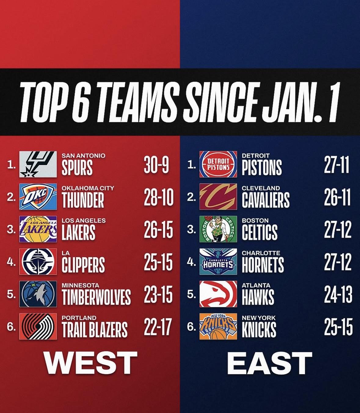 1月份到现在,骑士战绩一点都不差 别看输了那么多场,但其实也赢了很多场,少打了一场,基本上和并列东部联盟第一,而且和西部差距也不大,就2场