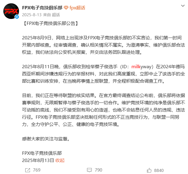 理性分析一下,Milkyway和Naiyou的区别是没有通报假赛,只是贩卖BP信息。而且LPL一直没有出调查和处理结果,FPX也只是出了公告无期限暂停和Milkyway的合作。所以Milkyway能复出打比赛的可能性还是有的,应该只是换个队伍,但是不知道有没有哪个战队敢签他就是了Naiyou涉嫌多次假赛naiyou终身禁赛