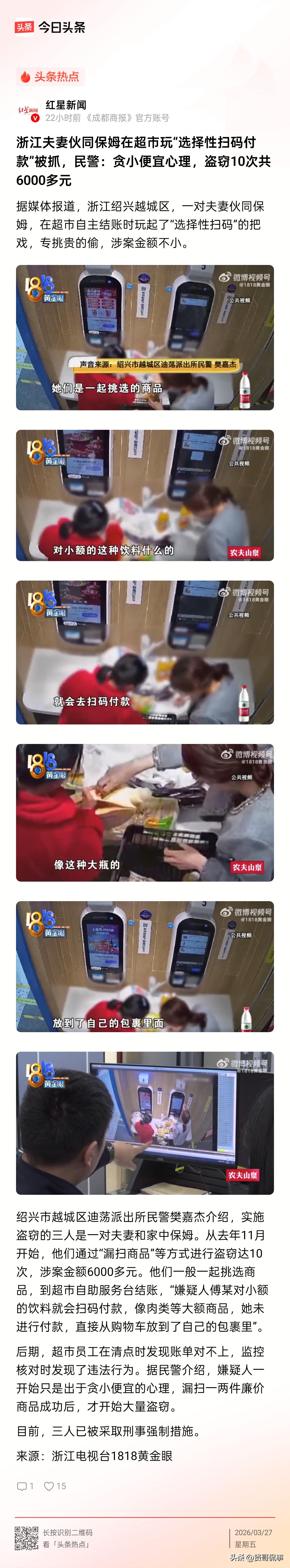 “太奇葩了!”浙江绍兴,一对夫妻为贪小便宜,竟带着家里的保姆来到超市,三人合伙作案行窃,前后10次通过漏扫的方式,盗窃金额高达6000余元。最终,因事情败露,超市报警,三人被警方采取刑事强制措施,将面临刑责。 据1818黄金眼报道,从去年11月开始,这对夫妻俩便经常带着保姆一起去超市采购,一开始,他们只是抱着贪小便宜的心思,偶尔漏扫一些便宜的小商品,几次都没被发现,心里的侥幸心越来越重,胆子也越来越大。 慢慢的,他们不再满足于偷小物件,开始玩起了“选择性扫码”的把戏。 每次在挑完商品来到自助结账台,妻子傅某就刻意分开操作,几块、十几块的小额饮料、日用品,会正常扫码付款,可几十块的肉类、高价食材,直接不扫码,趁着没人注意,从购物车拿出来塞进随身的包裹里。 三人配合得十分熟练,基本上每次都是“满载而归”。 就这样,短短时间里,他们用这种漏扫的方式前后盗窃了10次,涉案金额达到6000多元。 在他们看来,这种自助结账没人盯着,而且涉及的金额不大,肯定不会被发现,一开始的小贪念,逐渐被放大。 直到后期超市员工定期清点账目时,发现货品和账单金额对不上,亏空也越来越明显,调取监控查看后,才发现了这三人的盗窃行为,随即报了警。 警方随即将三人抓获归案。 说实话,发生这样的事实在让人无语! 对于夫妻二人来说,他们既然能请得起保姆,说明家庭条件不差,明明不缺这点钱,却为了几千块的东西,非要偷鸡摸狗,真的值吗? 而对保姆而言,则更是糊涂。作为保姆,做好分内的事情就可以了,为何又同雇主沆瀣一气,去偷东西呢? 三人要为此受到法律的严惩。 根据《民法典》264条规定,以非法占有为目的,盗窃公私财物,数额较大或多次盗窃的,成立盗窃罪。 一般情况下,处三年以下有期徒刑、拘役或者管制,并处或者单处罚金。 根据浙江当地的标准,盗窃“数额较大”起点为 3000元。 而多次盗窃则是指,2年内盗窃3次以上,不论金额多少,均构成此罪。 本案中,这三人涉案6000多元,还多次作案,无论从金额还是从次数上,均成立盗窃罪,依法要予以刑事处罚。 目前,夫妻和保姆三人,都已被依法采取刑事强制措施,案件正在进一步处理中。 好好的家庭,因为一点贪心,落得这样的下场,不仅自己留下案底,还连累了保姆,实在让人唏嘘。 在生活里,很多人都有过贪小便宜的念头,但常言道:“思想无罪”,大家想一想可以,可一旦越过底线,就必将会付出沉重的代价。 对此,你怎么看?欢迎大家在评论区留言。