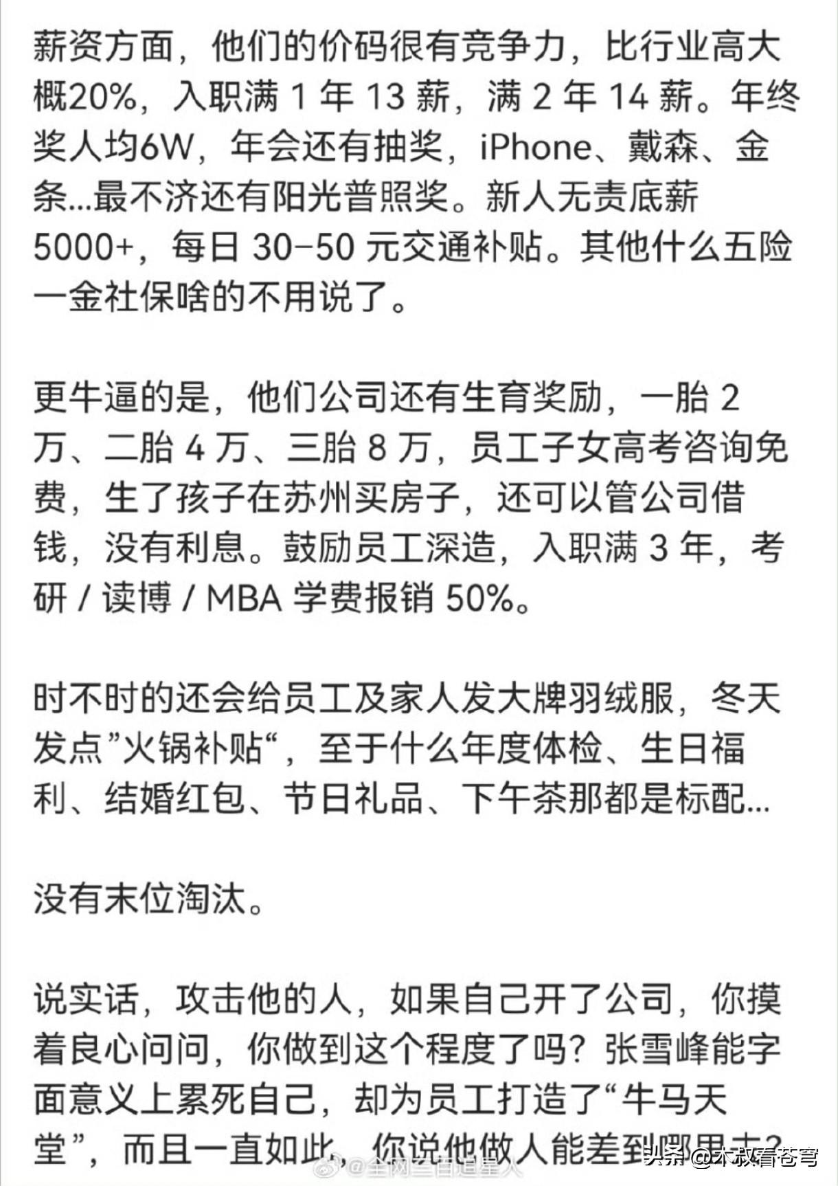 张雪峰公司员工待遇真是让人羡慕:入职满一年13薪,满2年14薪,年终奖人均6万,还有生育奖,一胎奖励2万,2胎奖励4万,3胎奖励8万…… 今天无意在网上看到张雪峰公司员工薪资福利,心里第一个念头就是感觉他真是个了不起的人物,我个人感觉,只有做大事的人才会把员工薪资待遇做得这么好,这样的待遇,员工是幸运的,老板是有魄力的,都说“兄弟连心,其利断金”,员工视公司为家,这样的凝聚力,很恐怖的。 这几天,全网都在悼念张雪峰,原来,他的好,不是一般人能够做到的。