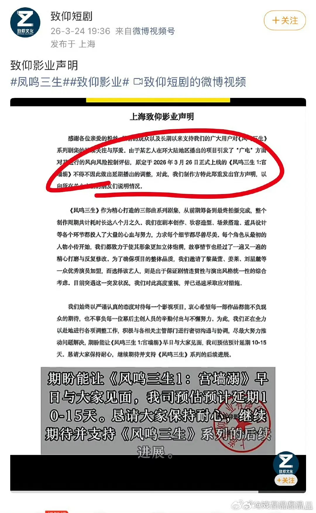 某环大陆演员被fs,导致他拍的短剧《凤鸣三生:宫墙溺》不能正常播,剧方怒气非常大