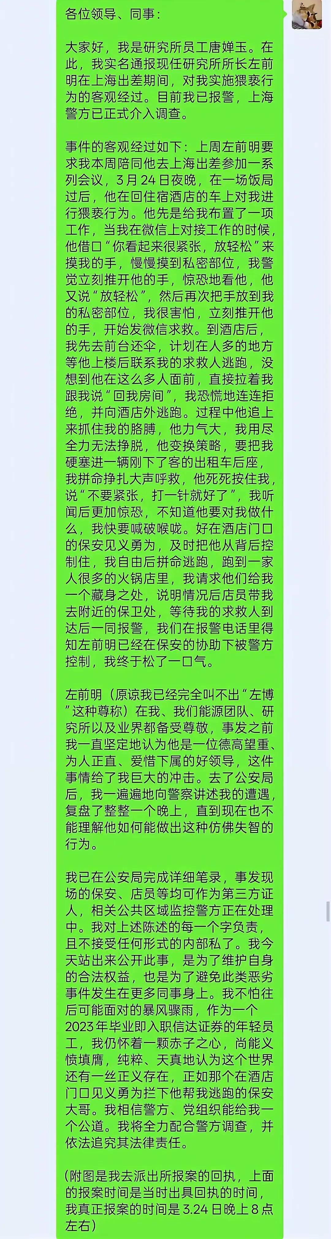 一夜之间左所长火了,唐姑娘也火了,唐婵玉的举报信我全部看完了,可以说是人证物证确凿,接下来就看怎么结尾了! 左所长是个博士,才40出头,人也长得风流倜傥,而且还是所里面的一个头头,以前估计招蜂引蝶惯了,被他祸害的姑娘一定也不少,可这次却没有得手,你们知道为什么吗?说白了就是碰到了一个刚参加工作涉世不深的烈女子,当然也可能这个男人不是她的菜! 如果这个女人在所里多待了几年,如果她对社会潜规则看透了,如果她对左所长正好又有所求,那么这个女人可能也就妥协了。刚参加工作的女孩子是初生牛犊不怕虎的,对邪恶的事情敢于挺身而出,即使自己丢了工作也要揭露这个卑鄙的男人,这叫碰上了对头! 有网友说,凭左所长的容貌,凭他的才气,凭他所掌握的资源,应该身边有很多女人会投怀送抱的。如果左所长肯将就一些这样的女人,应该来说没有一点点风险,他想咋玩就咋玩,可是左市长对这种女人没什么感觉了,他估计就是想驯服一匹烈马,哪晓得这一下却栽了跟头!他不知道的是不是每个姑娘都会对他妥协,现在唐姑娘凭一己之力铲出了一个恶魔,应该为唐姑娘点赞,因为社会需要正能量,你们说呢?