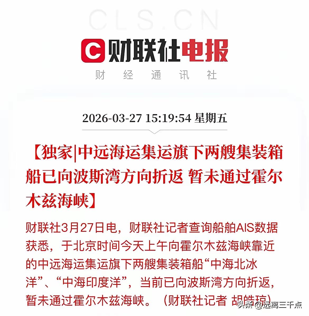 真是天大的误会! 前天盘后刷到消息,中远海运集运高调宣布,从次日起,公司的货轮恢复往返远东与中东六国,我和广大股友都把这个当成重大利好来解读的。所以,昨天早盘就全仓杀入做T,遗憾的是市场没有认这个利好,让我没T出去。 刚刚又刷到,高调出发、逆风而行的中远海运集运的两艘集装箱巨轮,竟然在霍尔木兹海峡前折回。看来,熄火没点火那么容易。所幸,今天把昨天进的T出了一些,为周一再T留了点小机会。