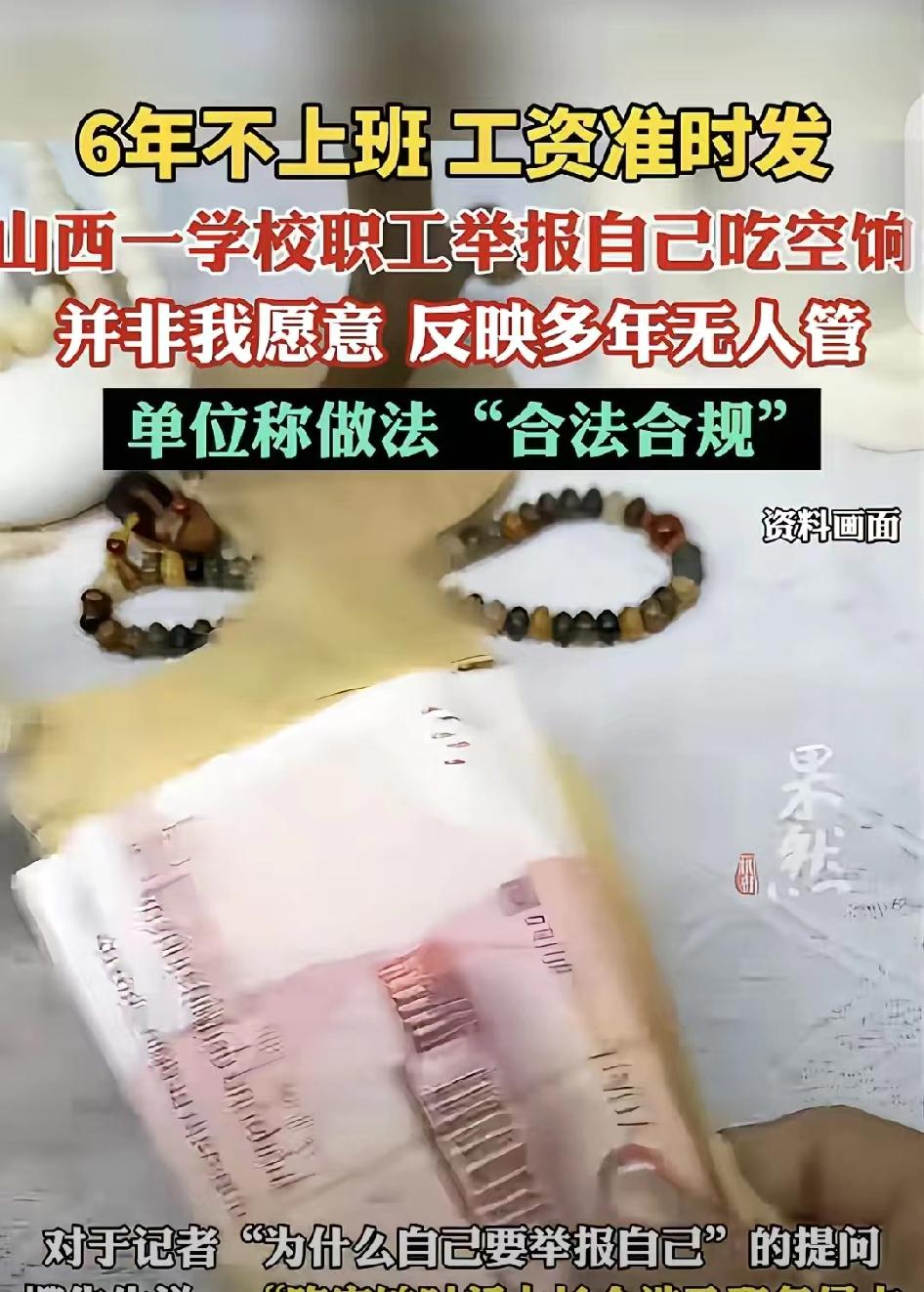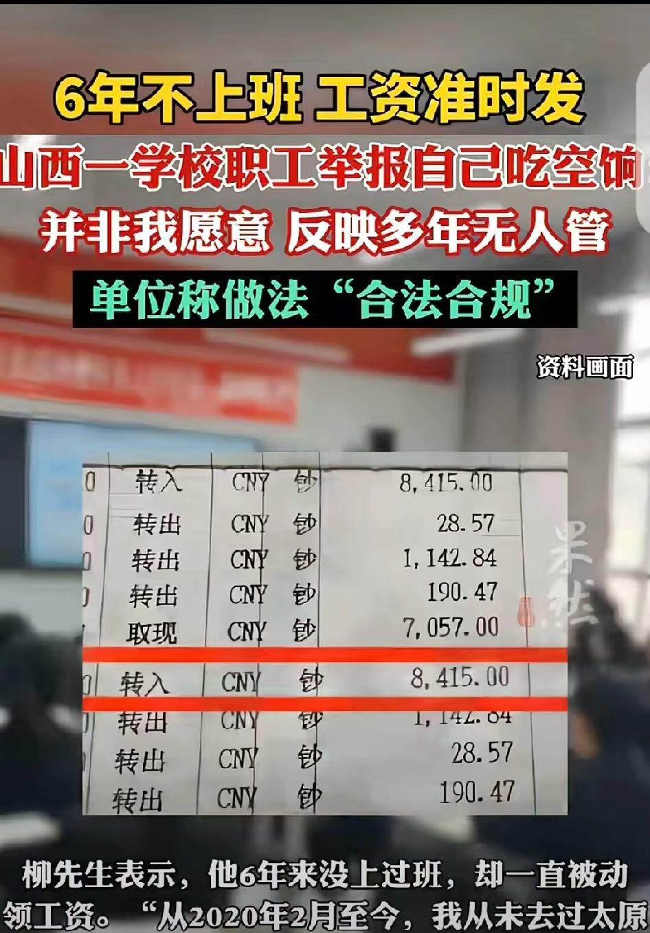 “大义灭己!”山西太原,一男子6年没上 班,每月8415元工资却准时发,他怕被追究 责任,一狠心举报自己吃6年空饷,原来,男 子工作调动,但他发现《调动登记表》既没盖 章,审批程序也不对,而且,他技术人员10 级被写成了科员9级。男子上了1个月就坚决 不上了,要求调回原单位,可没人搭理他。他 反映了6年,没人查没人管。单位回应:做法 合理合规。 2019年12月,山西太原,柳先生的人生轨迹被一次异常的人事调动彻底打乱。他从山西省贸易学校被调入太原市第二十九中学,本应是正常的工作变动,却从一开始就透着不对劲。 《调动登记表》缺章少印,审批流程漏洞百出;批准日期竟晚于接收单位的清退日期,时间线完全对不上;自己明明是技术人员10级,档案里却被硬生生改成了科员9级。拿着这份满是瑕疵的手续,柳先生心里直发沉——这调动,根本不合规。 到新单位仅工作1个月,柳先生越想越不安。他认定这次人事调动程序违法,坚决拒绝继续上班,多次向学校和主管部门提出,要求调回原单位、纠正错误。可他的诉求像石沉大海,没人回应,没人处理,更没人给他一个说法。 从2020年2月起,柳先生彻底没再去太原市第二十九中学上班。他没办离职,没办停薪,就这么被“晾”在了原地。 更让他意外的是,财政部门的工资,却一分不少、一月不落地打到他的账户里。每月8415元,6年下来,累计超过50万元。 柳先生说,这是“被动吃空饷”。他不是不想停,不是想白拿这份钱——他多次找单位、找主管部门,要求停发工资、纠正人事错误,可每次都被推诿、被搁置,问题一拖就是6年。 他心里越来越慌:这50万,不是他主动要的,可钱实实在在进了他的账户。长期下去,万一被认定职务侵占、贪污,他要担的是刑事责任。 2026年,忍无可忍又怕到极致的柳先生,做出了一个让所有人意外的决定:主动向相关部门举报自己“吃空饷”。 “并非我愿意吃空饷,我不想被动违法,反映多年无人管,只能自己举报自己。”他说这话时,满是无奈与委屈——明明是程序出错、管理失职,最后却要他一个职工,用“大义灭己”的方式,来倒逼问题解决。 事件曝光后,舆论哗然。面对质疑,太原市第二十九中学却回应:柳先生的人事调动与工资发放,均“合法合规”,不存在违规问题。 一句“合法合规”,让网友更看不懂了:6年不上班、工资照发50万,合规的依据到底是什么?程序漏洞、诉求被搁置,又该由谁来负责? 有人说柳先生傻,白拿的钱为什么要退;有人心疼他的处境,被错误的人事安排绑住,进退两难;也有人直指管理漏洞:单位长期不监管、不处理,才是“被动吃空饷”的根源。 这起荒诞的“自我举报”,戳破了一个扎心的现实: 当程序出错、管理缺位时,普通职工成了最被动的受害者。他不想违法,不想白拿,可6年里,没人帮他纠错,没人帮他停薪,最后只能靠“举报自己”,来求一个清白、求一个说法。 公道不该靠“自我举报”来争取,责任更不该让无辜者来承担。 我们期待的,从来不是这样荒诞的结局,而是有错必纠、有责必追的公平与担当。 山西男子举报自己吃空饷 被动吃空饷6年工资照发 职场人事纠纷 基层办事难