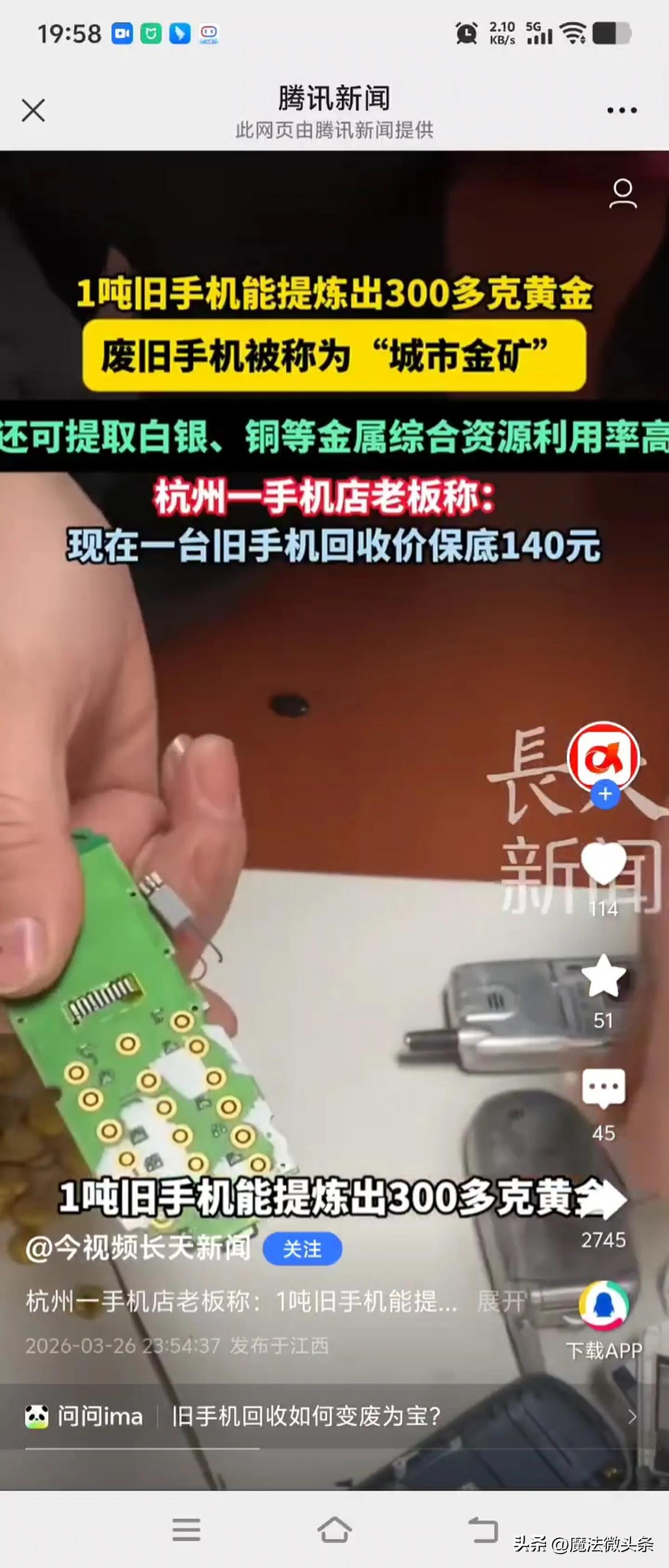 1吨旧手机能提炼出300多克黄金废旧手机被称为“城市金矿” 不可提取白银、铜等金属综合资源利用率高 杭州一手机店老板称: 现在一台旧手机回收价保底140元据了解,这些回收的旧手机,经过层层拆解和专业的提炼工序,就能将其中蕴含的黄金、白银、铜等金属提取出来。这其中的黄金,可是实打实的真金,经过提纯后完全可以重新投入市场使用。而白银和铜等金属,也在工业生产等领域有着广泛的用途。 不过,废旧手机的回收利用并非易事。这需要专业的技术和设备,否则不仅难以高效提取其中的金属,还可能对环境造成污染。目前,有不少企业已经投身于废旧手机回收利用的行业,他们不断研发新技术,提高资源的回收利用率。 对于消费者来说,把闲置的旧手机拿去回收,不仅能获得一笔额外的收入,还为资源的循环利用做出了贡献。就像杭州这位手机店老板说的,一台旧手机保底能卖140元,要是手机状况好一些,价格还会更高。