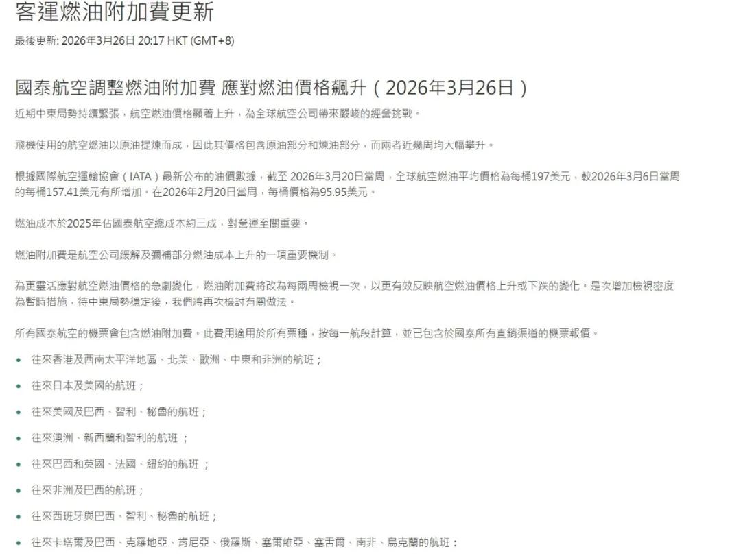 2026年4月1日起调整客运燃油附加费,短途航班为389港元,现为290港元,上调99港元;中程航班为725港元,现为541港元,上调184港元;长途航班为1560港元,现为1164港元,上调396港元;不过内地往返香港航线的税费不变