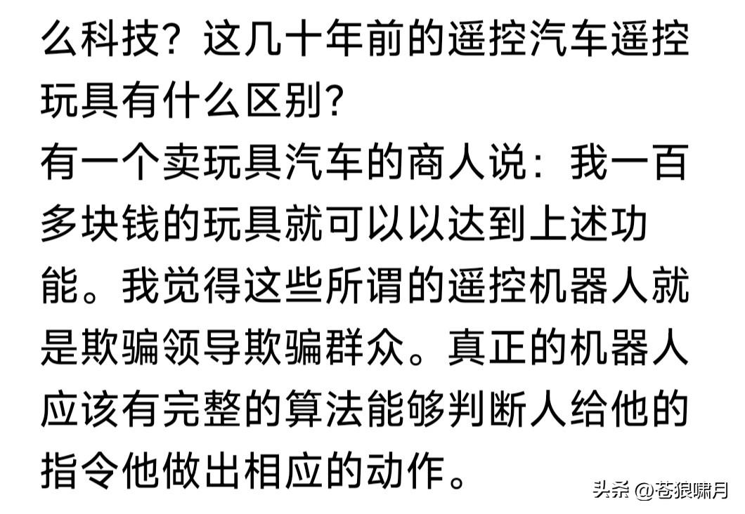 有一个卖汽车玩具商人说:我一百多块钱的玩具,就能达到上述功能!我觉得这些所谓遥控机器人,就是欺骗领导欺骗群众。真正的机器人有完整的算法,能根据人的指令做出相应的动作!