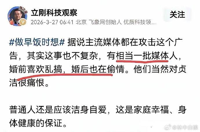 要不怎么项立刚有那么多粉丝呢?他看问题一针见血啊。 《遗情书》听说过吧?木子美听说过吧?她的那些故事,以及后来的一些故事听说过吧? 中间有多少的媒体人……哦,当然木子美自己也曾经是媒体人,而且也是做得小有成就的媒体人之一。 现在是不是就可以理解他们为什么对贞洁这个词有应激反应了。 哦,顺便再说一句,你看,他们都只看到了“贞洁,是女孩最高贵的嫁妆”,选择性忽视了“贞洁,是男孩最高贵的聘礼”。 因为这句话让他们都高贵不起来了。太扎心了。 点右上角关注我,我们一起去看这个魔幻的世界