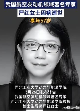 痛别巾帼国之脊梁!57岁航发专家严红逝世,一生铸国之重器 阅读此文前,诚邀您点击一下“关注”按钮,方便以后第一时间为您推送新的文章,同时也便于您进行讨论与分享,您的支持是我坚持创作的动力。 编辑:纱娜 作者:纱娜 2026年3月24日,一则悲痛的消息传来, 我国航空发动机领域著名专家严红教授,因病医治无效与世长辞, 年仅57岁的她,永远离开了倾注毕生心血的科研事业。 这样的消息,远比各类流量热点更让人揪心扼腕, 一位正值科研黄金年华的巾帼栋梁骤然离世, 不仅是家人的悲痛,更是我国航空工业的重大损失。 严红教授的一生,都扎根在航空发动机科研领域, 这一领域被誉为“工业皇冠上的明珠”, 也是我国长期攻坚的关键“卡脖子”技术方向。 无数战机、航天器的动力核心,都离不开航发技术的支撑, 我国能一步步打破国外技术垄断,筑牢国防航空底气, 离不开严红这样默默深耕的科研工作者。 她主攻超声速流动控制、计算流体力学等核心方向, 这些专业术语看似晦涩,实则是航发研发的核心命脉, 直接决定航空发动机的性能、速度与稳定性。 通俗来讲,她的研究就是破解航发高速运转的技术难题, 为发动机进气道、燃烧室等关键部件优化设计, 扫清国产航发研发路上的一道道技术障碍。 严红教授并非一开始就扎根国内, 她曾放弃美国的优渥教职,毅然选择归国效力, 加入西北工业大学,投身祖国航发科研攻坚事业。 归国后的十余年里,她始终扎根科研一线, 带领团队主持国家自然科学基金、国家数值风洞工程等 多项国家级重大科研项目,每一项都关乎国家航空战略发展。 国家数值风洞工程是航空航天领域的国之重器, 通过超级计算机构建虚拟试验场景,大幅降低研发成本, 严红教授在其中承担核心研究,为数字化研发注入强劲动力。 她深耕的等离子体流动控制技术,更是开辟了全新路径, 不仅能优化战机引擎性能,未来还能应用于民航领域节能降耗, 用实打实的科研成果,为国产航发突破提供坚实支撑。 科研路上,她从不在意名利与光环, 常年泡在实验室里,埋首数据与试验, 青丝染霜也从未停下攻坚的脚步,始终默默奉献。 在男性居多的硬核科研领域,她巾帼不让须眉, 用扎实的学识与坚韧的毅力,闯出一片天地, 成为我国航发领域当之无愧的巾帼科研英雄。 57岁,本是科研工作者经验与能力兼备的黄金年纪, 她本该继续带领团队攻克更多技术难题, 看着国产航发一步步迈向世界顶尖,却永远停在了这一刻。 我们总习惯关注聚光灯下的流量与热点, 却常常忽略这些隐姓埋名、为国铸器的国之脊梁, 他们不追名、不逐利,只一心为国家强盛埋头苦干。 正是有了严红教授这样的科研工作者, 我国的国防事业才能稳步发展,航空工业才能不断突破, 我们才能拥有如今安稳和平的生活,拥有强大的国防底气。 他们把一生都献给了国家科研事业, 用青春、汗水乃至生命,筑牢国家发展的根基, 这样的英雄,值得我们每一个人铭记与致敬。 斯人已逝,精神长存, 严红教授的科研风骨与家国情怀, 会永远留在我国航空工业发展的史册里,激励后人前行。 我们永远不会忘记这些为国奉献的无名英雄, 他们是国家的脊梁,是民族的骄傲, 他们的付出与功绩,终将被时代铭记。 各位读者你们怎么看?欢迎在评论区讨论说说你的观点。 创作声明:本文为基于史料的虚构创作或解读,部分细节为文学加工,请勿与现实绝对关联。本文所用素材源于历史记载或文献,部分图片非真实图像,仅用于叙事呈现,请知悉。