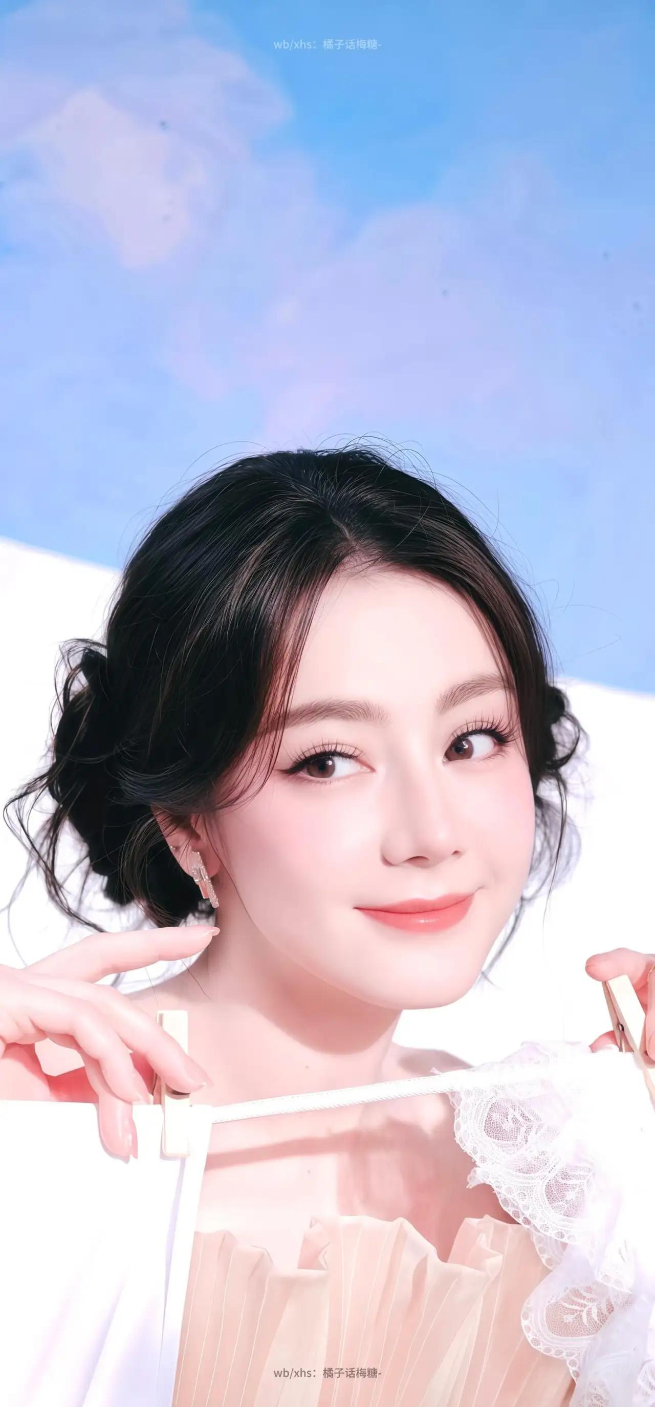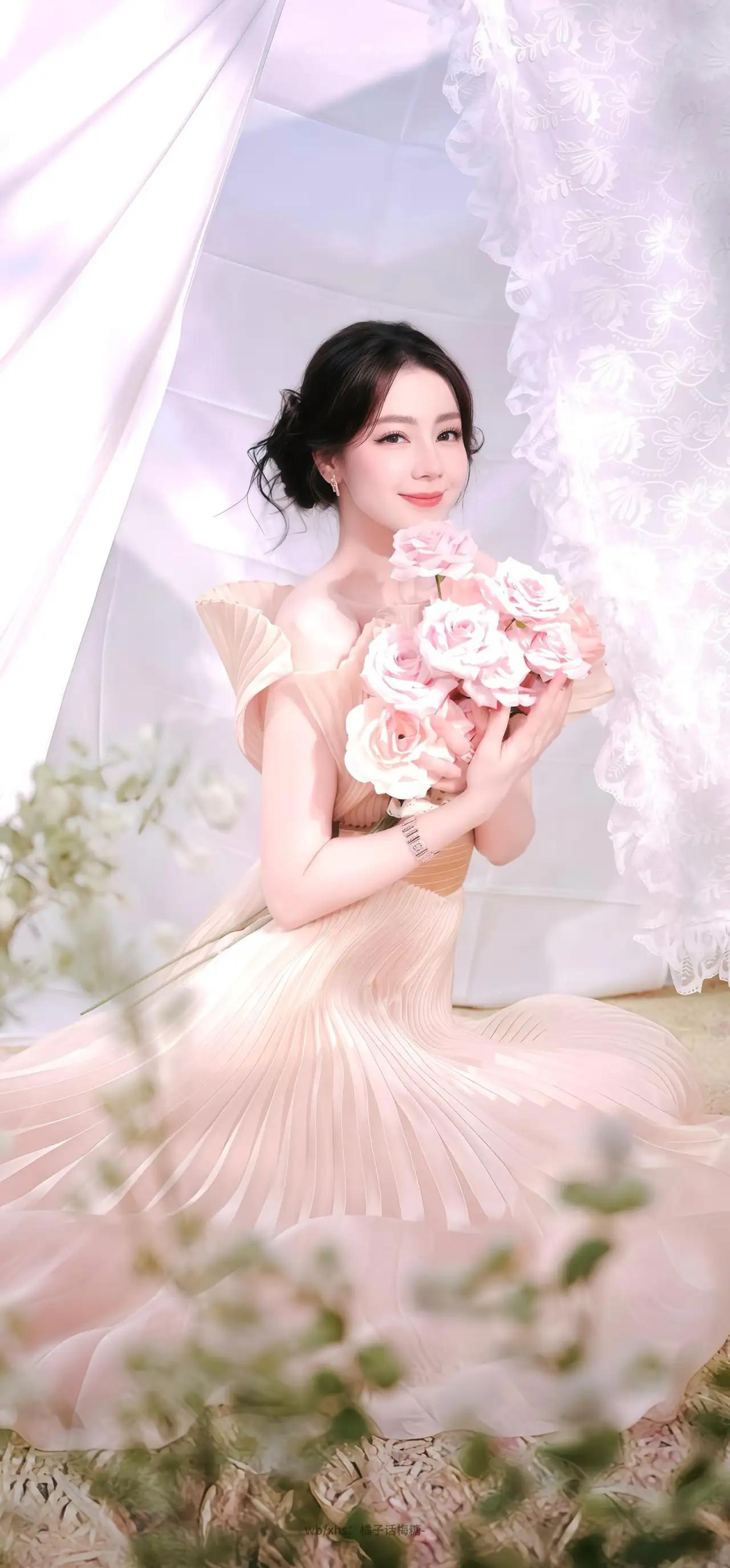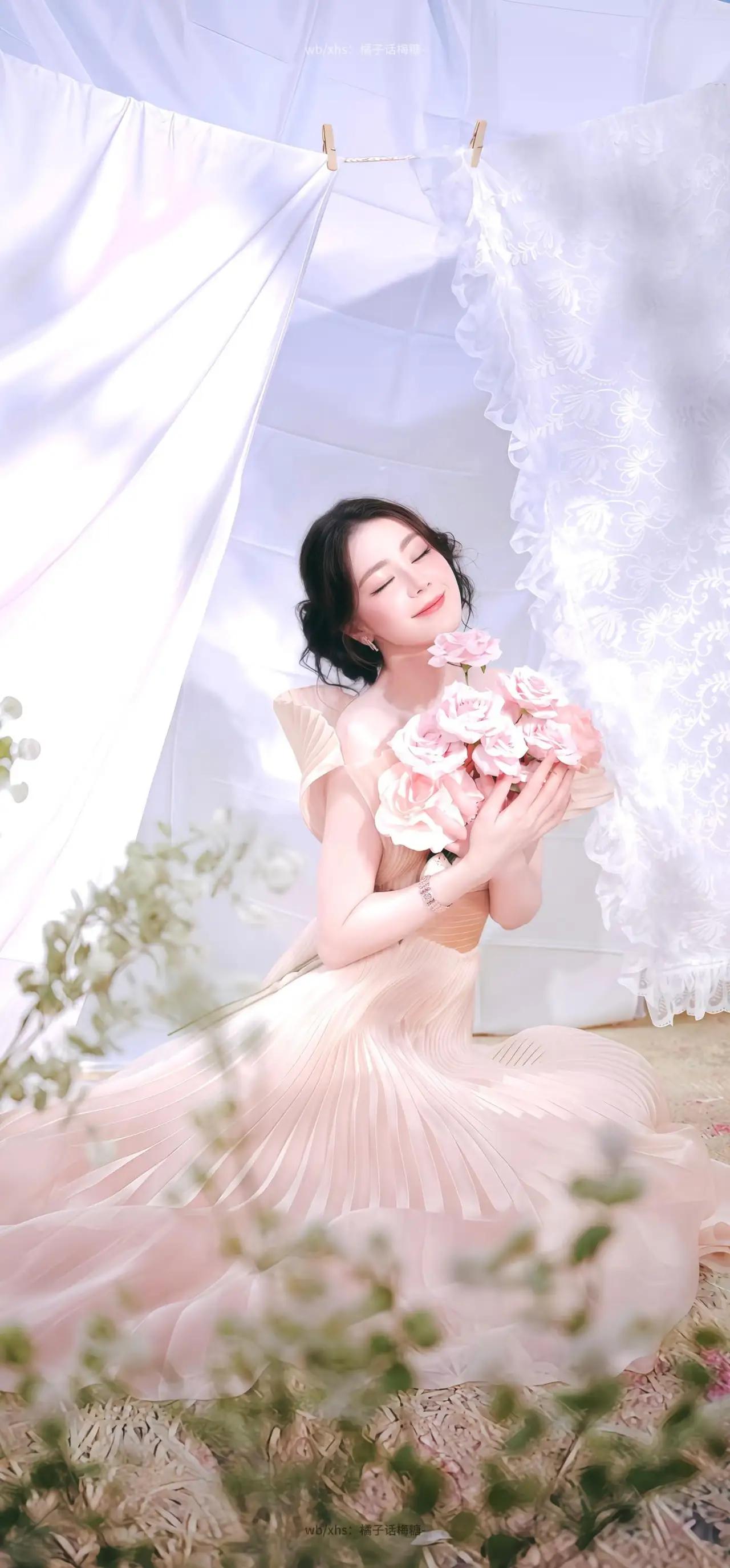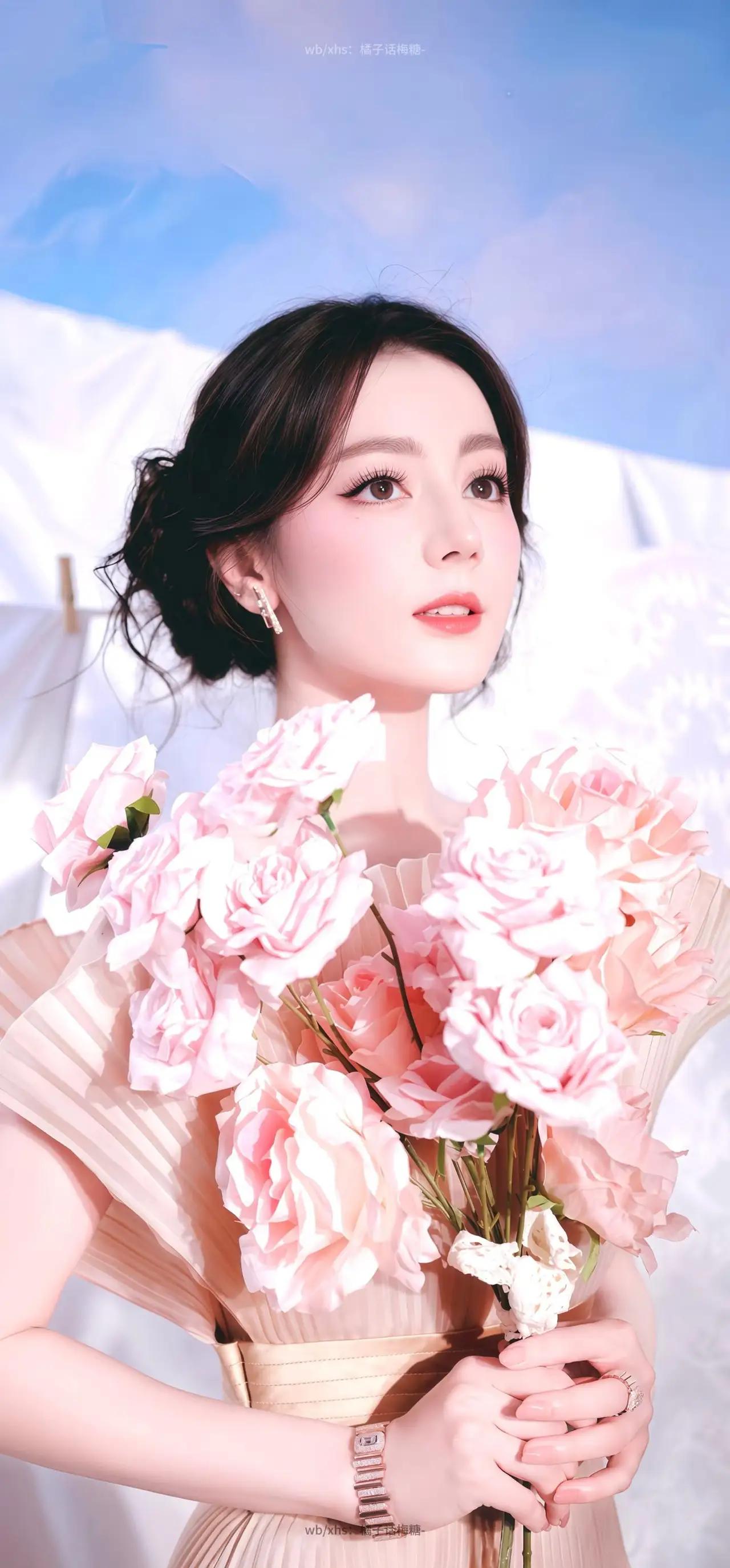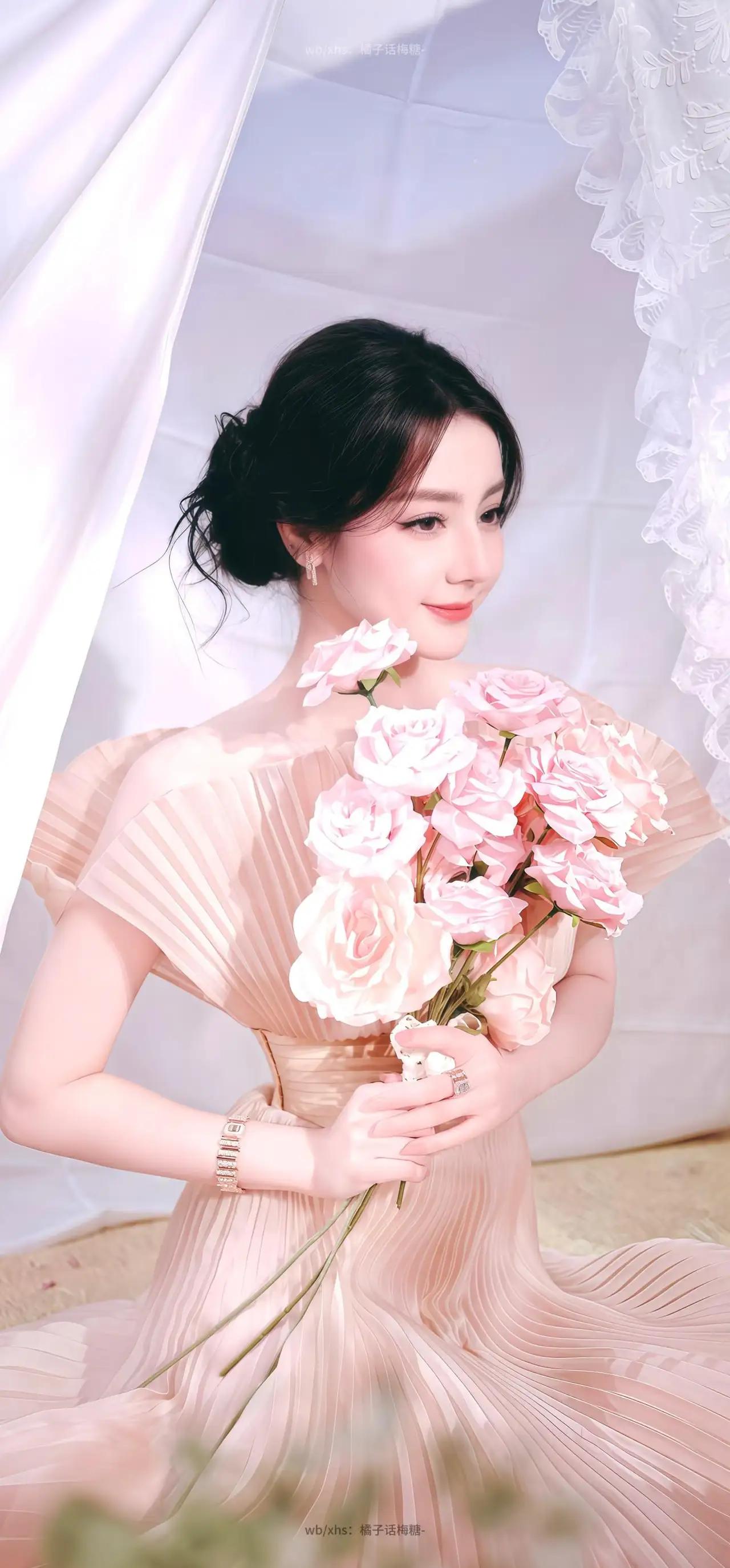美女壁纸~迪丽热巴,风掠过裙摆,粉玫瑰藏起半张脸,光影在白纱间流转,温柔是此刻的