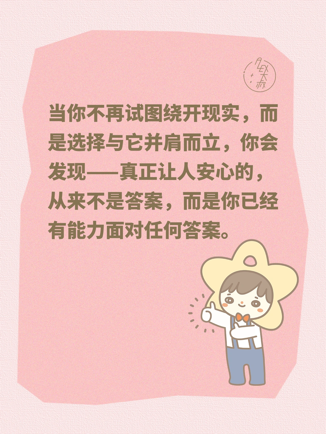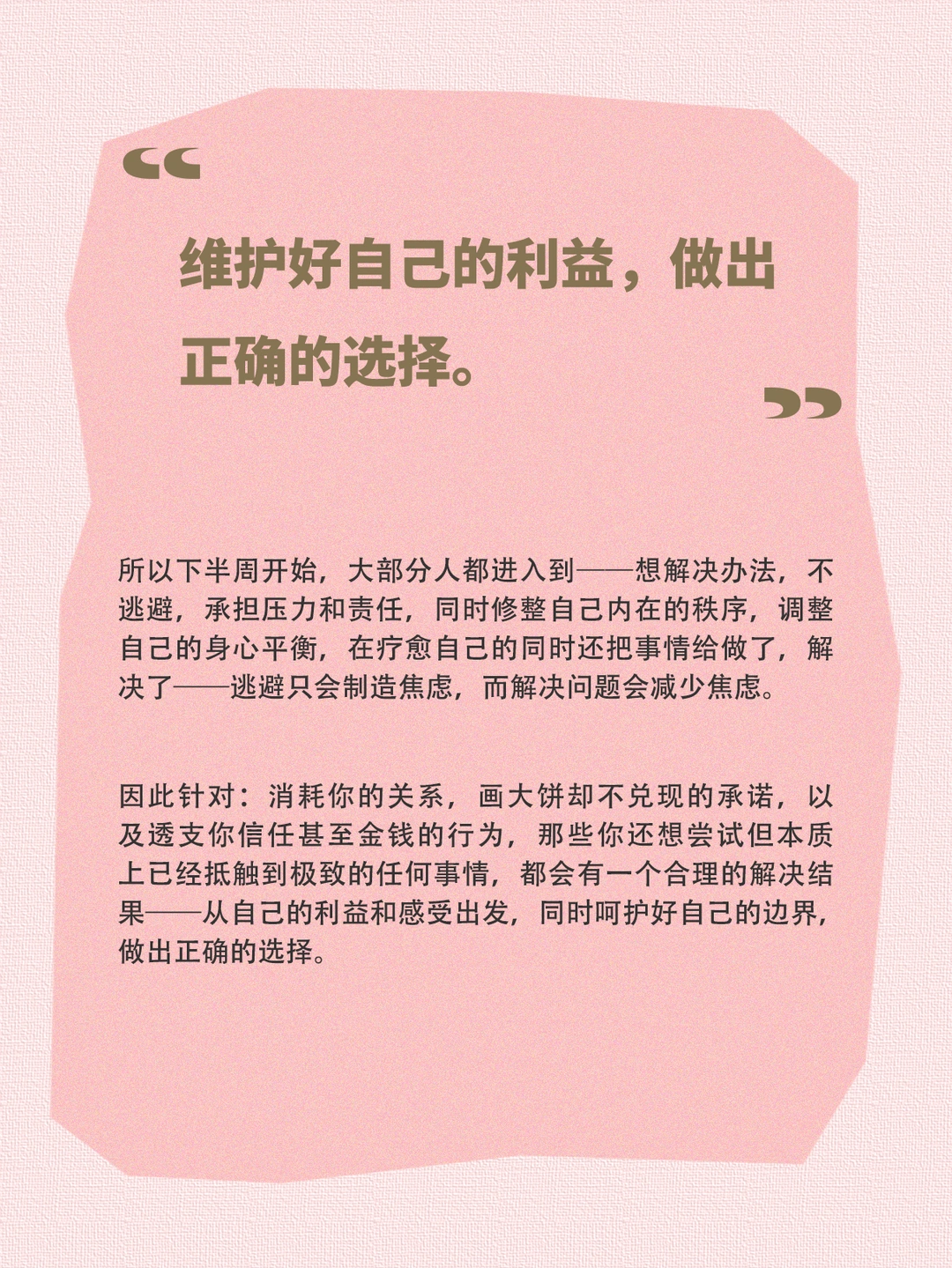 因此针对:消耗你的关系,画大饼却不兑现的承诺,以及透支你信任甚至金钱的行为,那些你还想尝试但本质上已经抵触到极致的任何事情,都会有一个合理的解决结果——从自己的利益和感受出发,同时呵护好自己的边界,做出正确的选择。
