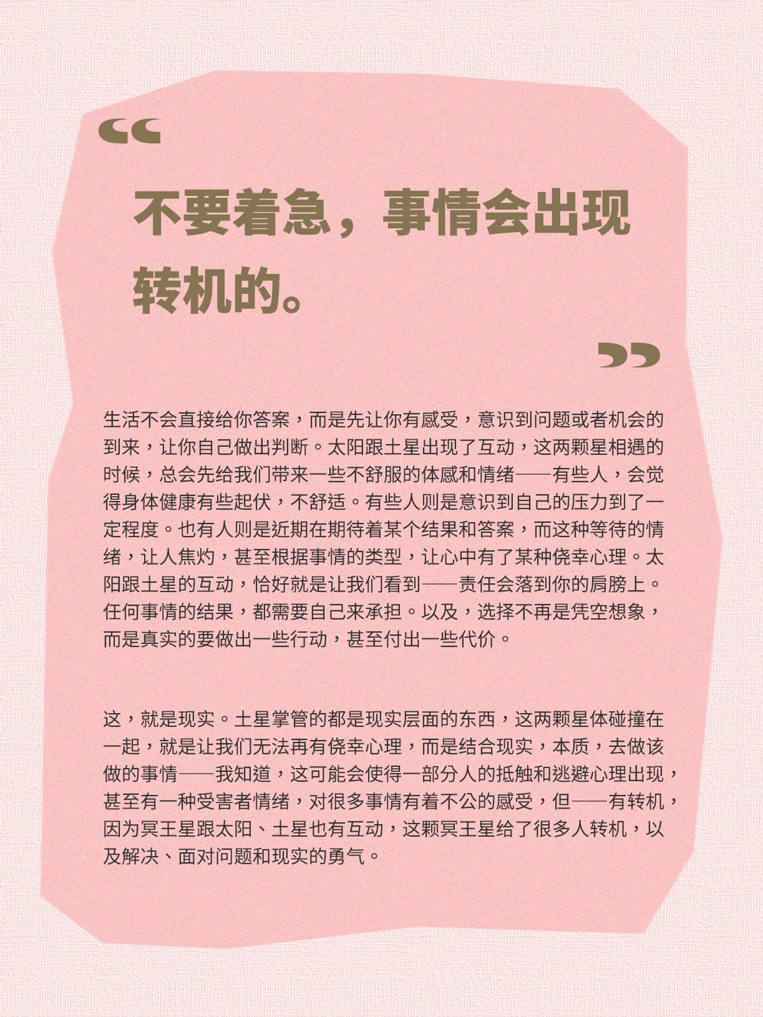 这,就是现实。土星掌管的都是现实层面的东西,这两颗星体碰撞在一起,就是让我们无法再有侥幸心理,而是结合现实,本质,去做该做的事情——我知道,这可能会使得一部分人的抵触和逃避心理出现,甚至有一种受害者情绪,对很多事情有着不公的感受,但——有转机,因为冥王星跟太阳、土星也有互动,这颗冥王星给了很多人转机,以及解决、面对问题和现实的勇气。