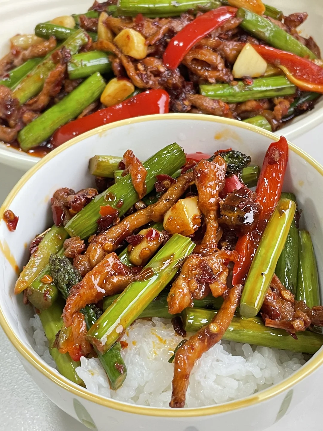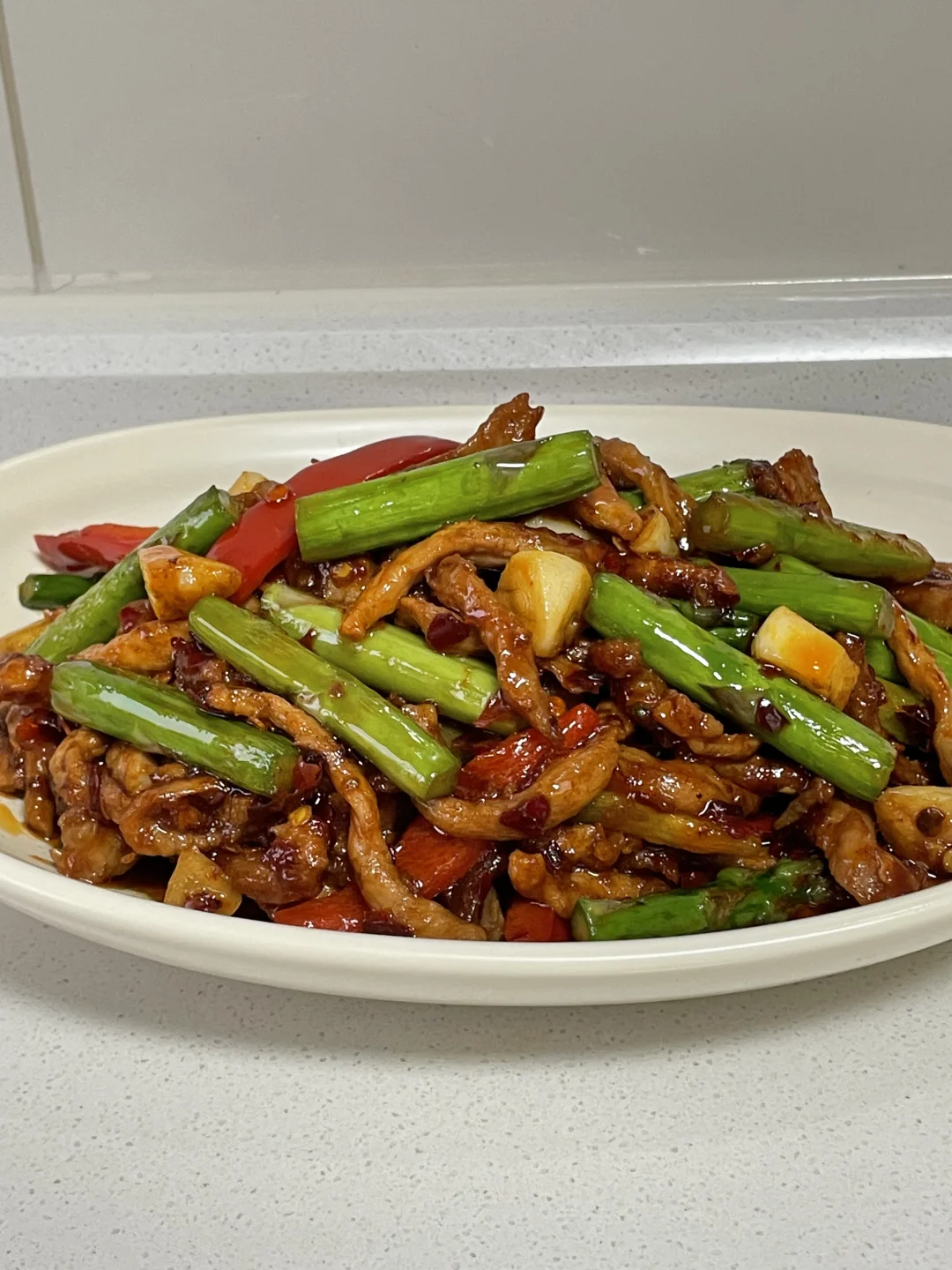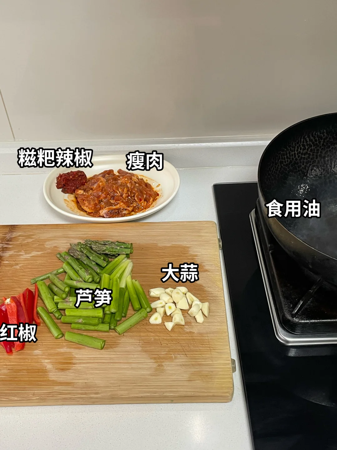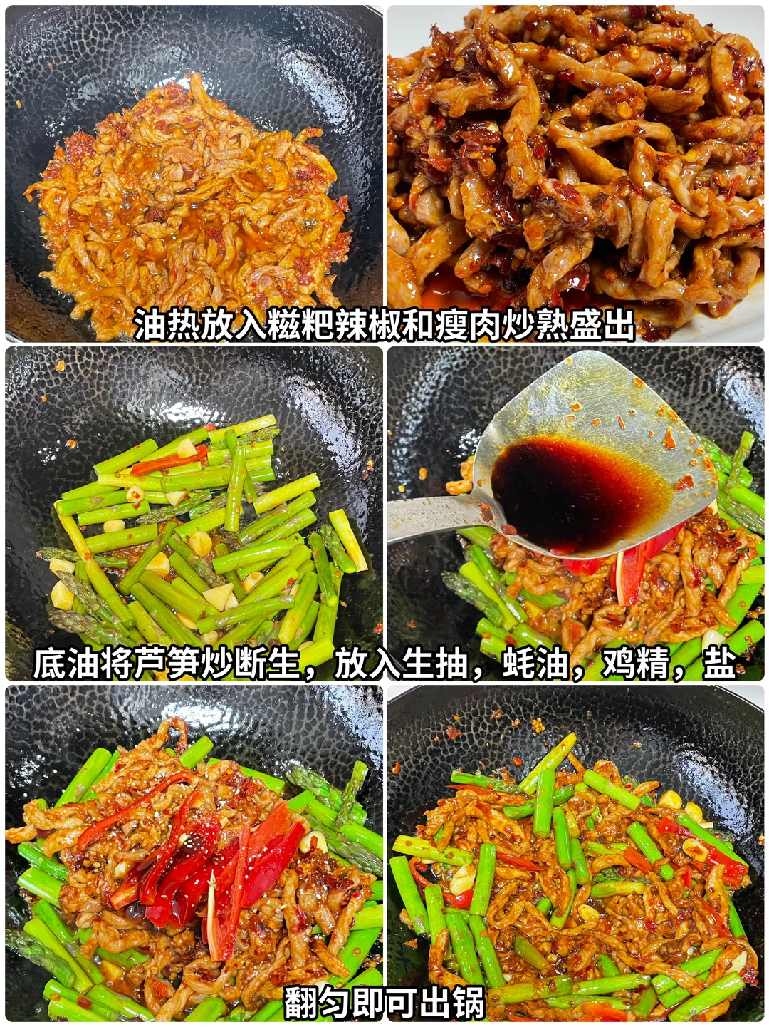 芦笋炒瘦肉的味道,是清新与鲜嫩的完美结合。芦笋爽脆,带着独特的草木清香;瘦肉滑嫩,吸收了芦笋的香气。一口咬下,咸鲜适中,整体口感清爽又营养,是一道让人食欲大开的美味。配米饭真的是绝。 👩🍳 瘦肉腌制:瘦肉切丝,放入生抽、胡椒粉、淀粉、豆瓣酱、一点花雕酒抓匀腌制10分钟。 起锅烧油,油热将瘦肉和准备好的糍粑、辣椒下锅炒香,瘦肉滑熟,盛出锅里的底油,将芦笋炒断生。然后加入瘦肉和彩椒放入1勺生抽,半勺蚝油,适量的盐,鸡精,翻匀即可出锅