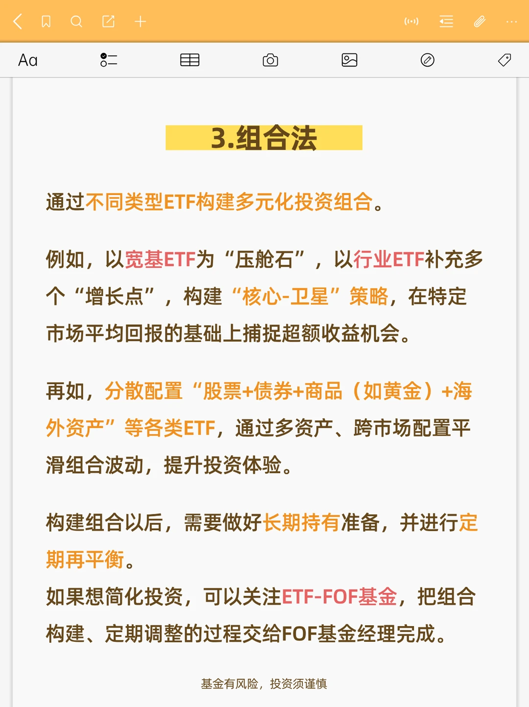 🌰再如,分散配置“股票+债券+商品(如黄金)+海外资产”等各类ETF,🌐通过多资产、跨市场配置平滑组合波动,提升投资体验