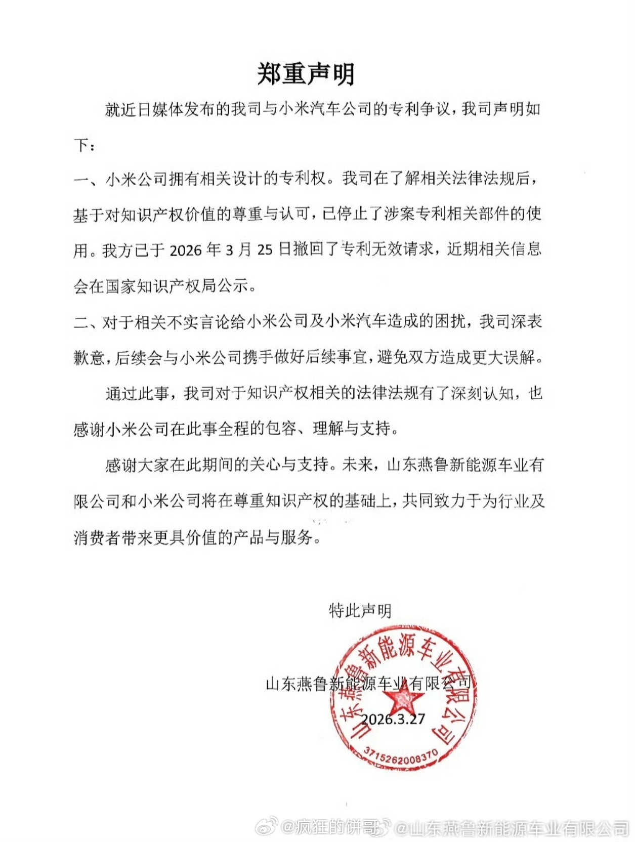 老头乐向小米汽车致歉 老头乐这事没有撕破脸,有个大结局了,25日的时候还说和解内