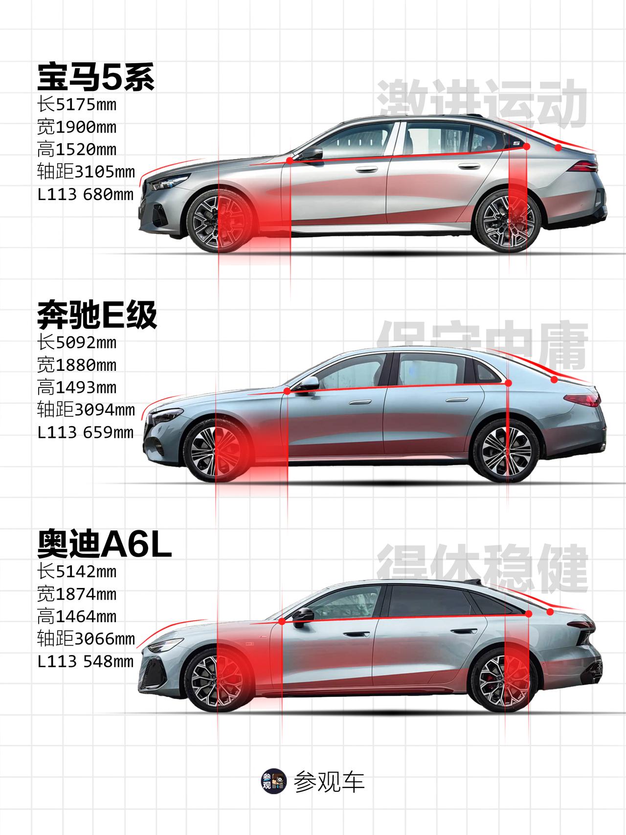 宝马5/奔驰E/奥迪A6L,谁最有分寸感? 宝马5是吴镇宇,奔驰E是陈道明,全新奥迪A6L是刘德华? 看车先看侧面,三台C级豪华旗舰各有特色的轮廓和型面,鲜明地体现出了不同的人格调性 宝马5尾部极致溜背,强调激进运动,达到680mm的L113为了塑造性能感而牺牲了不少内部空间,过于鲜明的车身线条与凌厉的型面转折将“端庄稳重感”抛之脑后,前脸复杂的线条与狰狞的表情在用力地强调存在感 奔驰E尾部同样很溜,659mm的长L113似乎在强调运动属性,下倾明显的引擎盖显然不是为了塑造端庄大气的车头,和俯冲且后缀的肩线一样更有一分优雅,但尾窗很小导致D柱厚重肥硕,加上直立的B柱与C柱又过于强调稳定而非动感,有点想起了自己“坐奔驰要稳”的标签 分寸感拿捏的最得当的,我觉得是全新奥迪A6L,体态轮廓端庄均衡,L113 548mm将车内空间更多释放给了乘员舱,水切平直且DLO拐点趋近后轮末端,营造宽阔通透的后排空间,尾箱拐点靠前既有得体的稳重感,又增加了后备箱开口面积的实用性 但车鼻下压明显,姿态趋势俯冲,裙线上扬、肩线更加动感,型面饱满挺阔,再加上纵向大格栅拉低前脸视觉重心,熏黑雾灯区、运动套件与引擎盖起伏特征,在稳健的框架内又尽可能地彰显着其时代属性 如果用人来比喻,宝马5系 更像不羁张扬的吴镇宇,奔驰E级 更像传统老钱的陈道明,而奥迪A6L 更像得体雅致的刘德华,你更喜欢谁?谁更能在影坛长青?