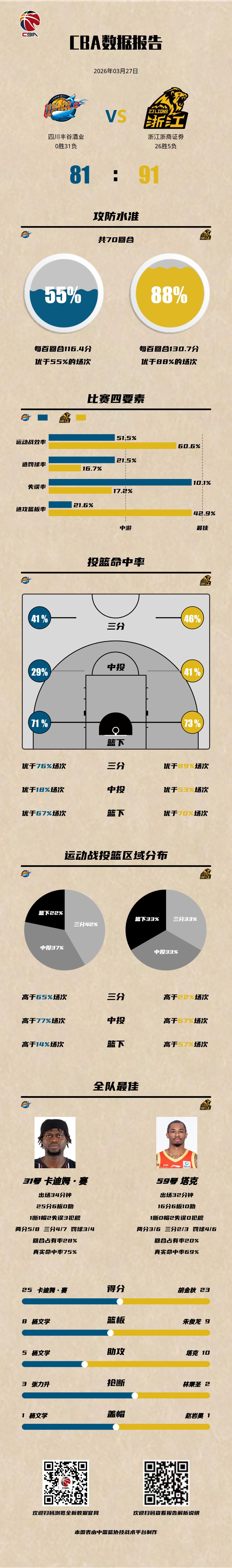 四川丰谷酒业 81-91 浙江浙商证券四川男篮vs广厦男篮 四川丰谷酒业:卡迪姆 ·赛25分6篮板,景菡一20分5助攻,左朕年13分; 浙江浙商证券:胡金秋23分4篮板,塔克16分6篮板10助攻,朱俊龙15分9篮板。以城之名