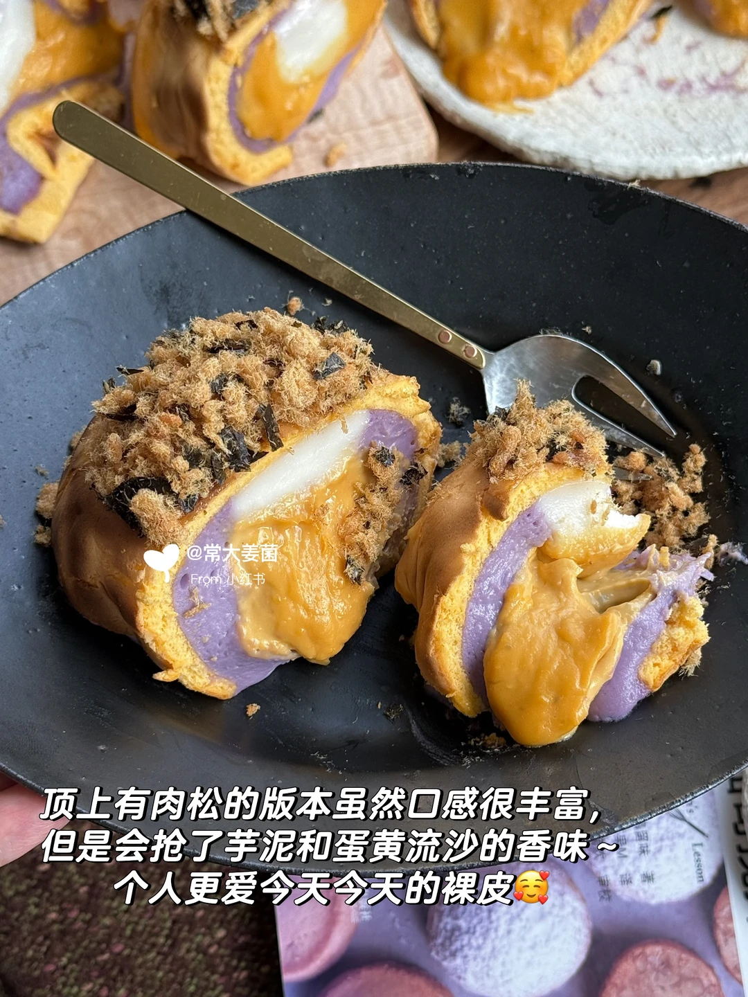 芜湖👩🏻🍳芋泥麻薯蛋黄系列又来喽! 上次外面过裹了海苔肉松, 这次索性用单纯的虎皮卷做外衣😎 🥚🥚虎皮卷的蛋香味好浓郁!好浓郁! 不会抢了芋泥和蛋黄的香 (个人更喜欢这次不带肉松的版本)