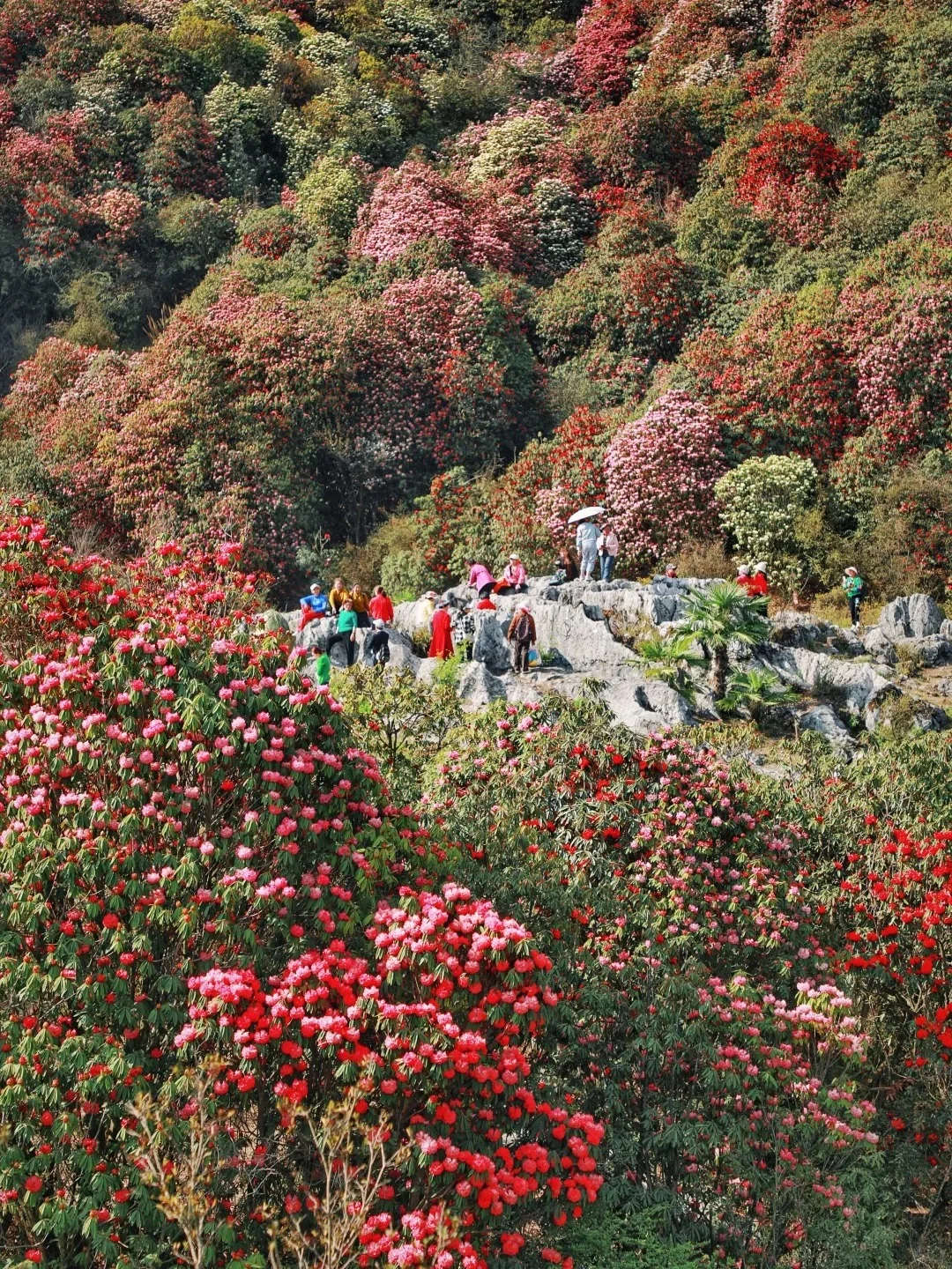 ▪️ 3月下旬-4月中旬(盛花期):41种杜鹃次第绽放,百花坪五彩斑斓,览胜峰红白交织成海