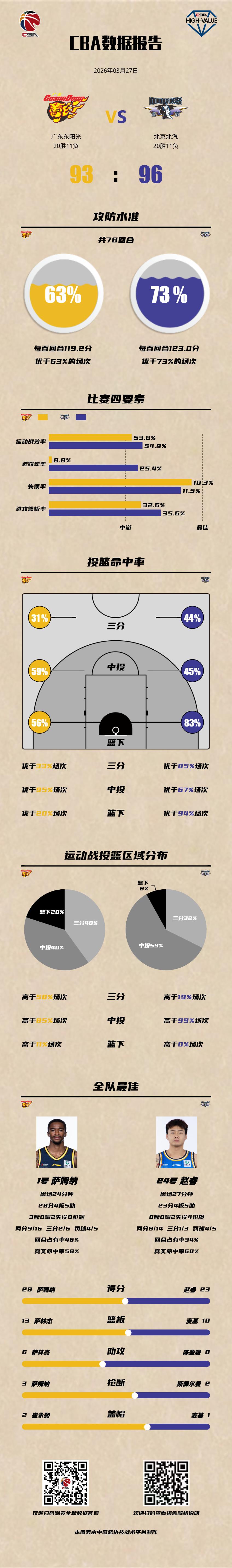 广东东阳光 93-96 北京北汽 广东男篮vs北京男篮 广东东阳光:萨姆纳28分4篮板5助攻3抢断,崔永熙17分4篮板2盖帽,胡明轩10分3篮板3助攻; 北京北汽:赵睿23分4篮板5助攻,杰曼20分5篮板,麦基12分10篮板。以城之名