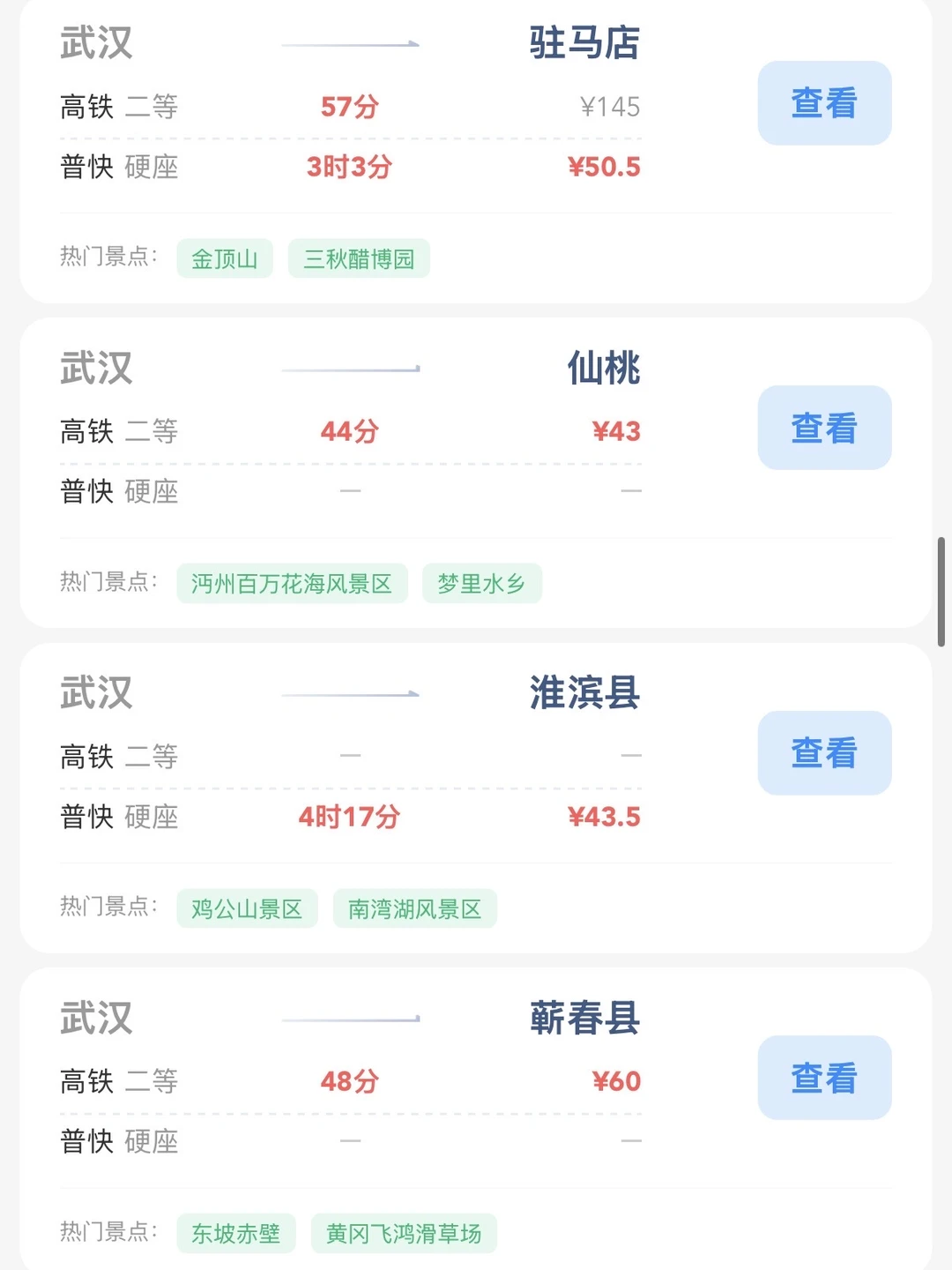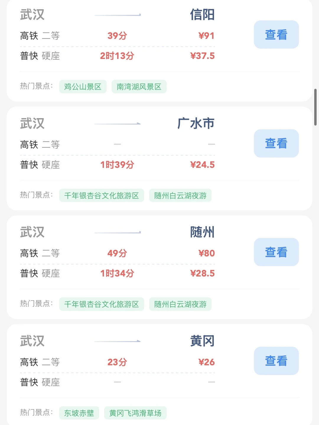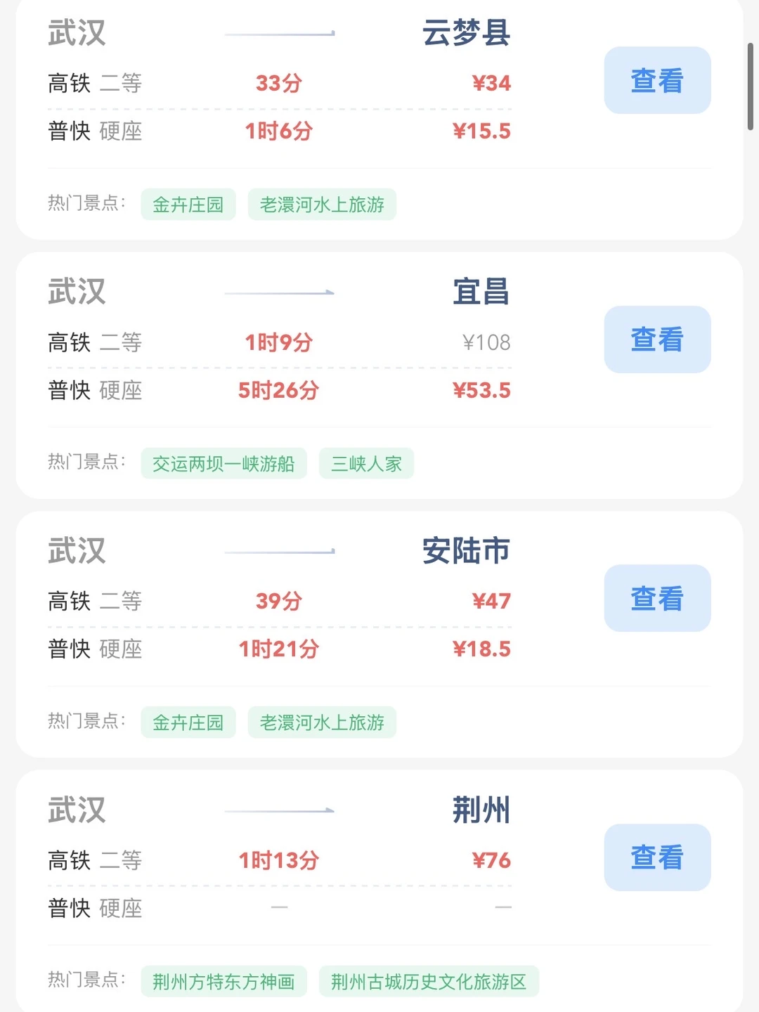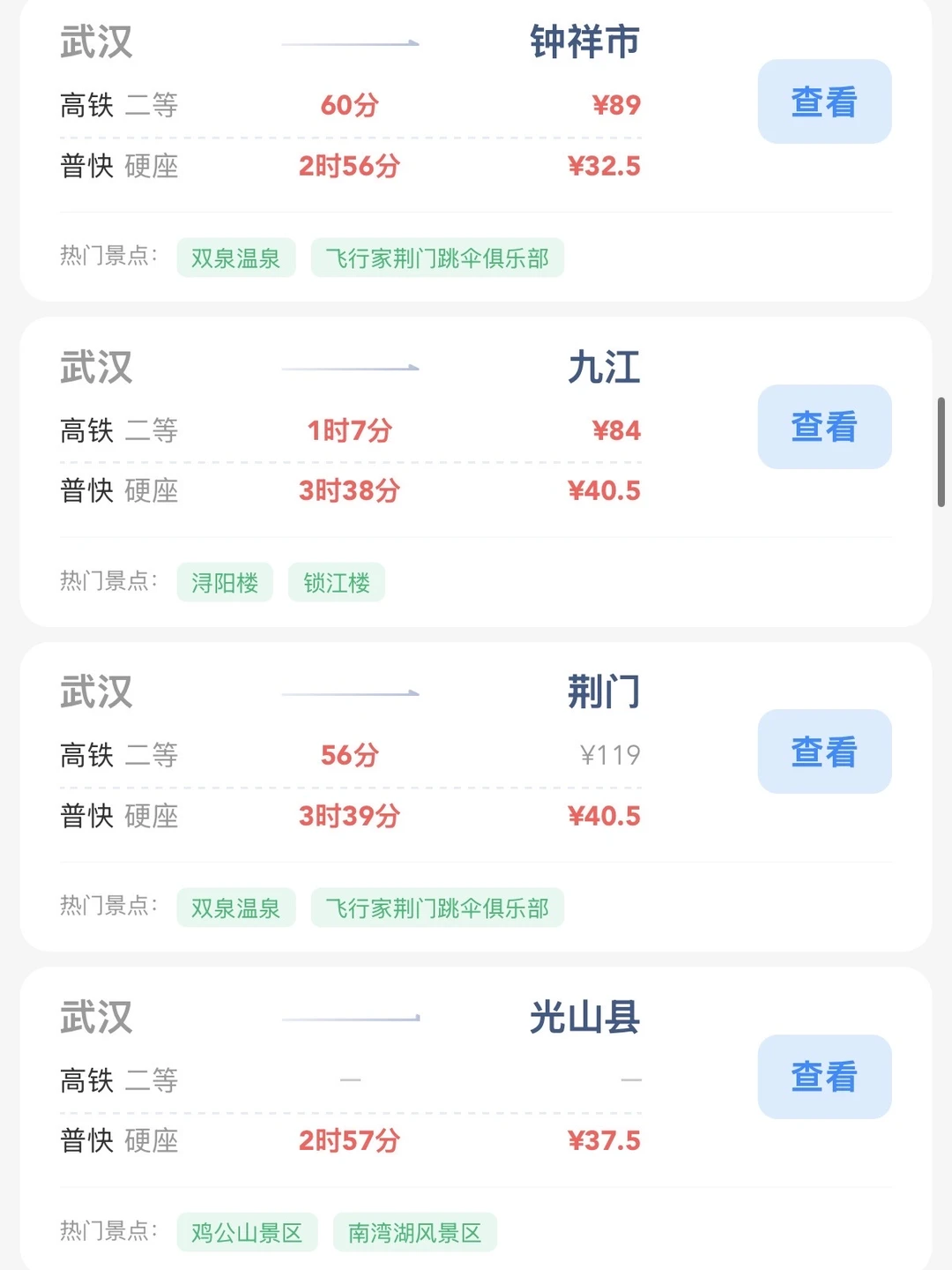 熬夜帮大家整理出了一份武汉出发一百块的火车票就能直达的旅游城市合集