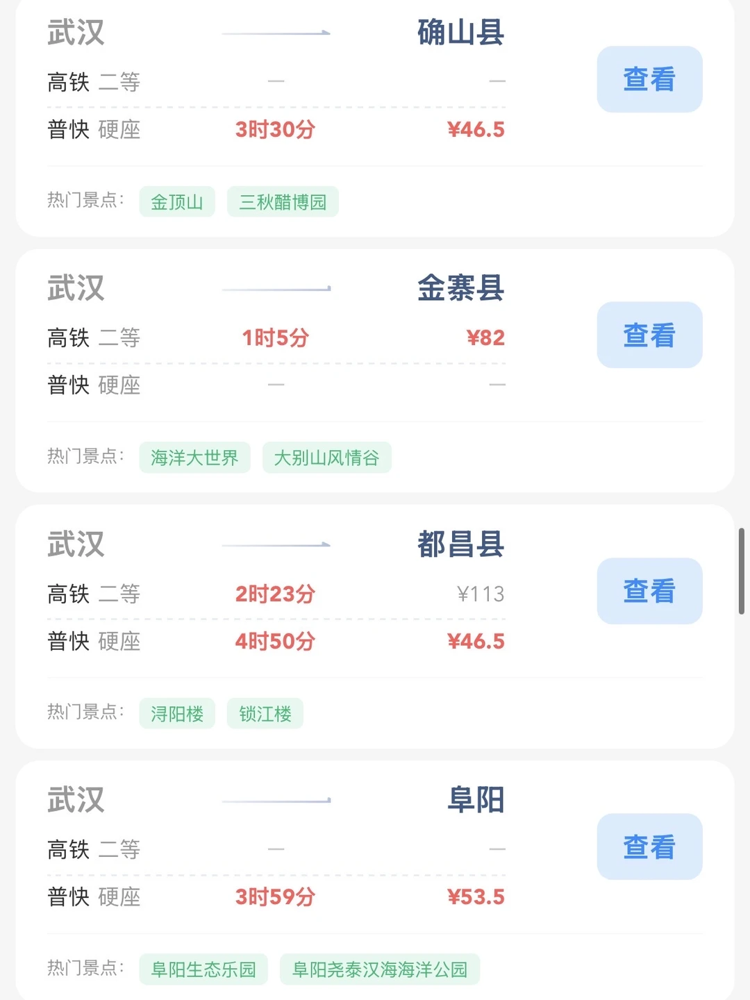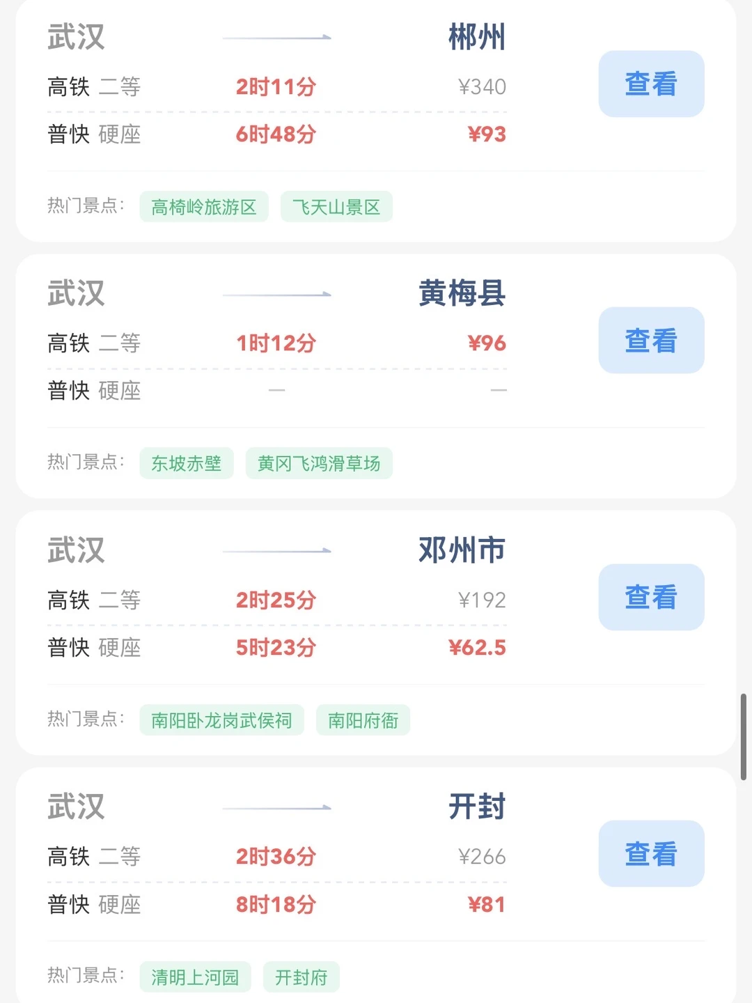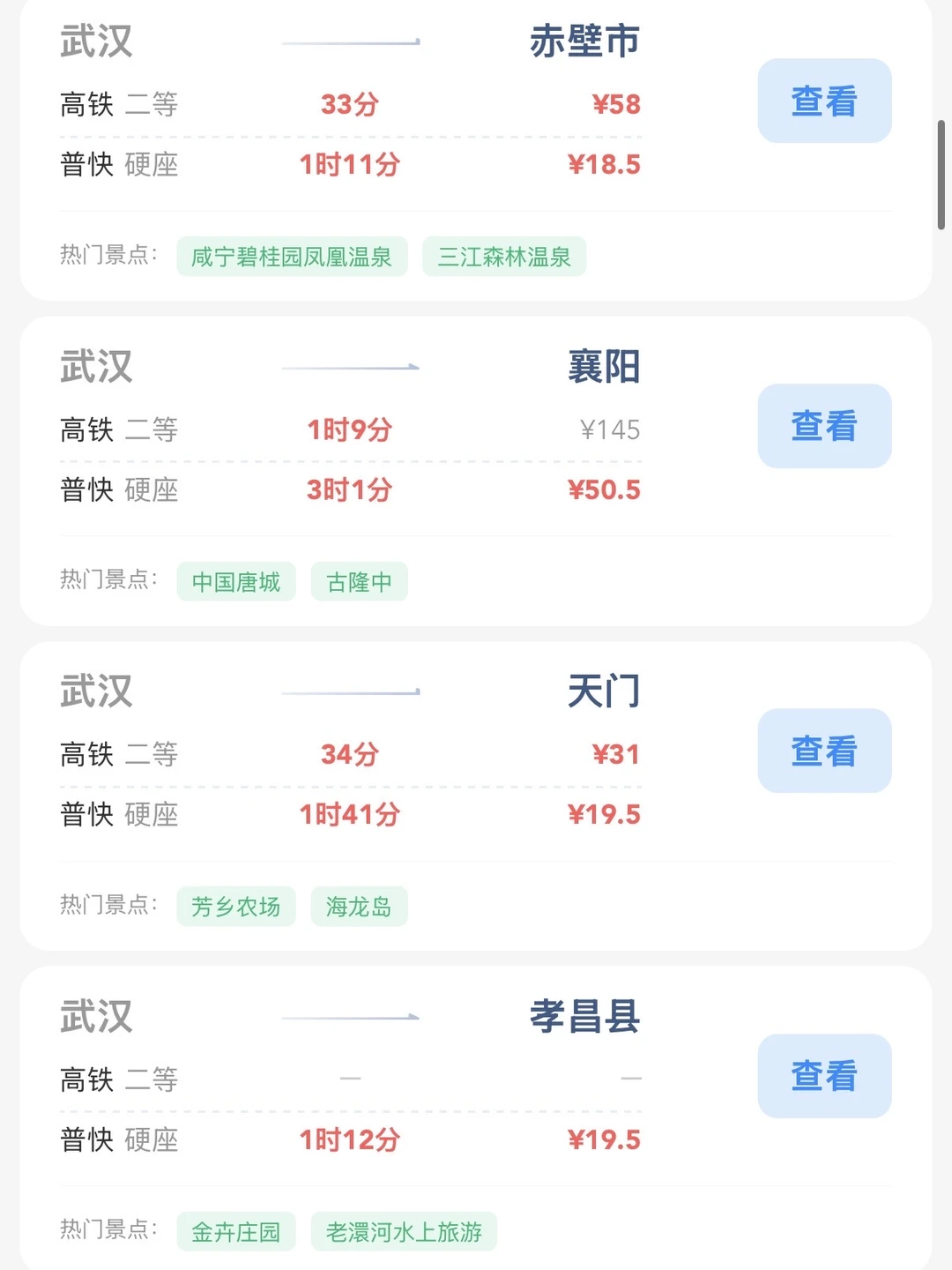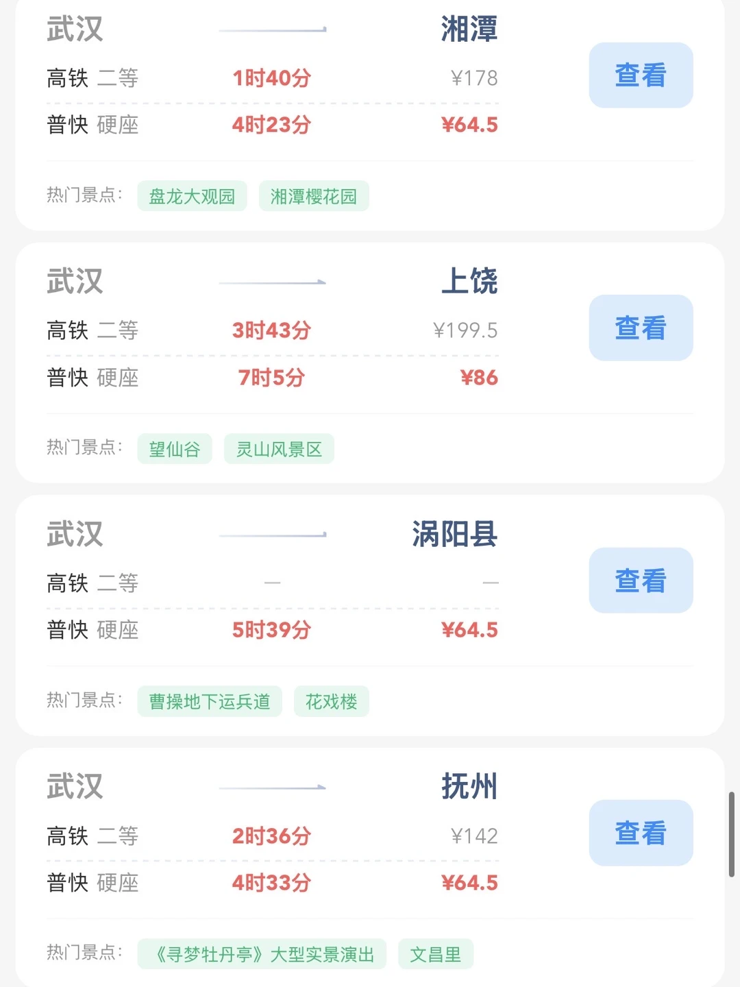 熬夜帮大家整理出了一份武汉出发一百块的火车票就能直达的旅游城市合集