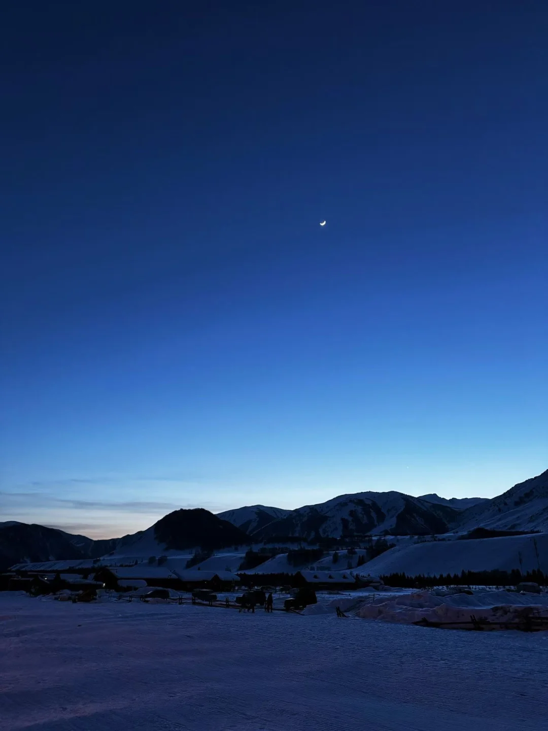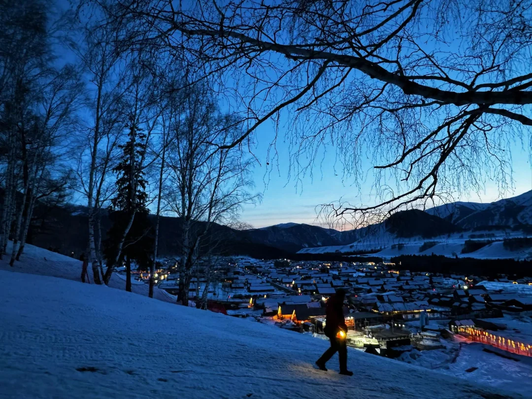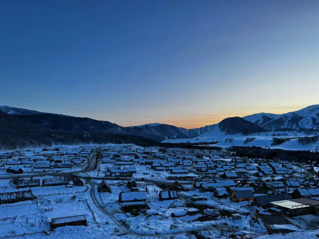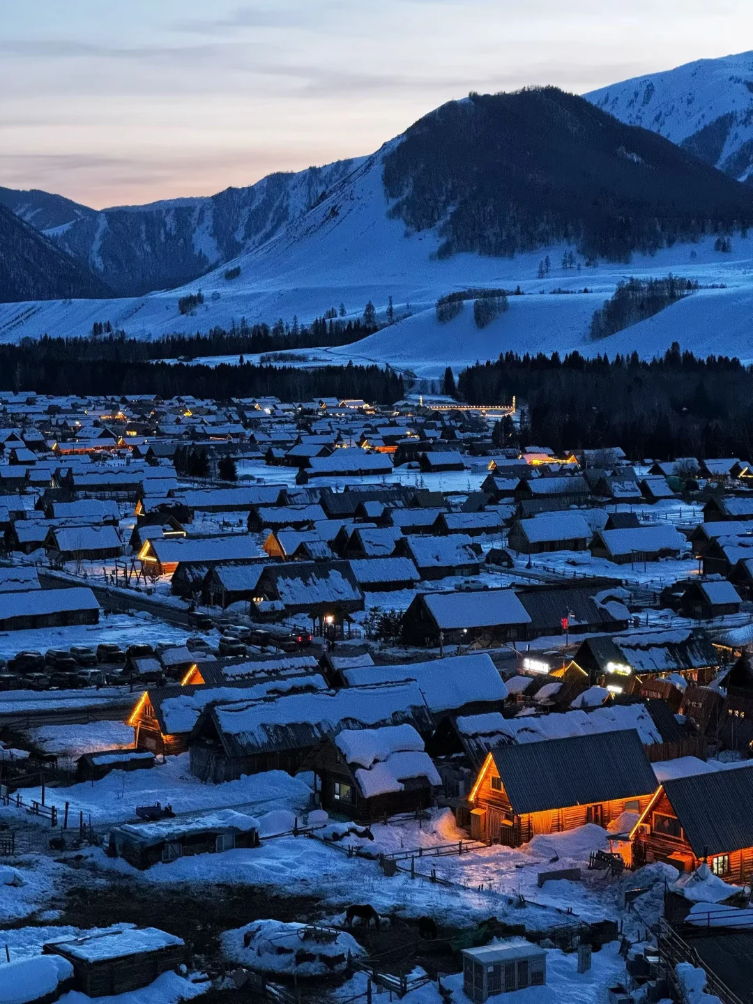 日落后的禾木才是真正的颜值巅峰! 深邃蓝调天幕+雪原木屋+暖黄灯火 氛围感直接拉满 每一帧都美到窒息~