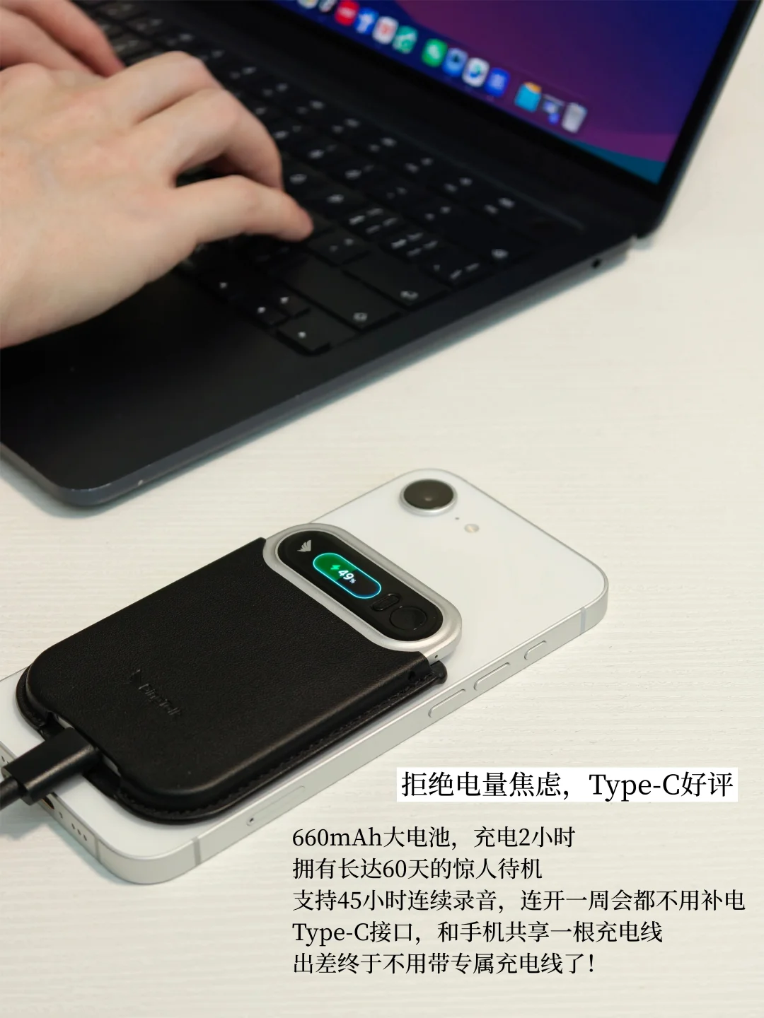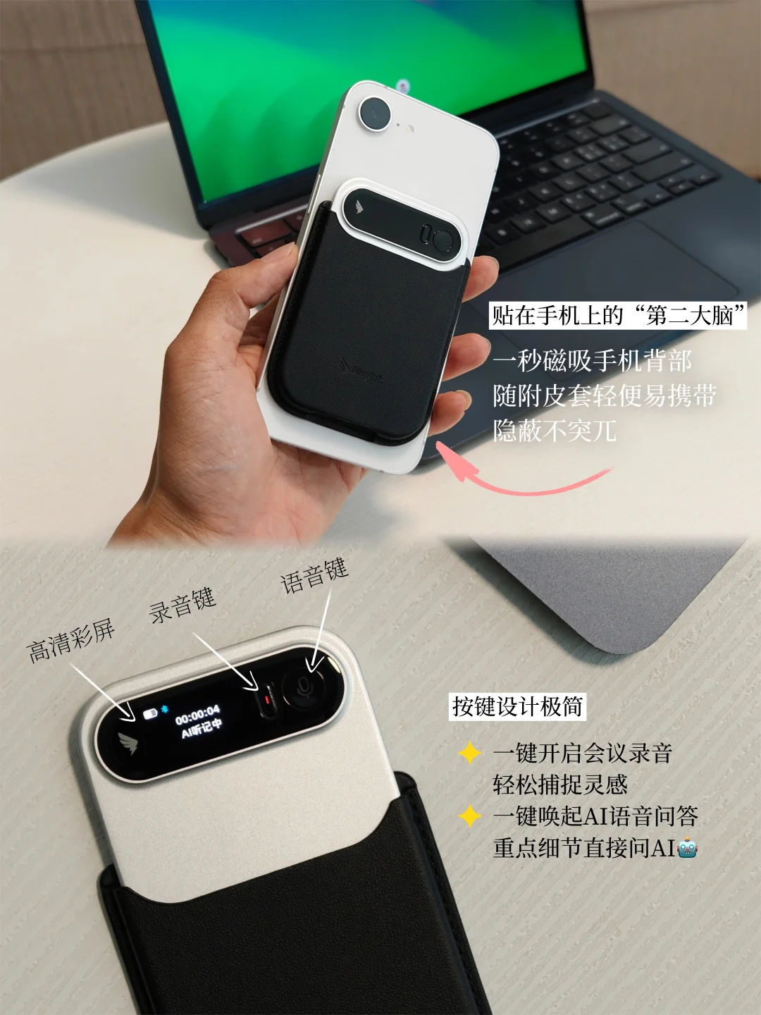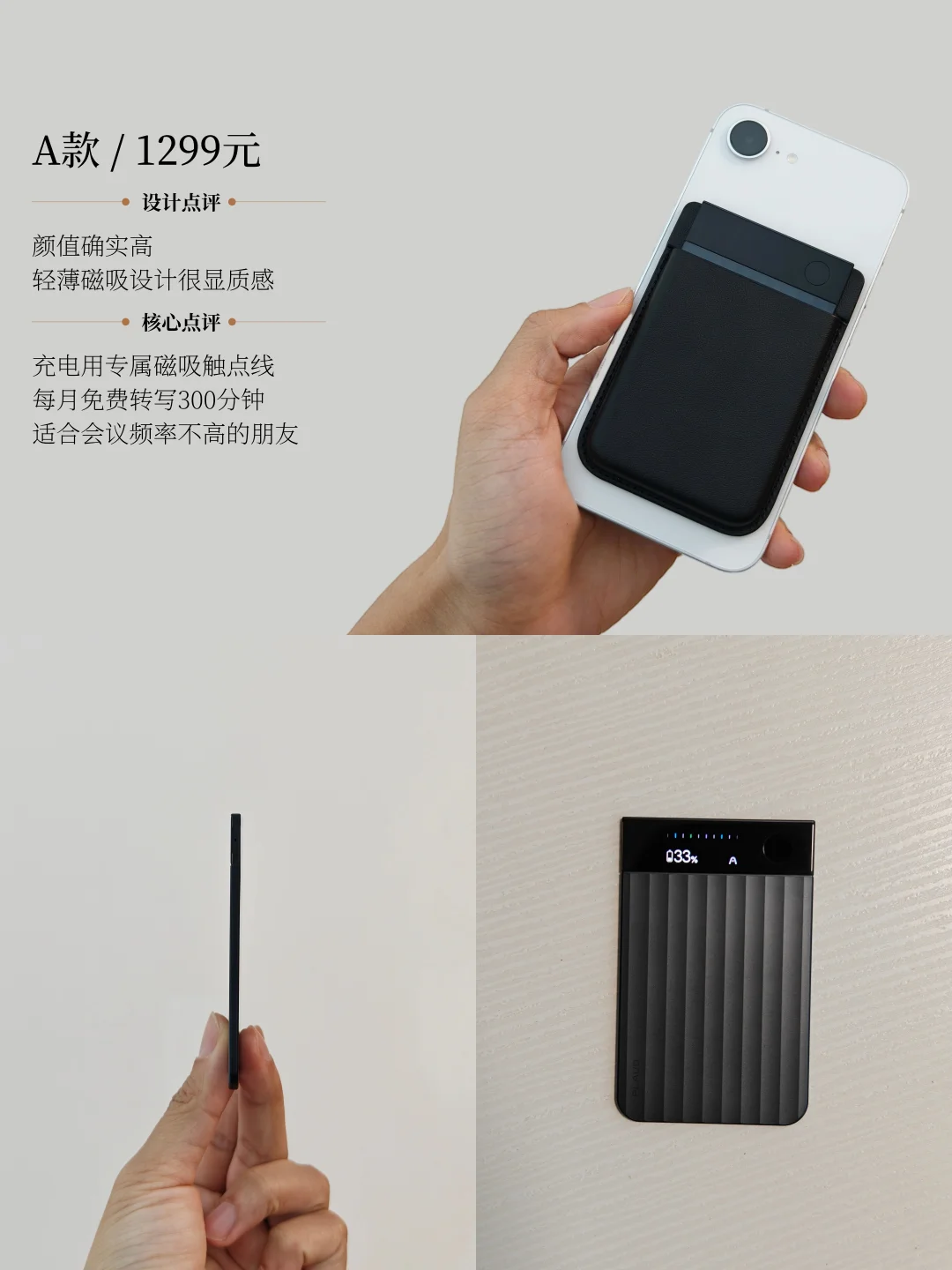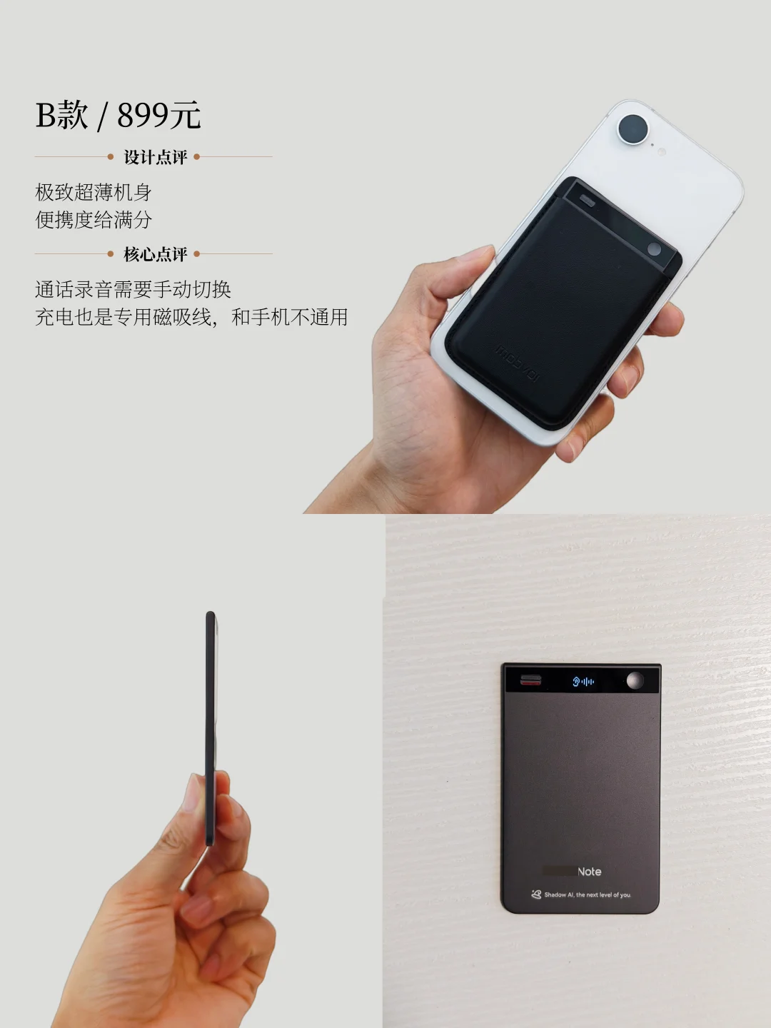 🔵 B款 轻薄便携,揣口袋完全没感觉。Shadow AI的深度分析挺有意思,能生成结构化纪要和思维导图,支持120种语言转写。 通话录音需要手动切换,充电也是专用磁吸线,和手机不通用。