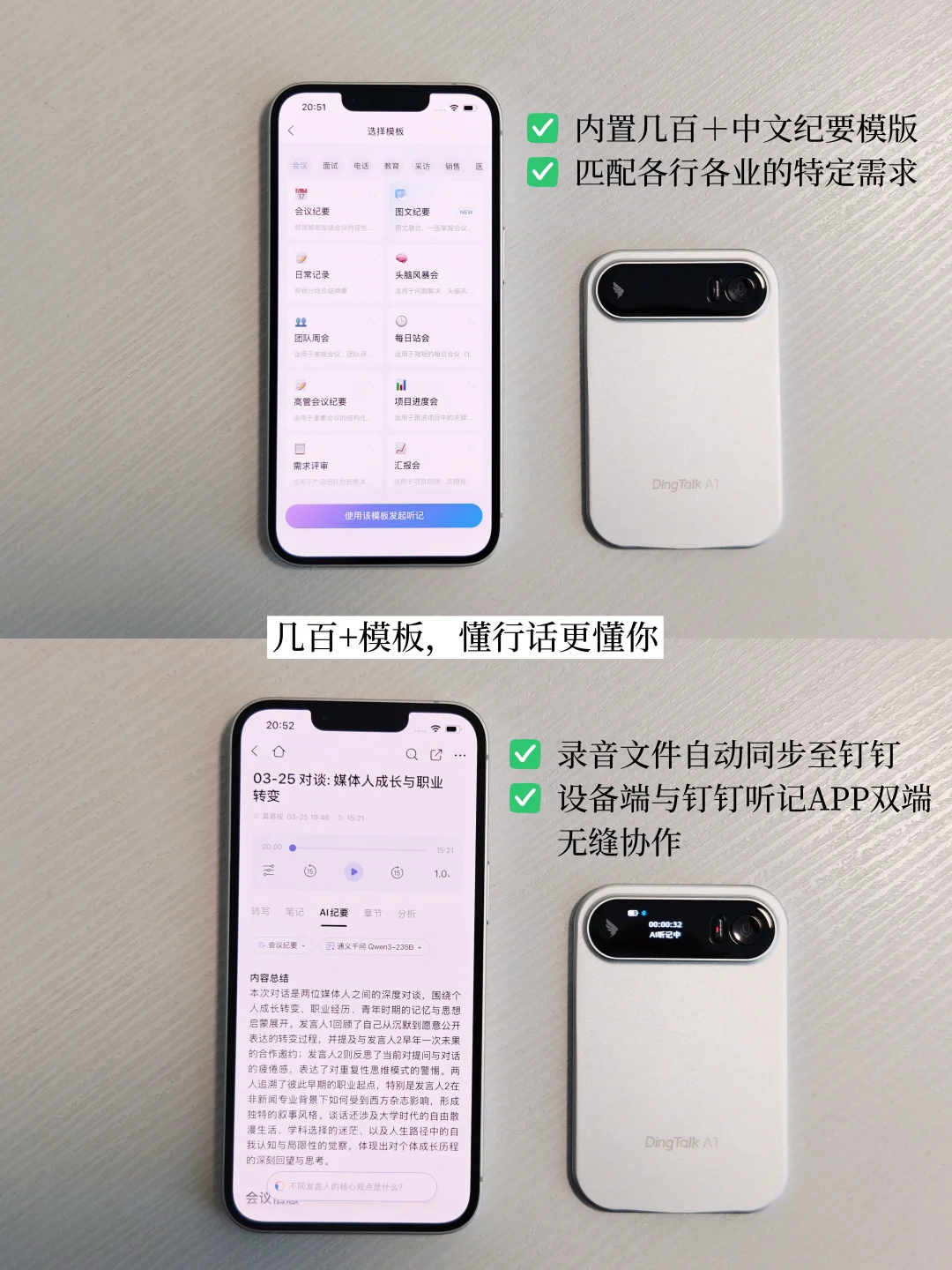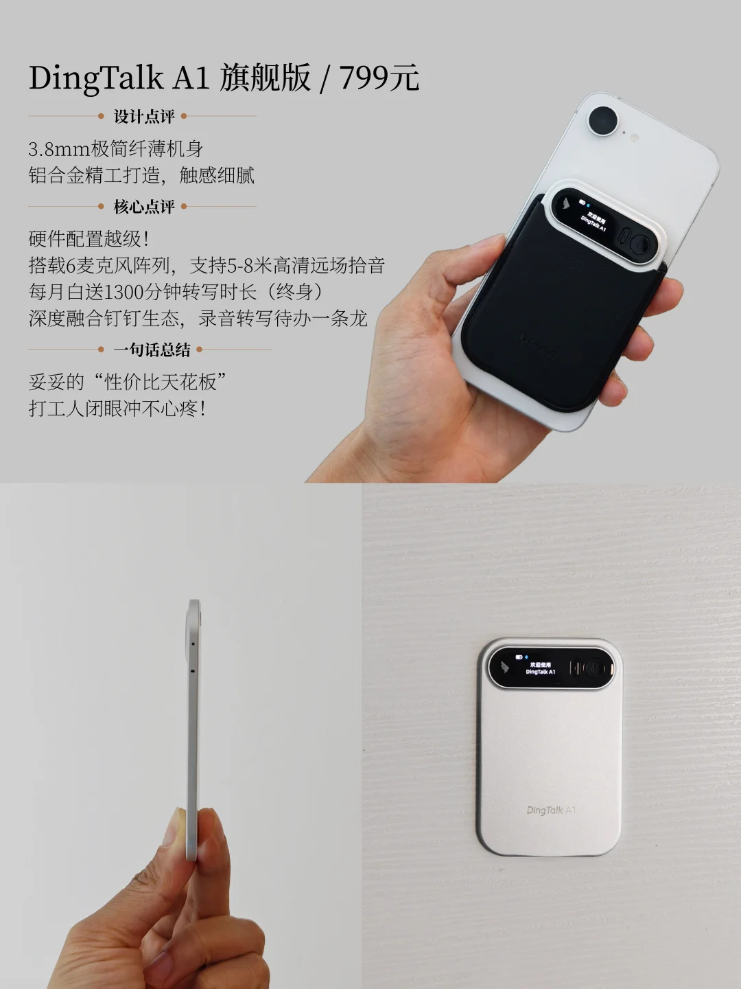 🔵 DingTalk A1 钉钉AI录音卡(我的主力款) 799元,三款里价格最友好。 Type-C充电,手机线直接用,出差不用单独带线,这点真的很省事。每月免费转写1300分钟(终身),高频开会的人基本不用担心额度。 最戳我的是钉钉生态——录完自动同步听记,AI出纪要、抓重点、列待办,一键同步给团队,整个流程不用自己再整理。6麦阵列加上500种场景降噪,会议室角落里说话也能录清楚。