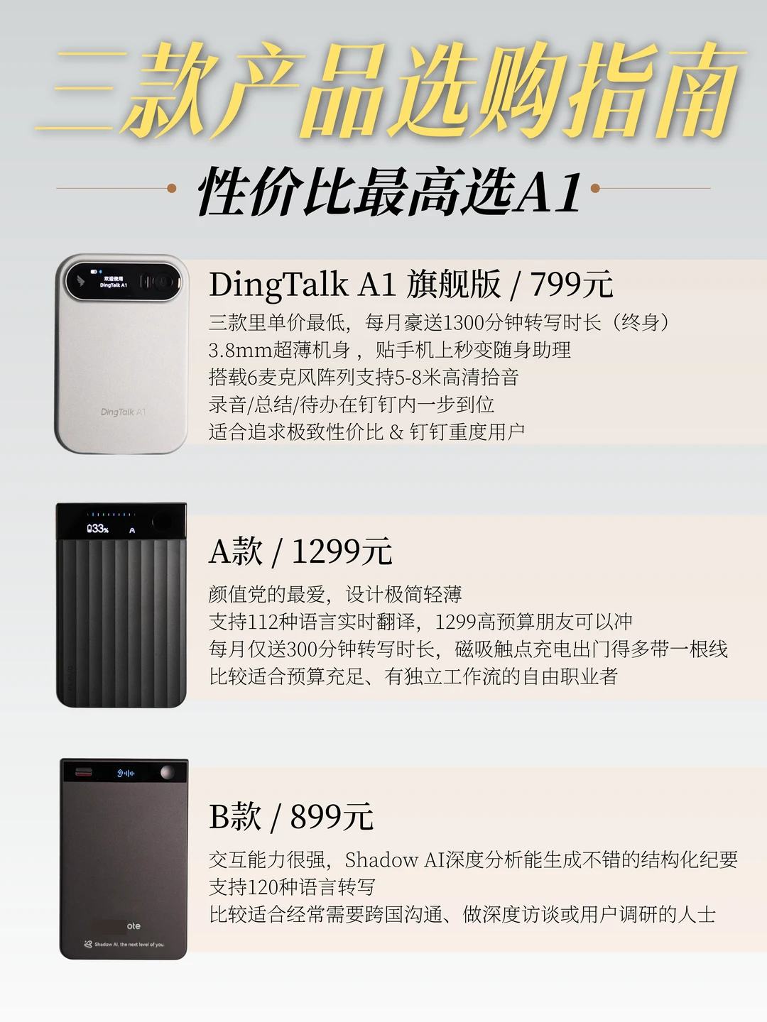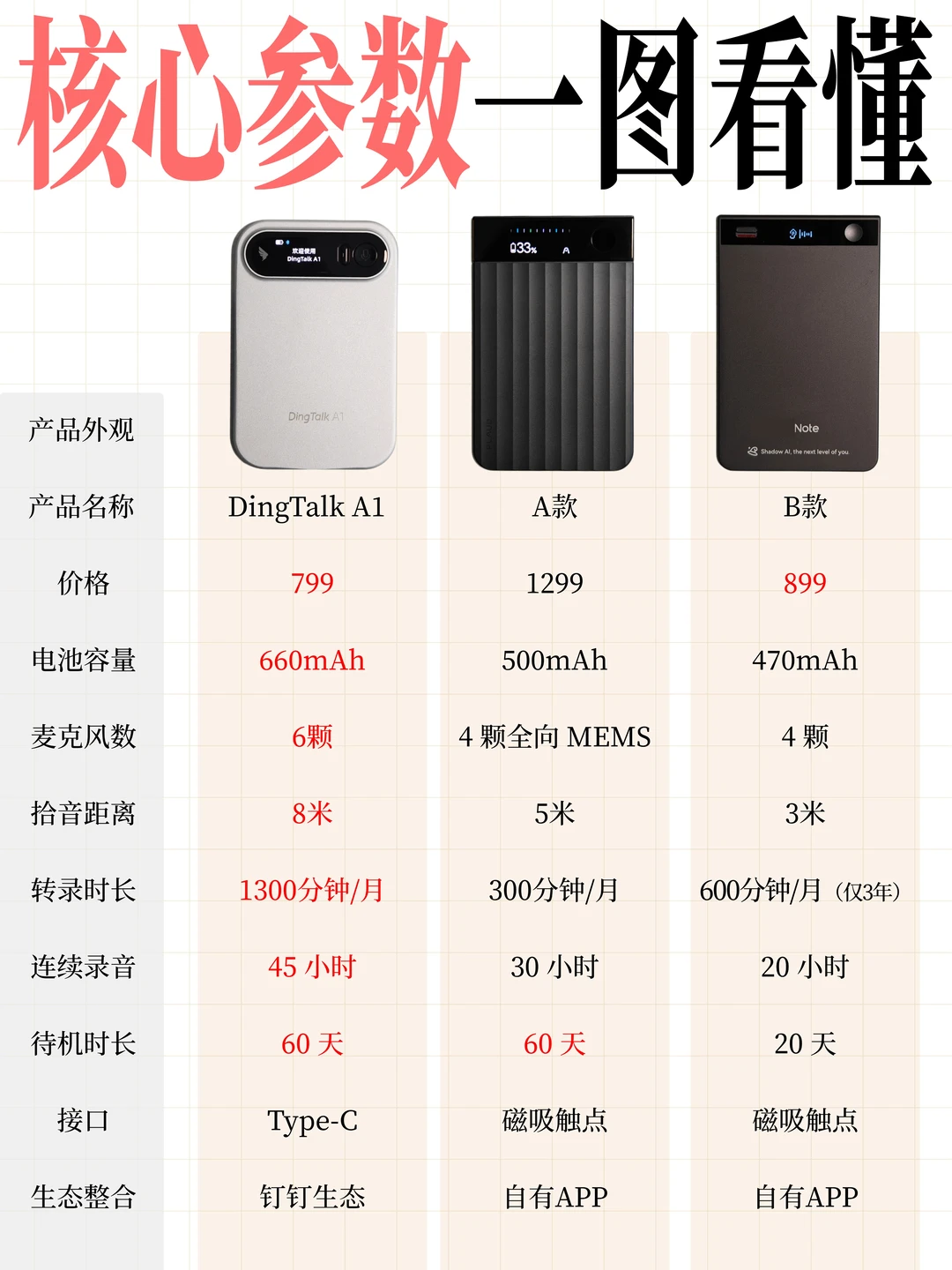 我自己因为钉钉本来就在用,接入最顺手,Type-C充电省一根线,1300分钟额度也最宽裕,所以钉钉A1用得最多。按需选择就好,别跟风👇