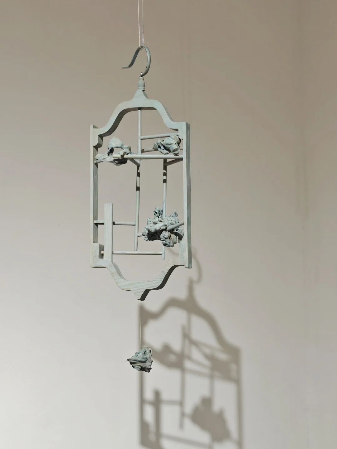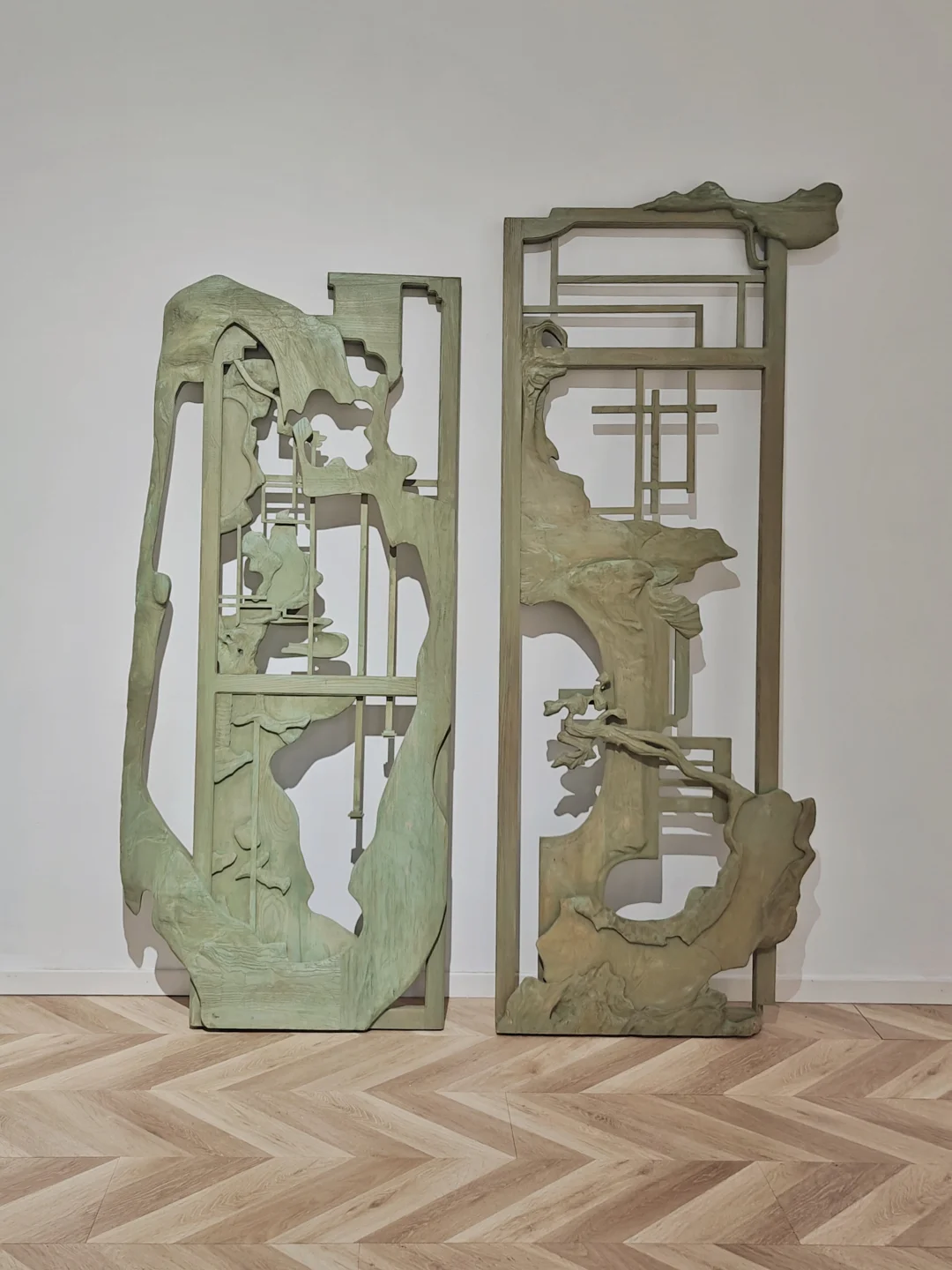 她以俄罗斯榆木、古木残片为材料,把园林“移步换景”的观看之道,压缩为可穿行的雕塑装置。旧木的时间痕迹和手工雕刻的温度相互渗透,镂空和负形让光线成为作品的一部分,沉淀出缓慢厚重的时间仪式感。