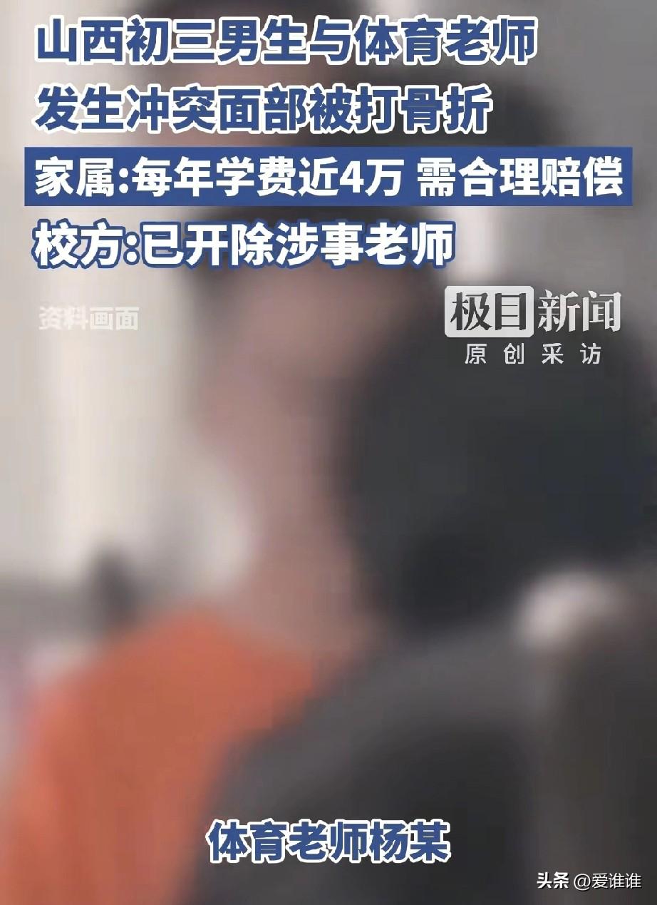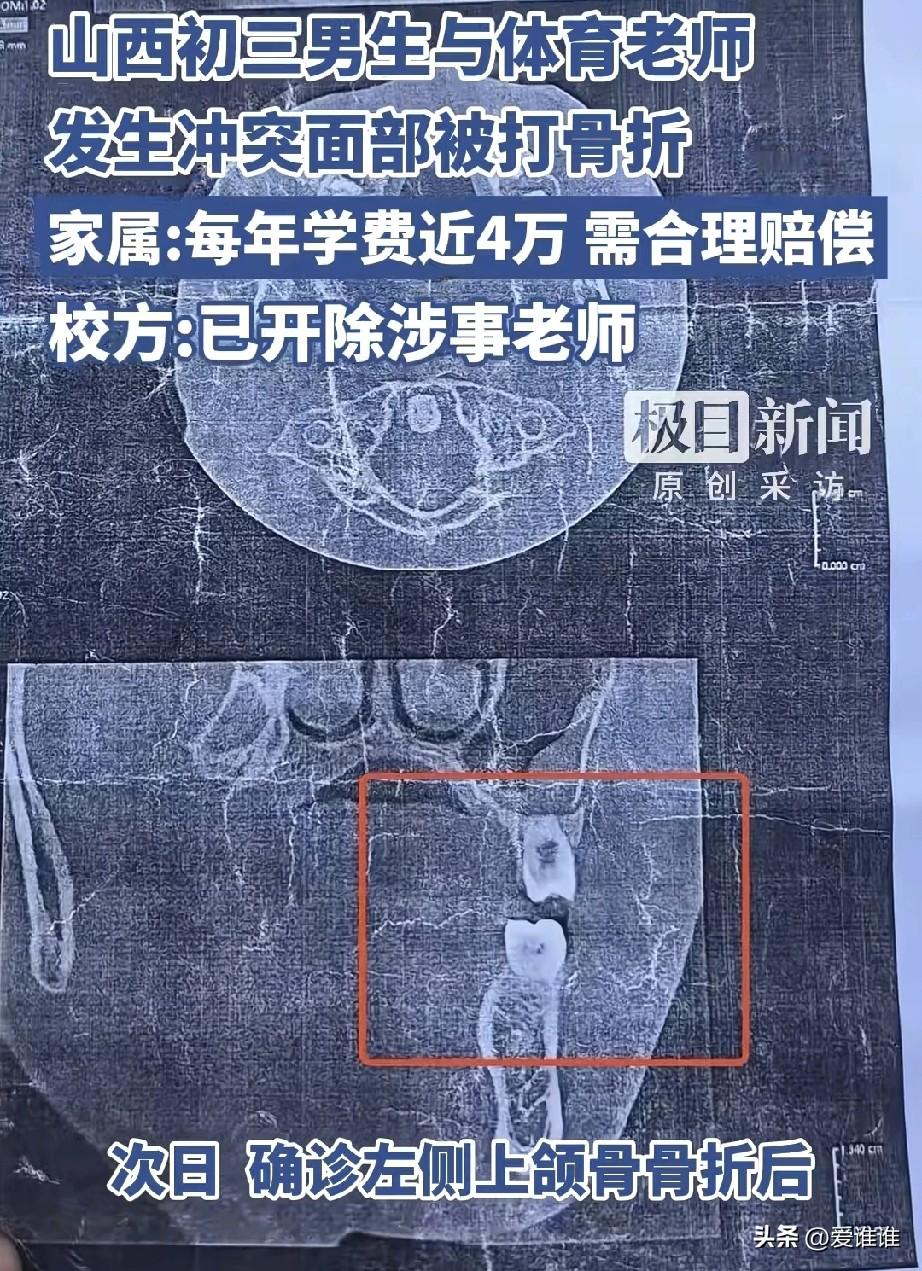 “必须严惩!”初三学生体育课上和老师拌了几句嘴,老师一拳打把学生面部打骨折,目前老师被开除,学校正在和该学生家长谈赔偿! 三月10日,太原某实验学校的操场上,初三学生小郭正上着体育课,带课的老师姓杨,俩人不知因为什么事拌了几句嘴,话赶话的,杨老师突然动了手,一拳打在小郭脸上,孩子当时就蒙了,半边脸疼得厉害,眼前发花,周围的同学也都被吓住了。 事情发生在下午,可到了晚上小郭回到宿舍后,脸上的肿痛不但没消,反而越来越重,他躺在床上翻来覆去睡不着,眼泪止不住地流,学校这边,有老师过来看了一眼,见他脸上肿得高,只给了一片止痛药,让他先忍着,既没送医院,也没打电话告诉学生家里,对住校的孩子来说,那一刻又疼又怕,身边连个亲人都没有。 第二天,也就是3月11日,小郭的脸已经肿得变了形,等到中午,学校才觉得不对劲,赶紧把他送到医院,一检查左侧上颌骨骨折、错合畸形,还带着上颌窦囊肿。 医生说伤势不轻,眼下没法马上手术,只能先靠身体慢慢恢复,以后还可能留下骨质增生,能不能完全好利索还说不准。 直到这时候,小郭的家人才接到学校电话,得知孩子被打骨折了,他姑姑郭女士赶到医院,看着侄子的脸肿得像馒头,眼眶青紫,心里又气又疼,随后,她向教育局和派出所反映了情况,警方很快立案,伤情鉴定也在进行。3月20日,家长、学校和教育局开了个协调会,但因为赔偿问题没谈拢。 3月26日,校方一位负责人出面回应,说打人的杨老师还在试用期,已经被开除了,也承认老师没控制住情绪,至于为什么事发当晚没及时送医、没通知家长,她解释说是当天晚上老师带孩子去检查,但时间晚了没拍成CT,第二天一早才补拍;而没联系家长,是因为觉得学校里男孩子多,磕磕碰碰难免,每个老师处理方式不一样,等第二天确诊骨折了才意识到严重,赶紧通知了家属。 目前小郭已经回学校上课,但脸上的伤还没好利索,一家人还在等着伤情鉴定结果,也等着一个公正的说法。 我希望这起事件最终能得到公正的处理,不仅还受伤学生一个公道,更能给所有教育工作者敲响警钟:教鞭之下,应有敬畏;三尺讲台,不应有暴力!
