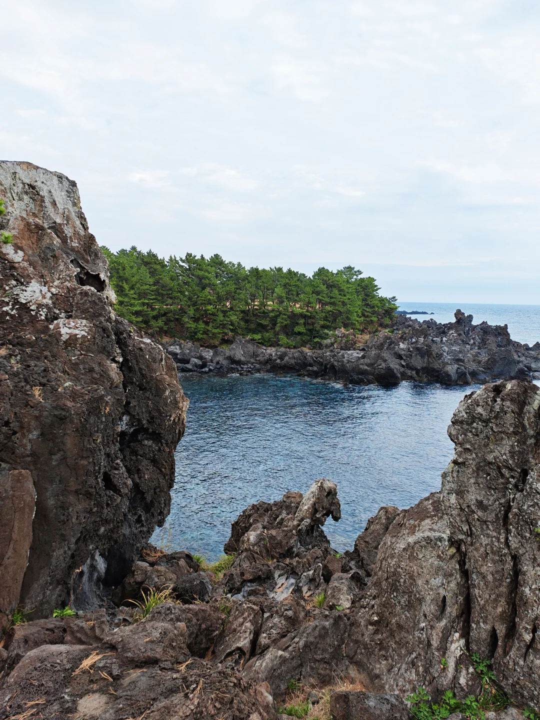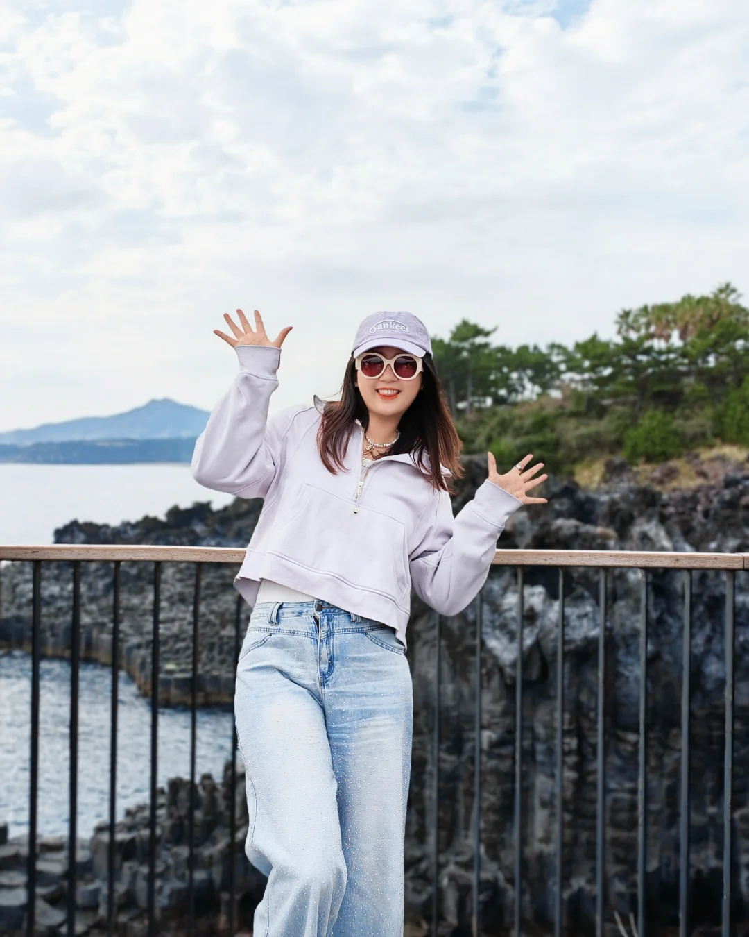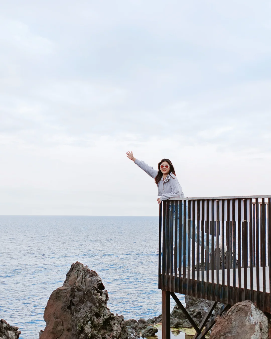 前往西归浦的自然遗产。这里是火山熔岩遇海水冷却后形成的六边形石柱群,海浪拍打在黑色礁石上,场面壮观且治愈。沿着木质栈道步行,从不同角度欣赏大自然的鬼斧神工。这里风大,建议备一件薄外套。游览时间约40分钟