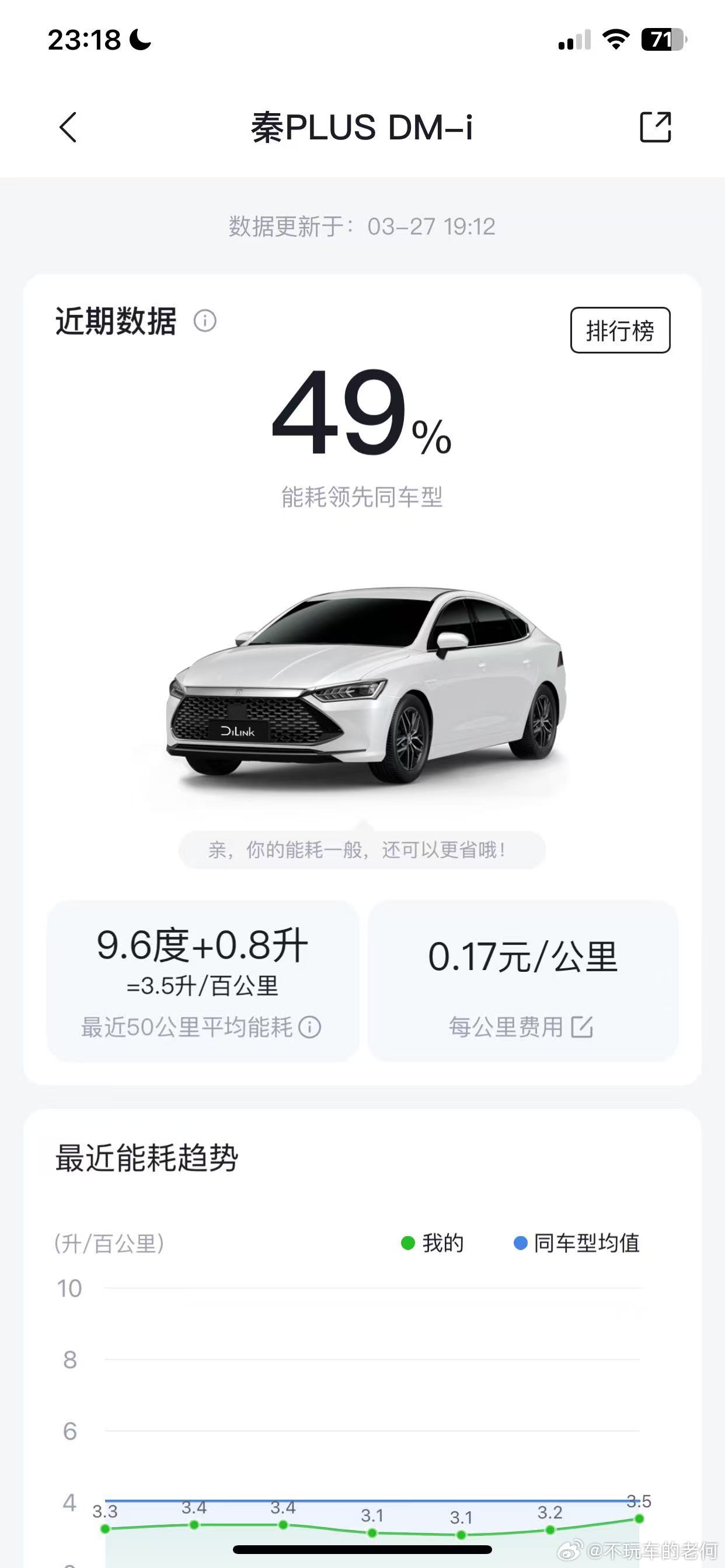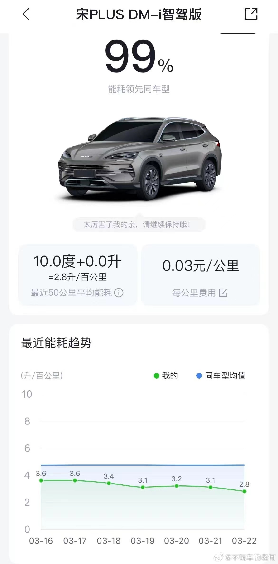 贴几张身边真实混动车主的油耗。今天车友群里几个人在发下一轮油价要降的新闻,目前预计要降0.06-0.07元。大家都说说调整一下2块钱,暴跌0.06。不过记得刚涨完价的第二天,的确感觉路上开车的燃油车都老实了不少今天正好说到这个事情,我就问了身边几个比亚迪的车主,想知道dmi的真实油耗是多少。反正众所周知厂家宣传从来都和真实有出入,比亚迪对外说的是OTA后百公里2.6L油耗,现在出到了第五代DM,那老车主的油耗怎么样,有没有那么低。图二是在北海的一个老朋友,初代秦plus dmi车主,也就是21年买的顶配15万那批。今晚上截的油耗百公里9.6度+0.8升,折合0.17元/公里。图三是23年的初代海豹dmi(21万买的),综合算是2.5l/百公里,也就是2毛左右/百公里。图四图五就不细说了,都是差不多的数据。所以我问他们是不是油价上涨不心疼,答曰的确是。可油可电怎么开都省,插混从从容容游刃有余。这还是老一批车主的数据,今年混动车的方向是大电池,出行成本只会更低(比如我一个铁哥们有台初代海鸥,7分钱一公里,还问我为啥不问他的数据)。今年混动车型的纯电续航普遍提升到200公里以上,满油满电的综合续航都有2000公里左右了,那是真的通勤不怕,长途不慌。比亚迪新能源大牛说汽场全开