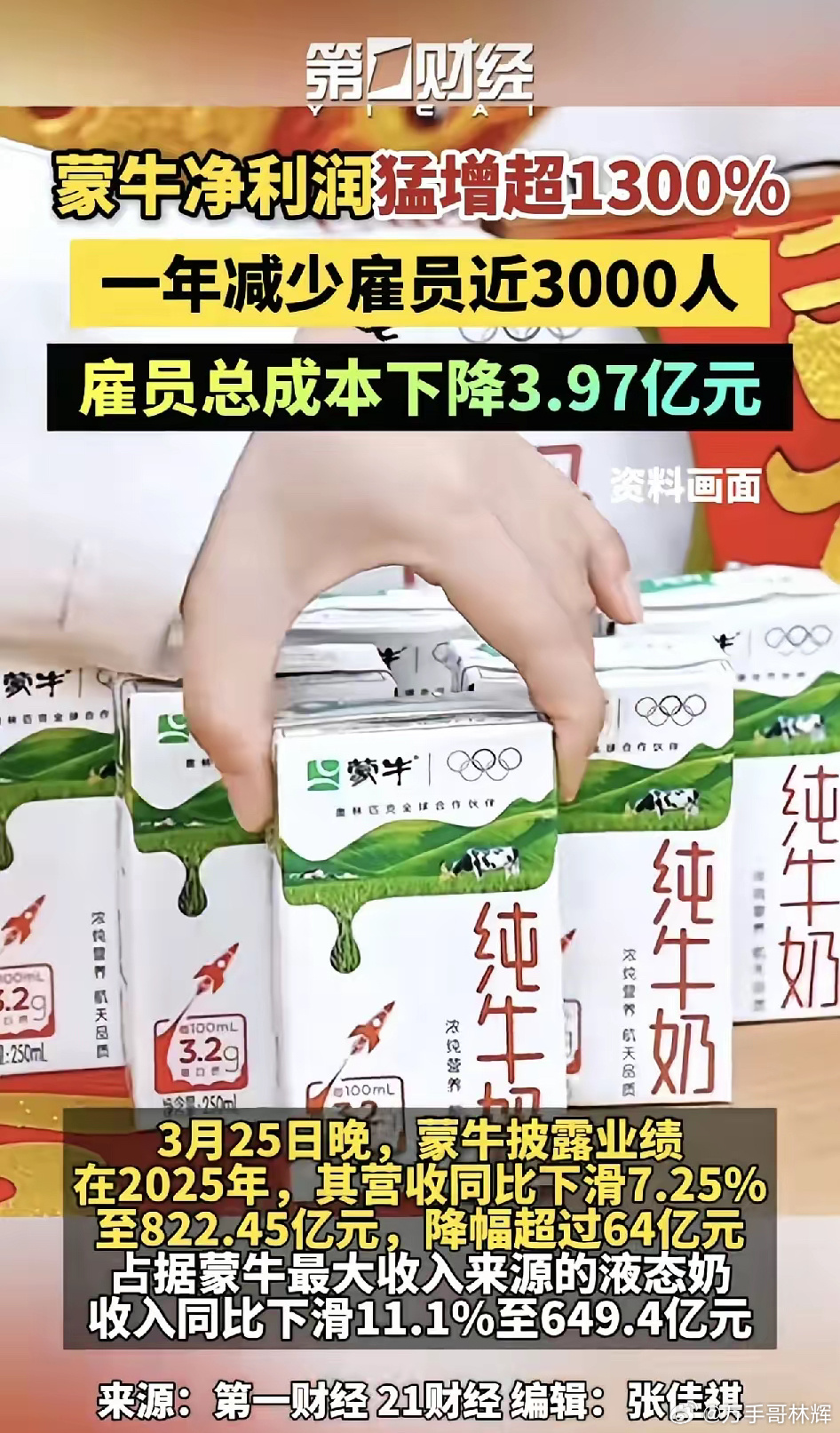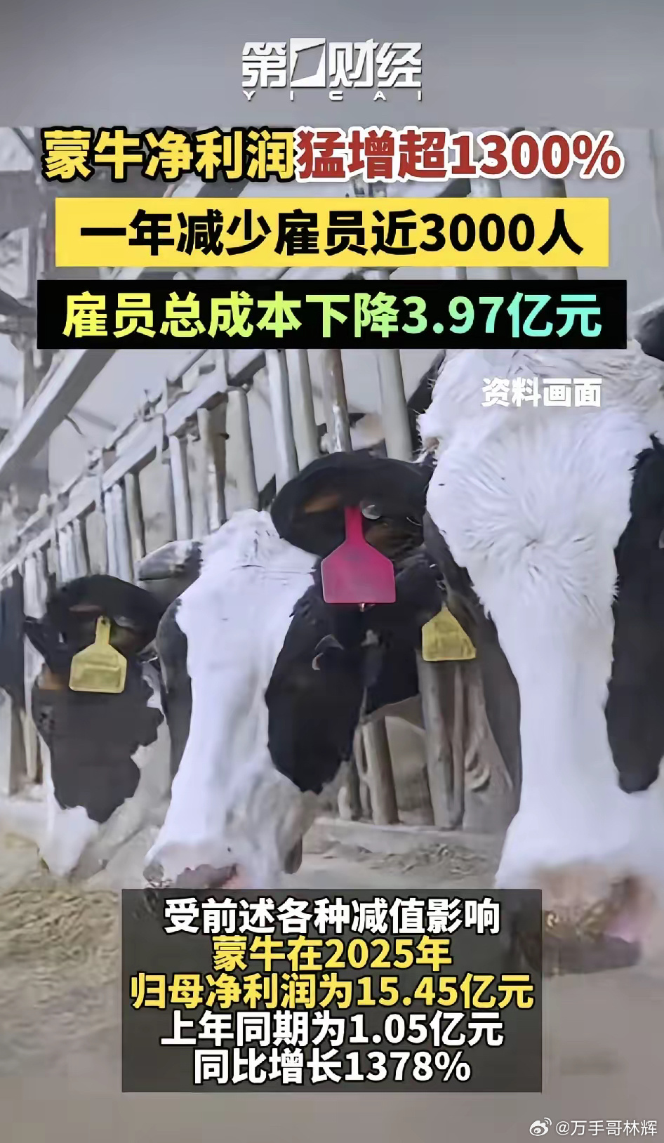 蒙牛净利润暴增1300%,一年减少雇员近3000人,雇选总成本下降3.97亿元! 蒙牛的这份这财报,把降本增效玩出了新花样。2025年末,蒙牛雇员只剩38000多人,对比2024年的41000+,一年时间少了近3000人。随之而来的是,雇员总成本直接下降3.97亿元,再加上全方位的成本控制,净利润直接猛增超1300%!我们来看:一边是利润飞涨,一边是人员缩减,数据折射的压缩人力成本,增长的是丰厚的利润。一些工序换成自动化,用机器人替代。人去哪里呢?尤可未知。所以说,制造业自动化是一种趋势,但普通人的就业出路在哪?这是非常考验当代管理者的智慧了。其实不止蒙牛,这两年不少快消、制造企业几乎朝着这条路走:用自动化设备替代人工,既能减少用工成本,又能提升生产效率。蒙牛的智能工厂里,机械臂精准码垛、流水线高速运转,肉眼可见的“无人化”,背后是无数岗位被机器取代。高度自动化是好事,但也别忽略那些被替代人群的感受,他们的温饱也需要妥善解决。