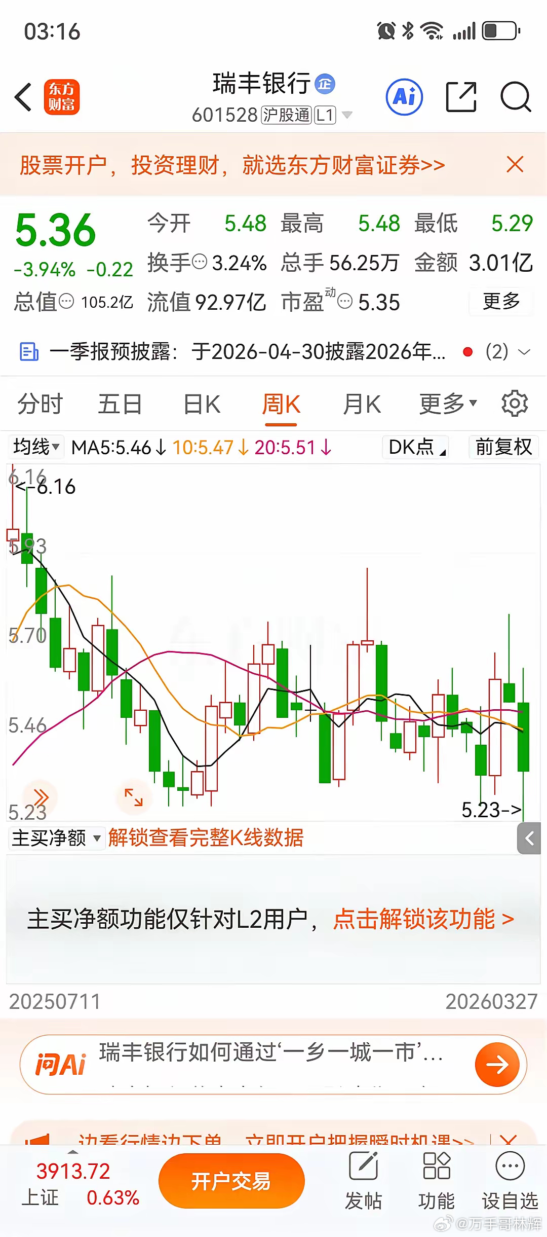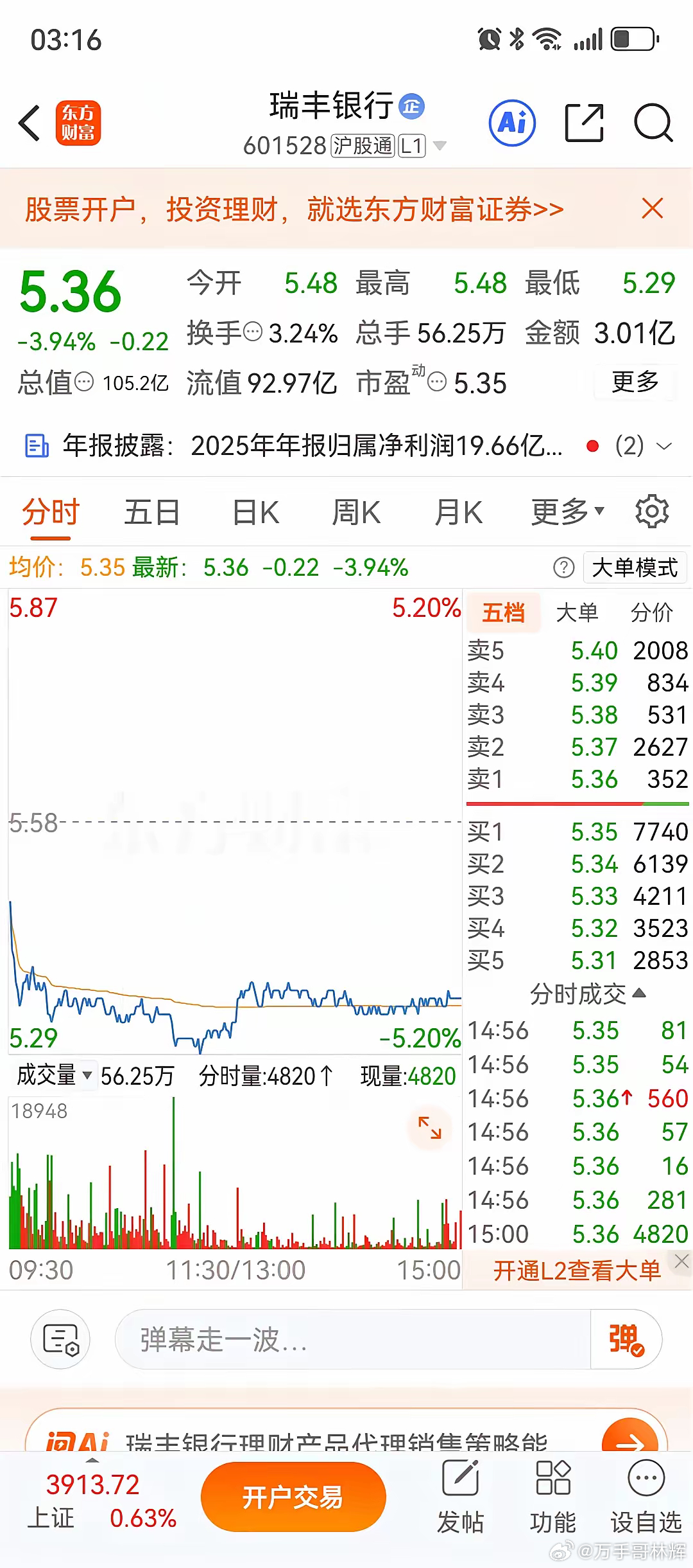 瑞丰银行年报,吓到你了吗?昨天晚上瑞丰银行发布了2025年度报告。营收同比增长0.53%。净利润同比增长2.30%。不良贷款率0.99%。仍处于较低位置。只是比去年同期上升了0.2个百分点。拨备覆盖率326.51%。比上年增加了5.64个百分点。这在当下已公布年度快报及年报的银行股中算非常好的了。这也是该行连续5年拨备覆盖率持续增加。拨备覆盖率由2020年的234.41%增加到2025年的326.51%。几乎是银行板块中的唯一。充分体现出该行经营的稳健性与持续性。每股分红0.21元。比上年增加一分。就这么一份,应该属良好的年度报告。今天开盘后股价却出现了较大幅度下跌。截至收盘下跌3.94%。有朋友收盘后调侃,分红2毛1。今天跌了2毛2。如果我们仔细了解该银行的状况。会发现很多亮点。在买卖的决策中可能就有不一样的选择。一是大股东出现了保险公司。第4季度一下跻身到第五名,持股占比4%。二是义乌悦城滨海,嵊州区域增量贡献持续释放。未来义乌的贡献不可小觑。三是业务规模稳步增长。各项存款增幅9.47%。贷款增加7.82%。四是国际业务呈现跨越式发展。该行国际业务有效客户数达2078户。结算量达96.31亿美元。同比增长49.41%。外汇衍生品业务加快拓展,签约规模达9.80亿美元。相关收入同比增长303%。该股2021年6月上市。发行价格8.12元。期间10送3股。不算现金分红,现在仍处于破发。该股原始股东,多为当地小企业及个体经营者。当时买入很便宜,现在到了可以卖的阶段。由于他们经营赚钱能力强,对股票分红感受度不高。现正处于逐步退出阶段。已有保险公司入驻。预计未来逐步会吸引更多机构入驻。